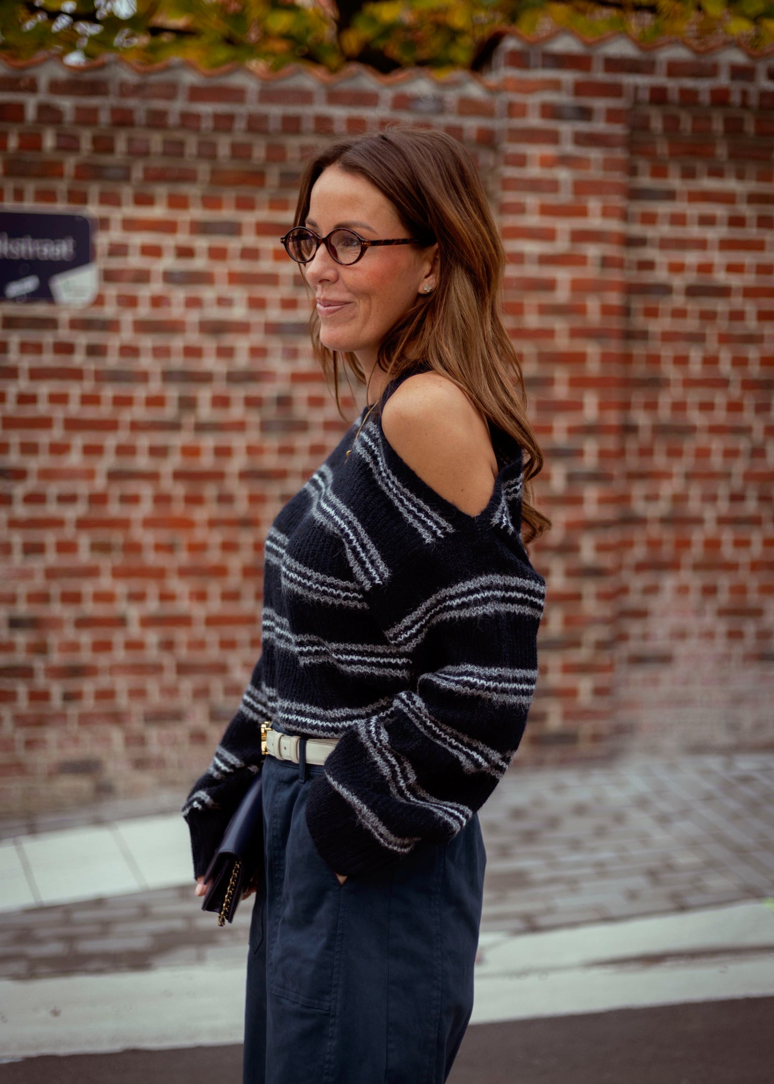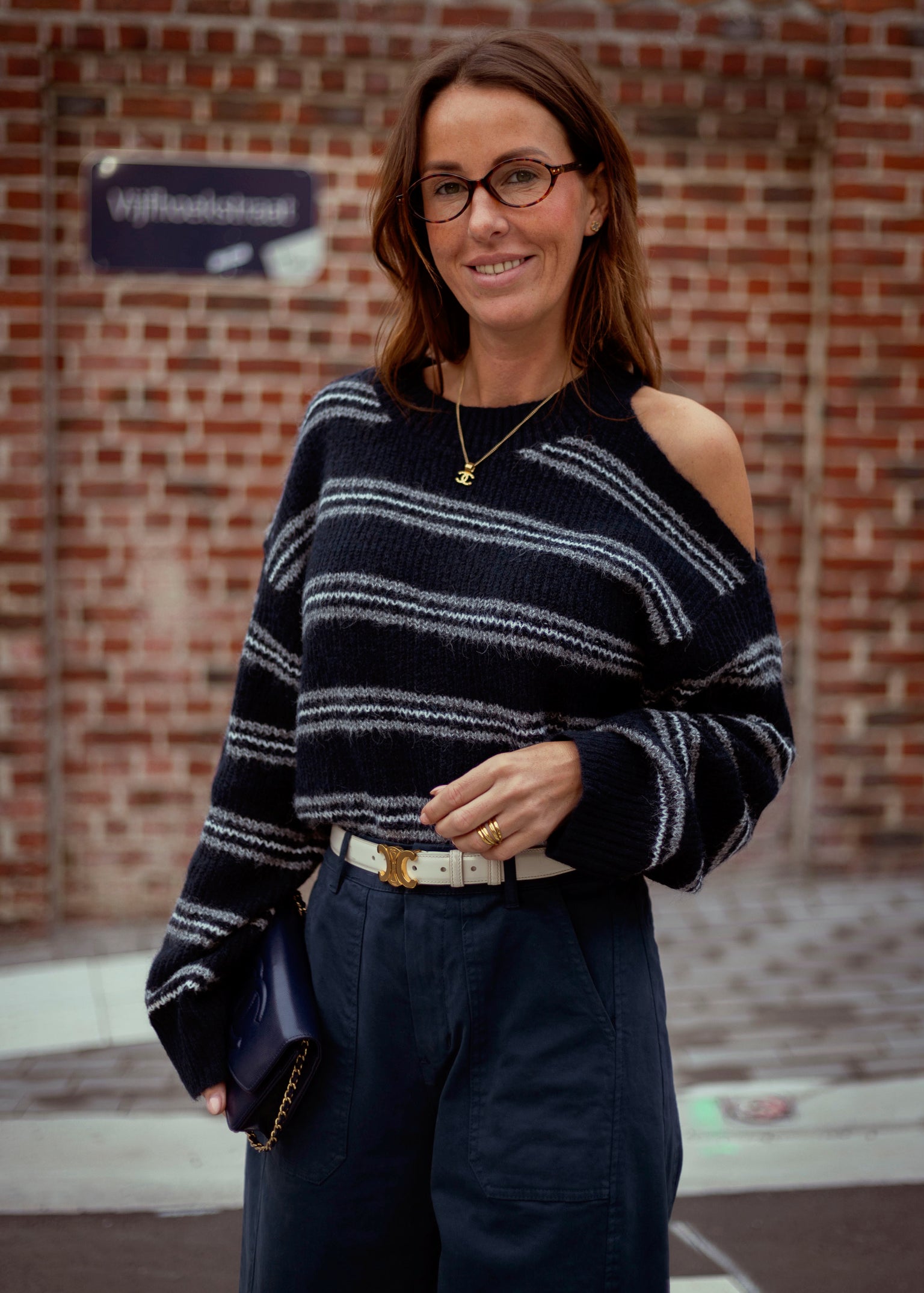 AISLING DARK BLUE STRIPED CUT-OUT SWEATER