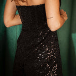 Een sprankelende verschijning die direct de kerstsfeer vangt. De strapless snit laat de schouders elegant uitkomen terwijl de glinsterende pailletten elke beweging vieren. Perfect voor feestavonden vol glitter!