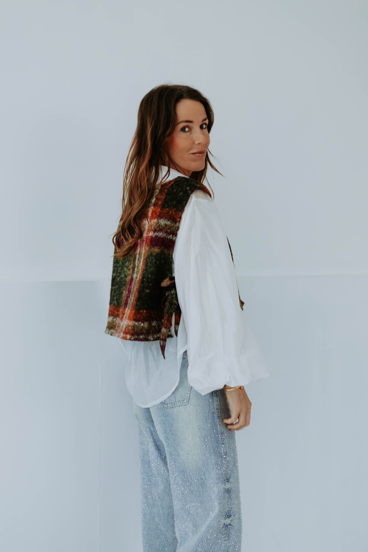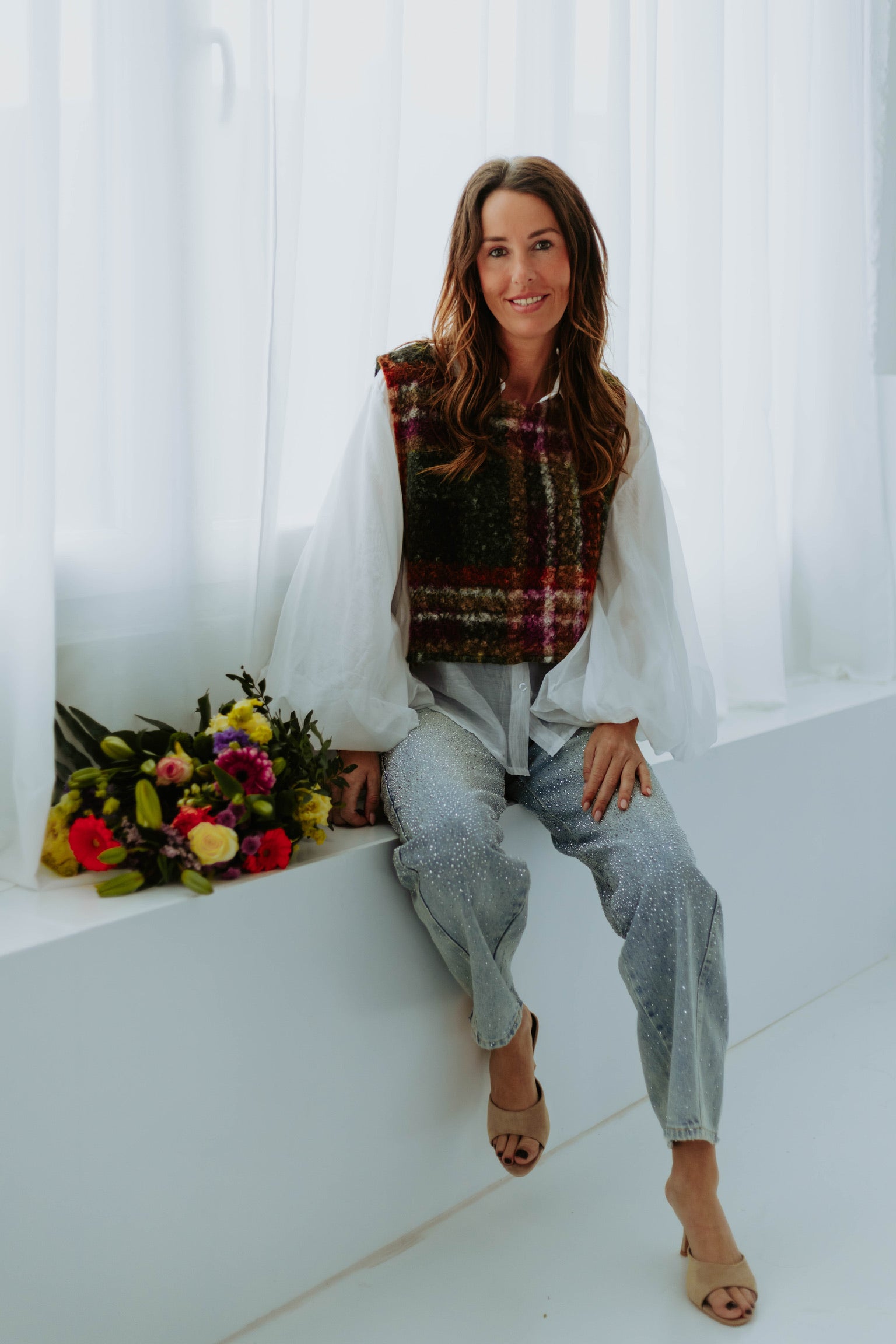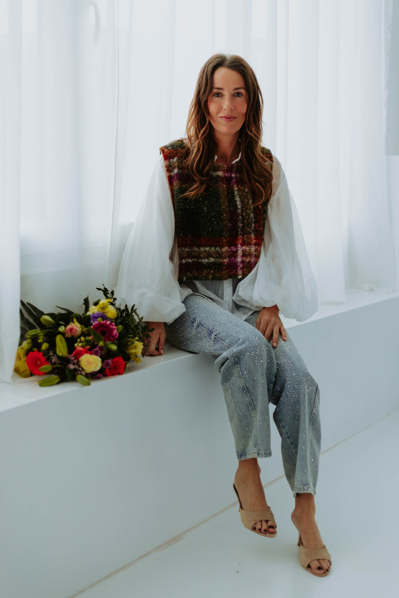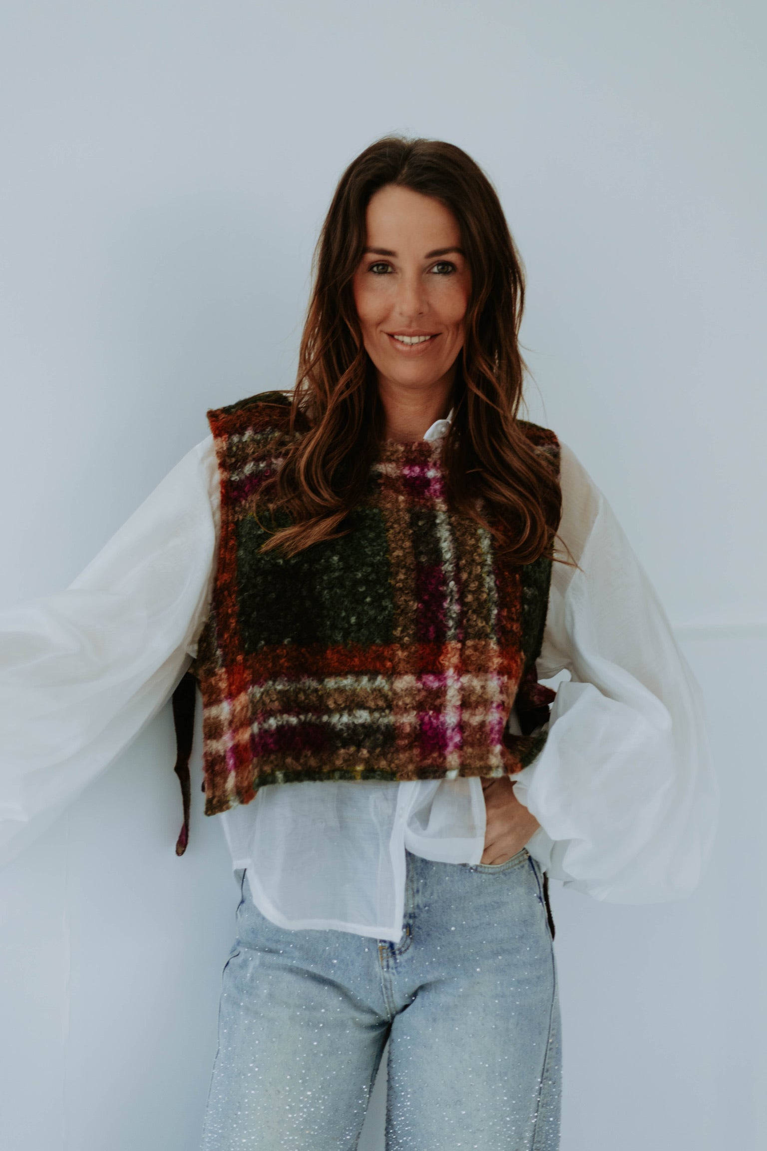De donkergroene basis met warme roze, gele en oranje accenten geeft een speels en vrolijk lentegevoel. De zachte stof voelt heerlijk comfortabel en het mouwloze model maakt het ideaal om over een blouse met wijde mouwen te dragen. Zo ontstaat een gelaagde look die moeiteloos stijlvol en levendig aanvoelt.