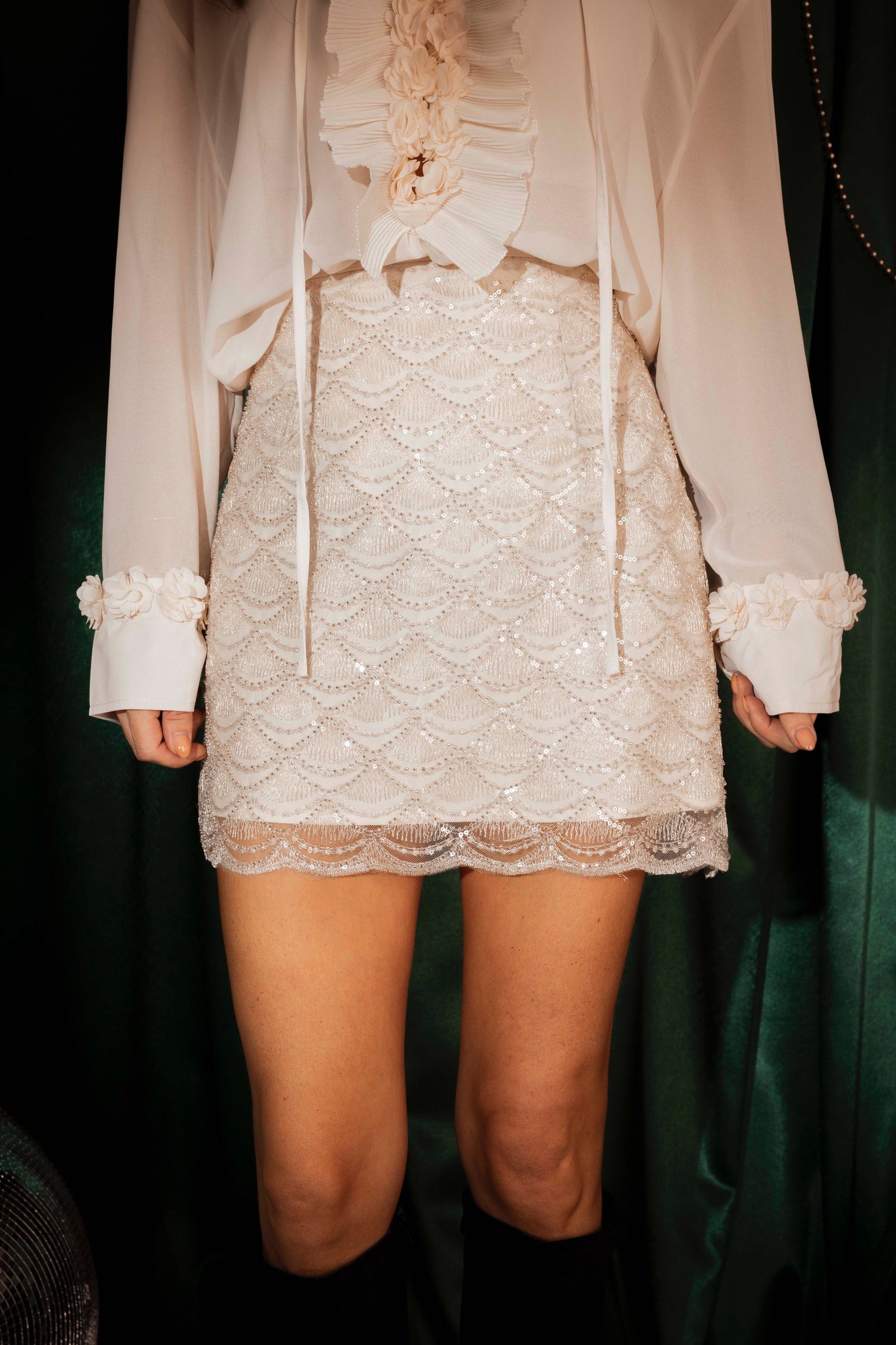 Een fonkelende ecru glans die meteen de magie van de feestdagen oproept. De zachte plissé beweegt elegant bij elke stap en geeft een luchtige, feestelijke uitstraling. Perfect om te combineren met een leuke blouse voor een sprankelende winterlook.