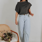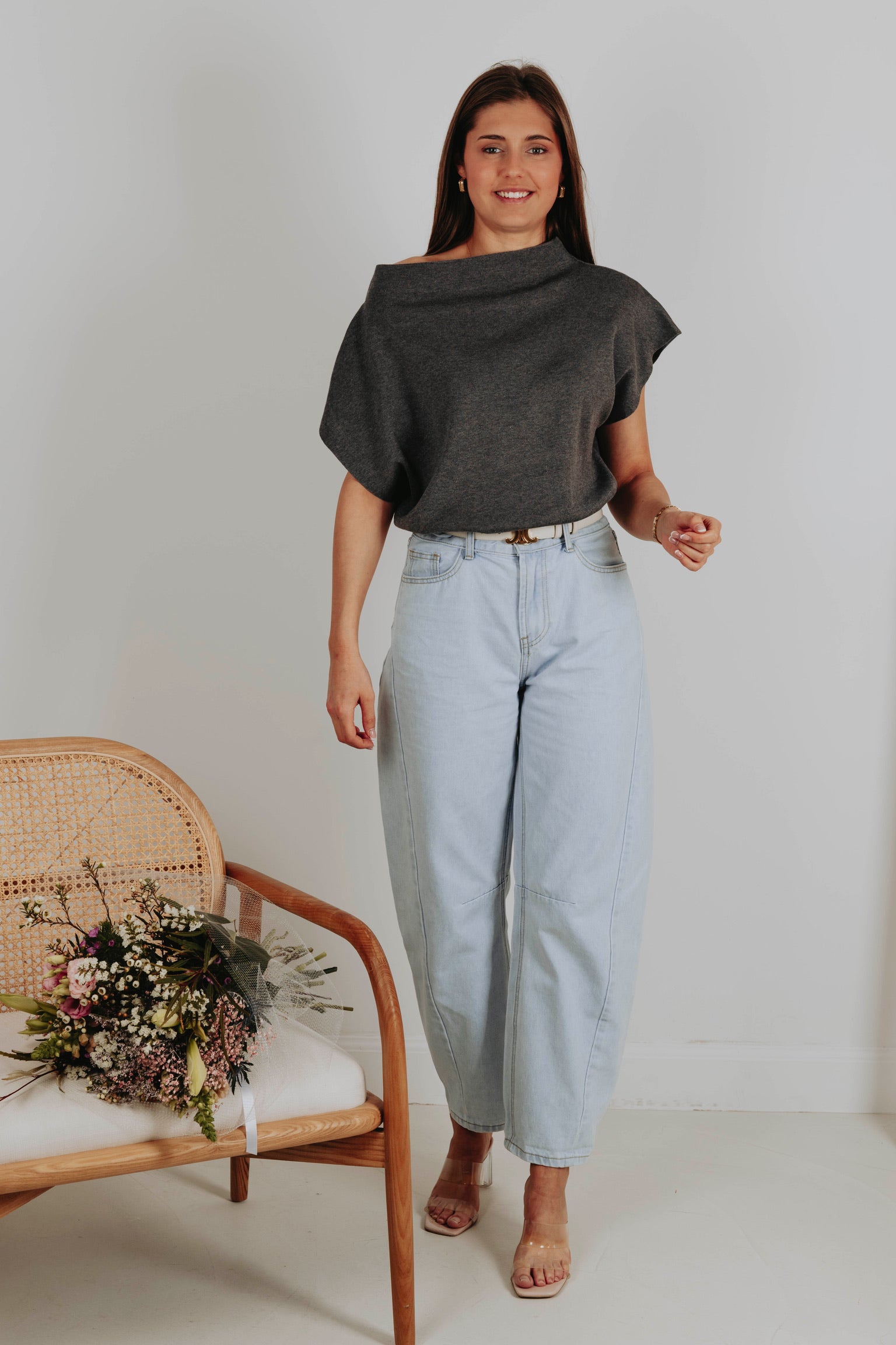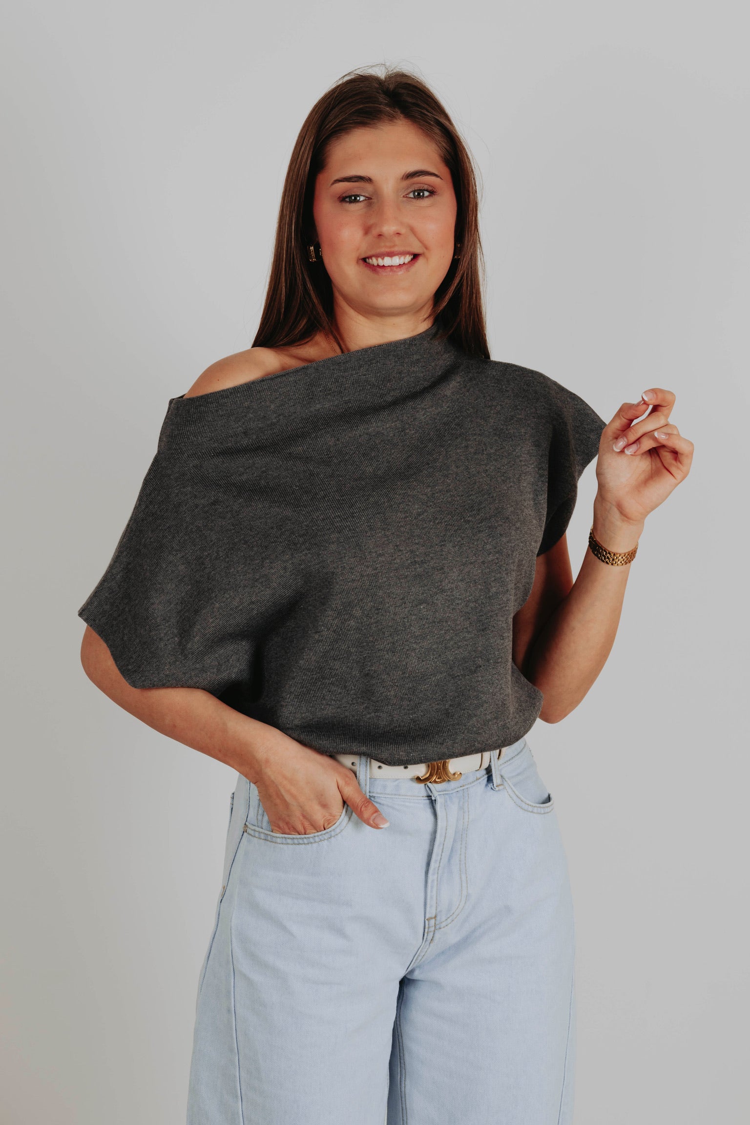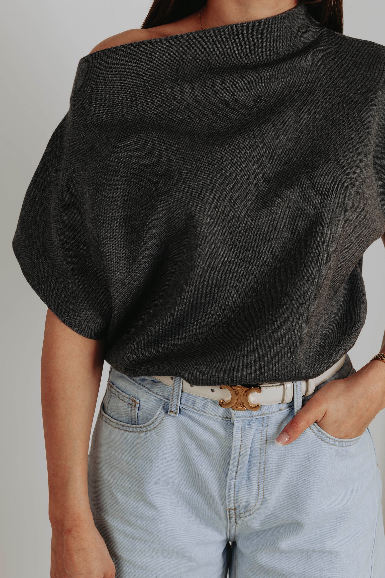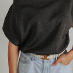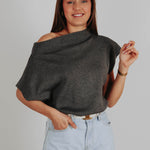 Een zachte knit in donkergrijs met korte mouwen en een speelse fit die je moeiteloos een beetje schuin draagt. De nonchalante snit geeft een moderne, frisse uitstraling en maakt het perfect voor een relaxte maar stijlvolle voorjaarslook.