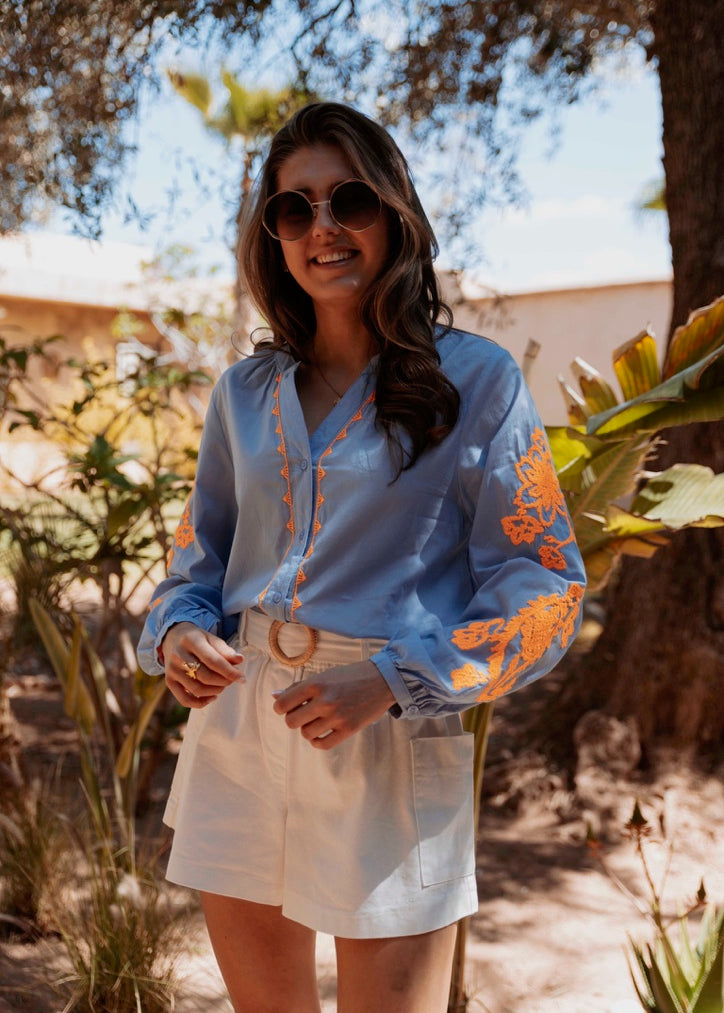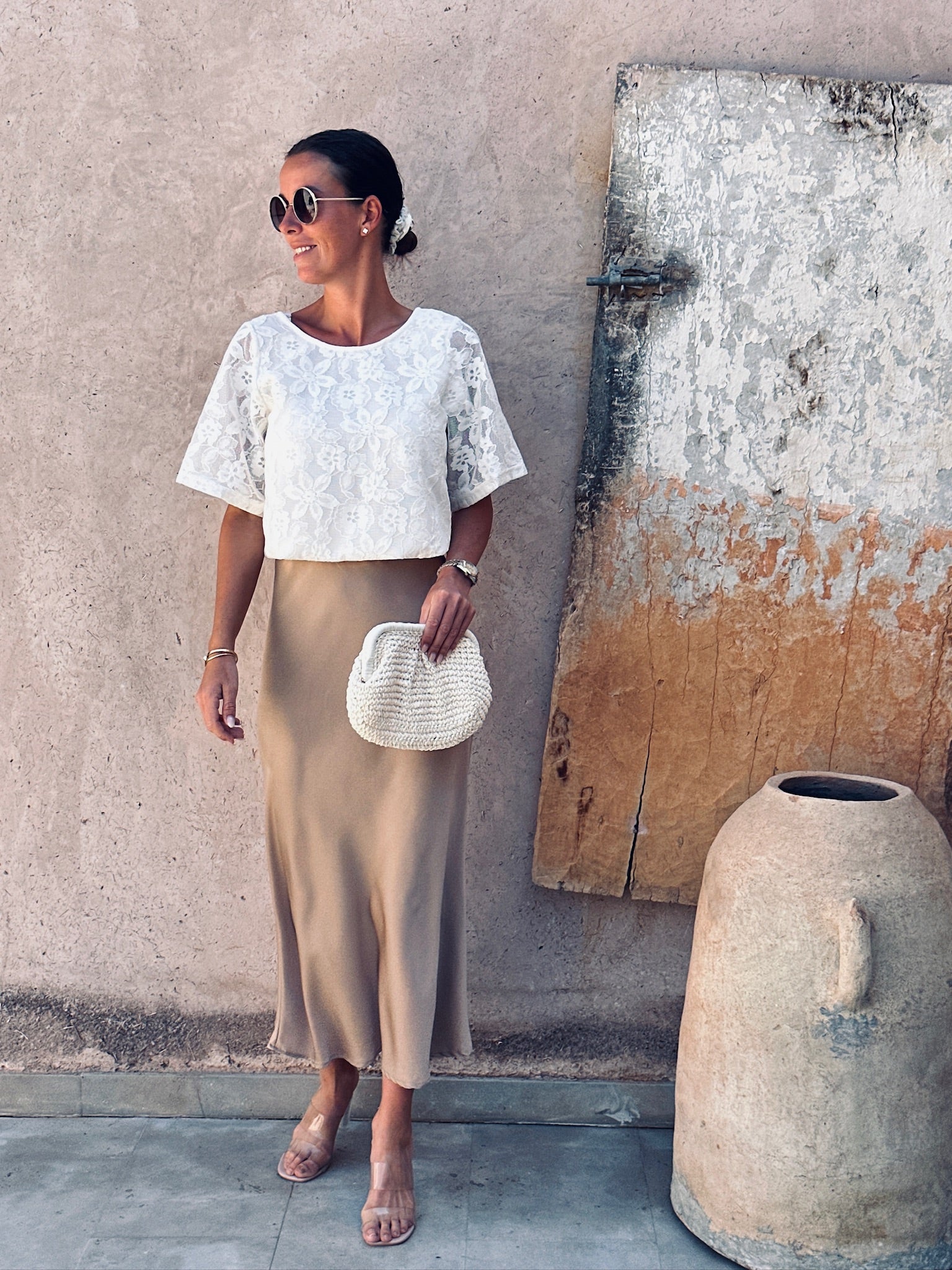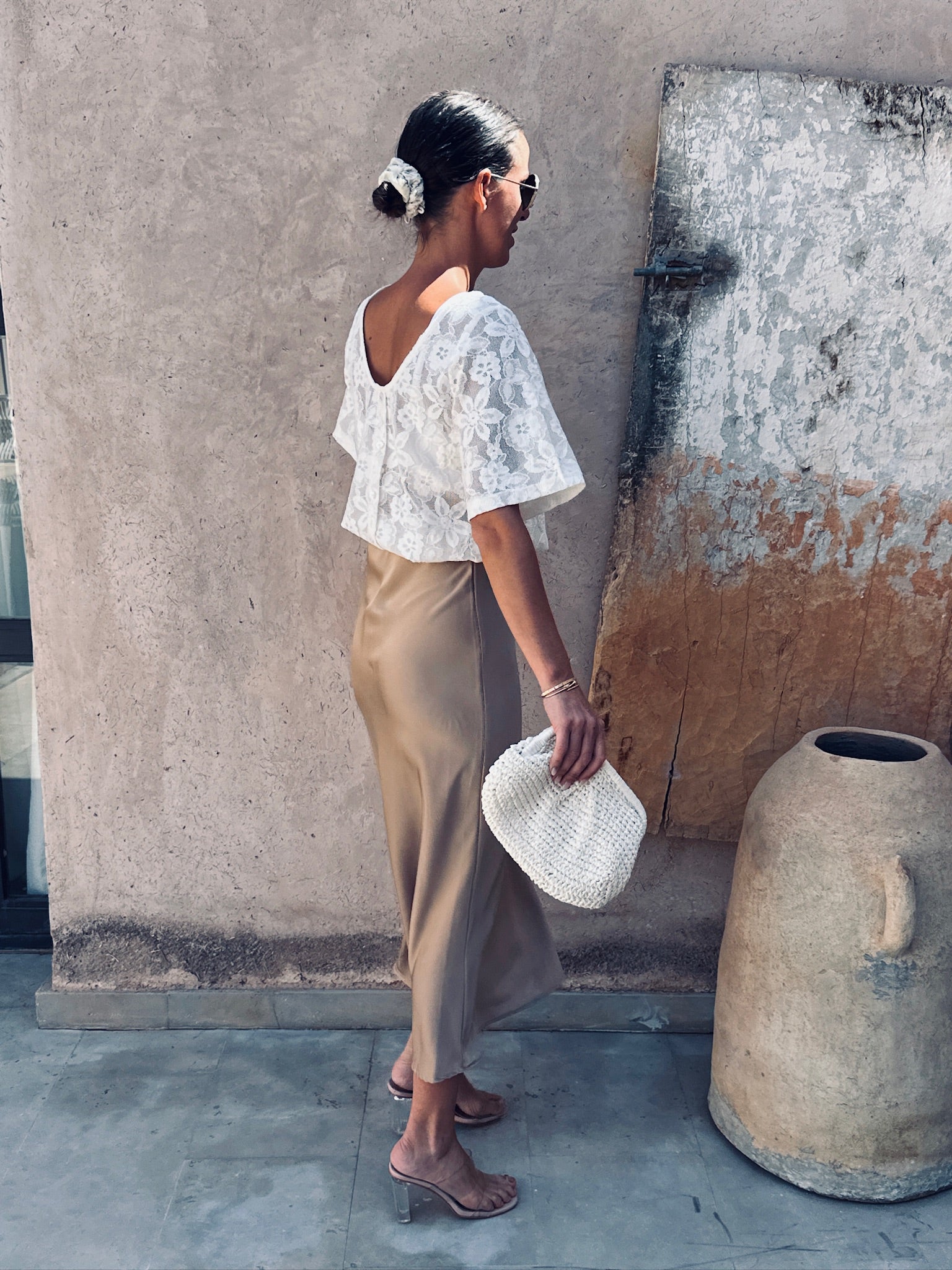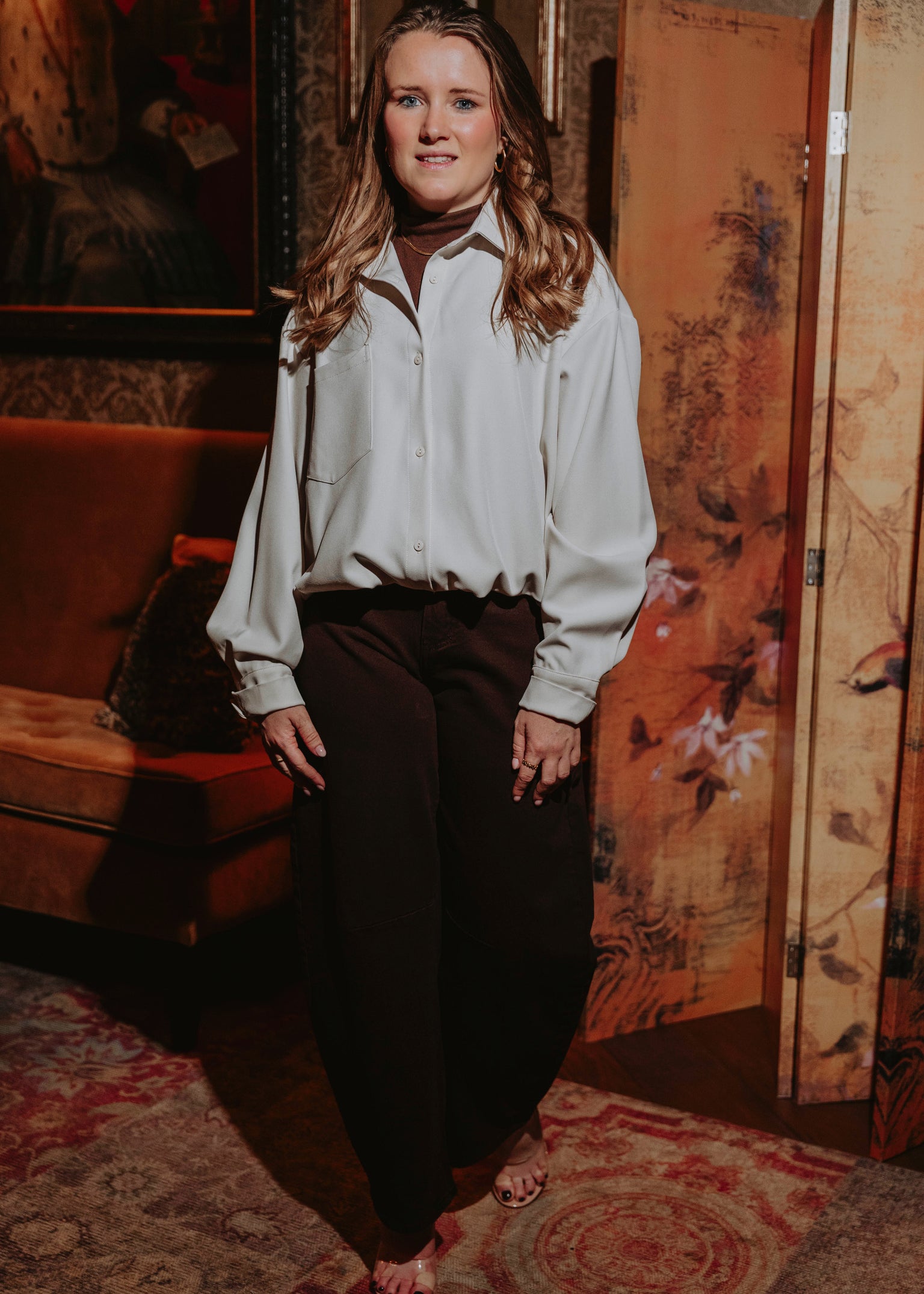 AFTERGLOW BROWN SATIN SEQUIN BLOUSE