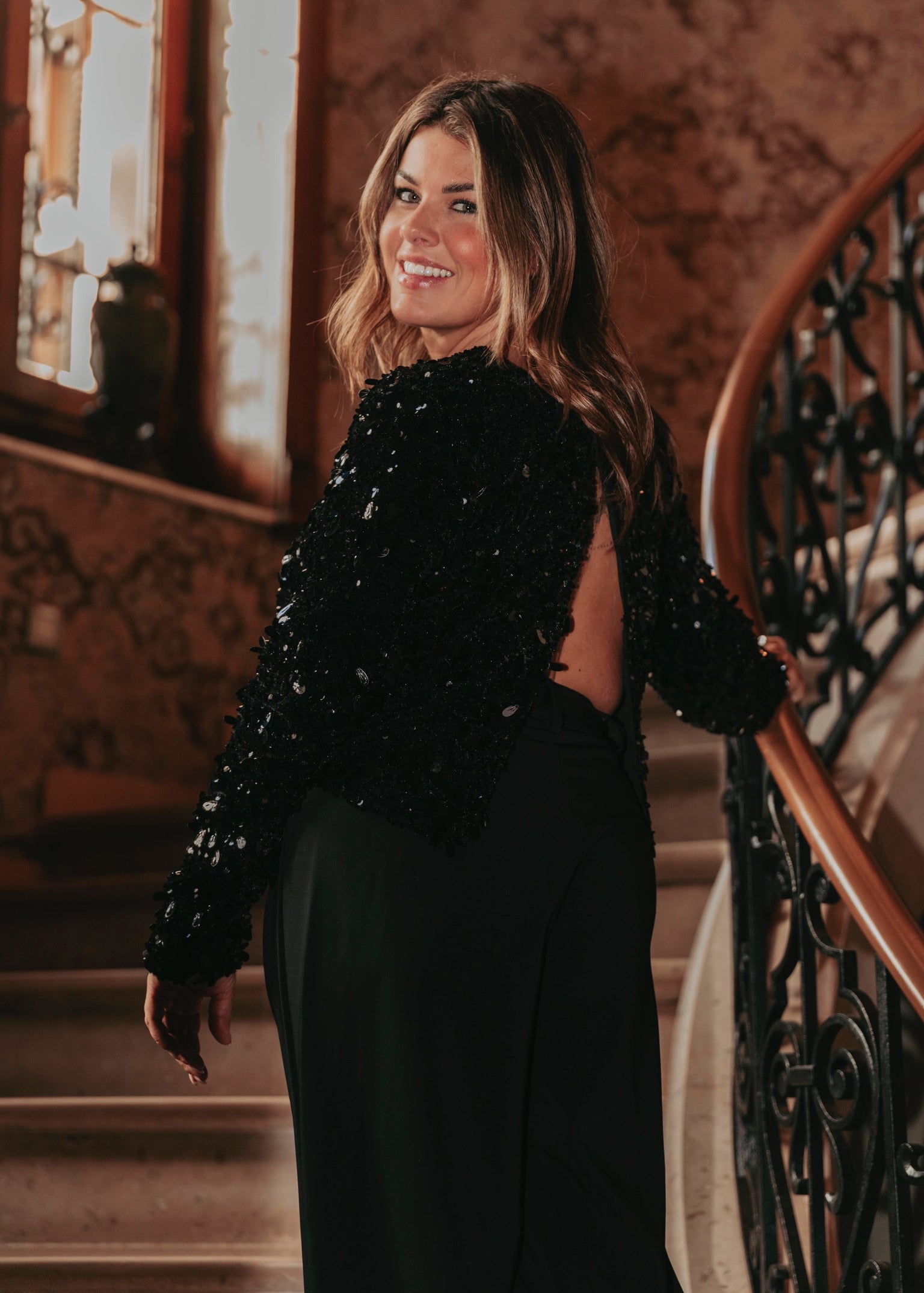 DANCING QUEEN BLACK SEQUIN OPEN BACK BLOUSE