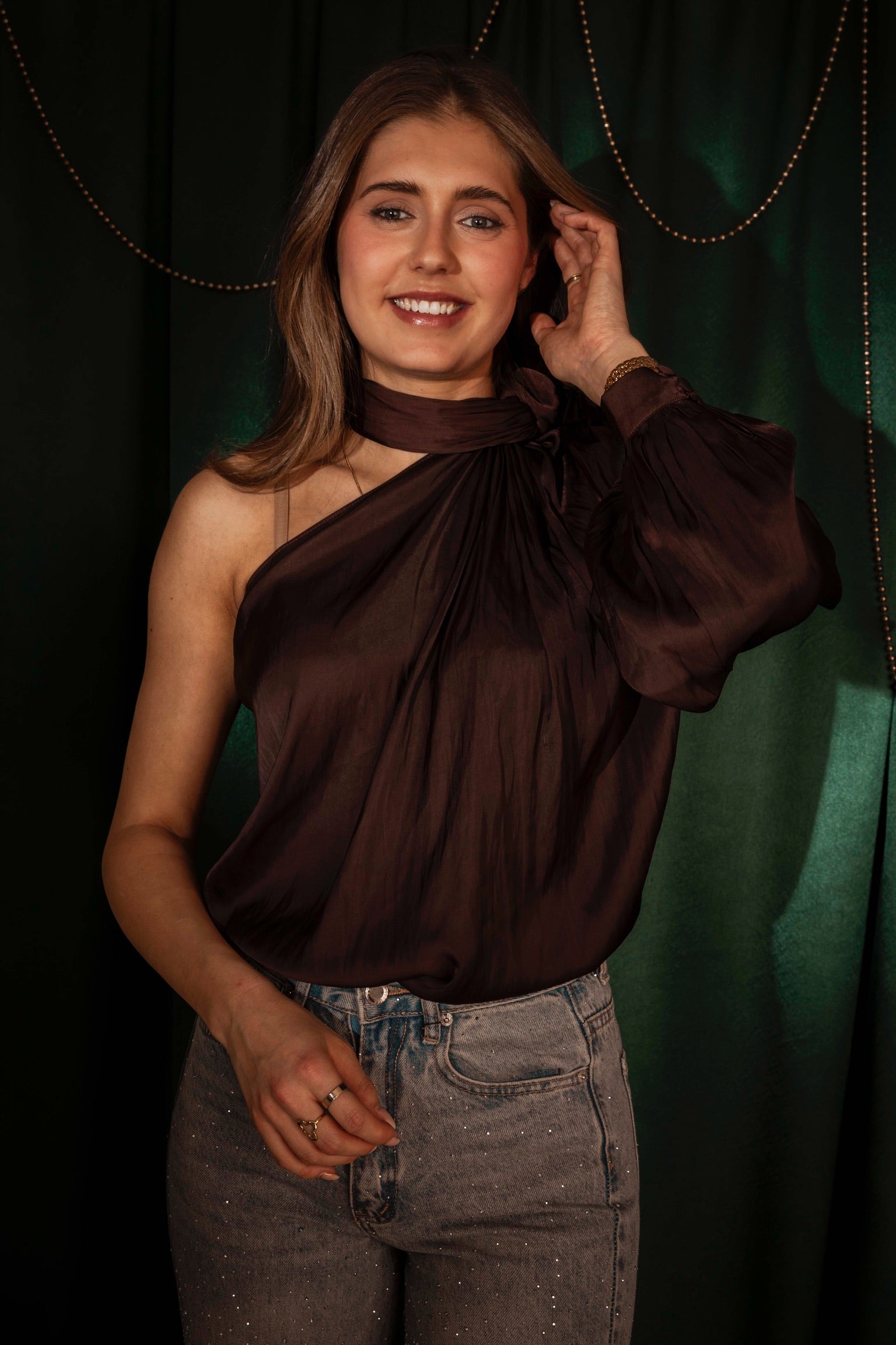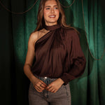 CANDLELIGHT BROWN SATIN ONE SHOULDER BLOUSE