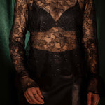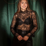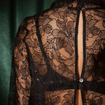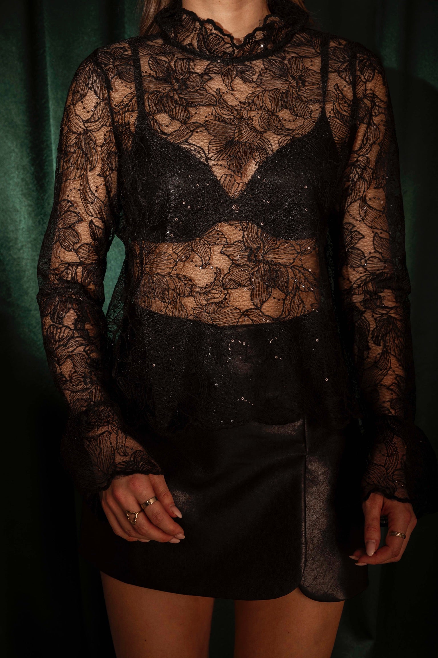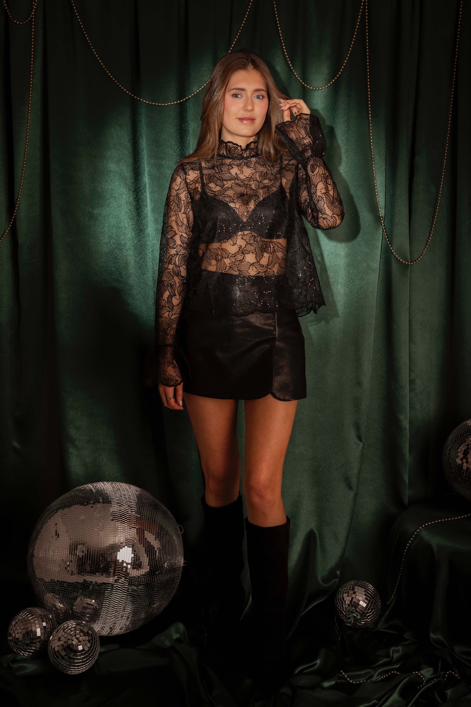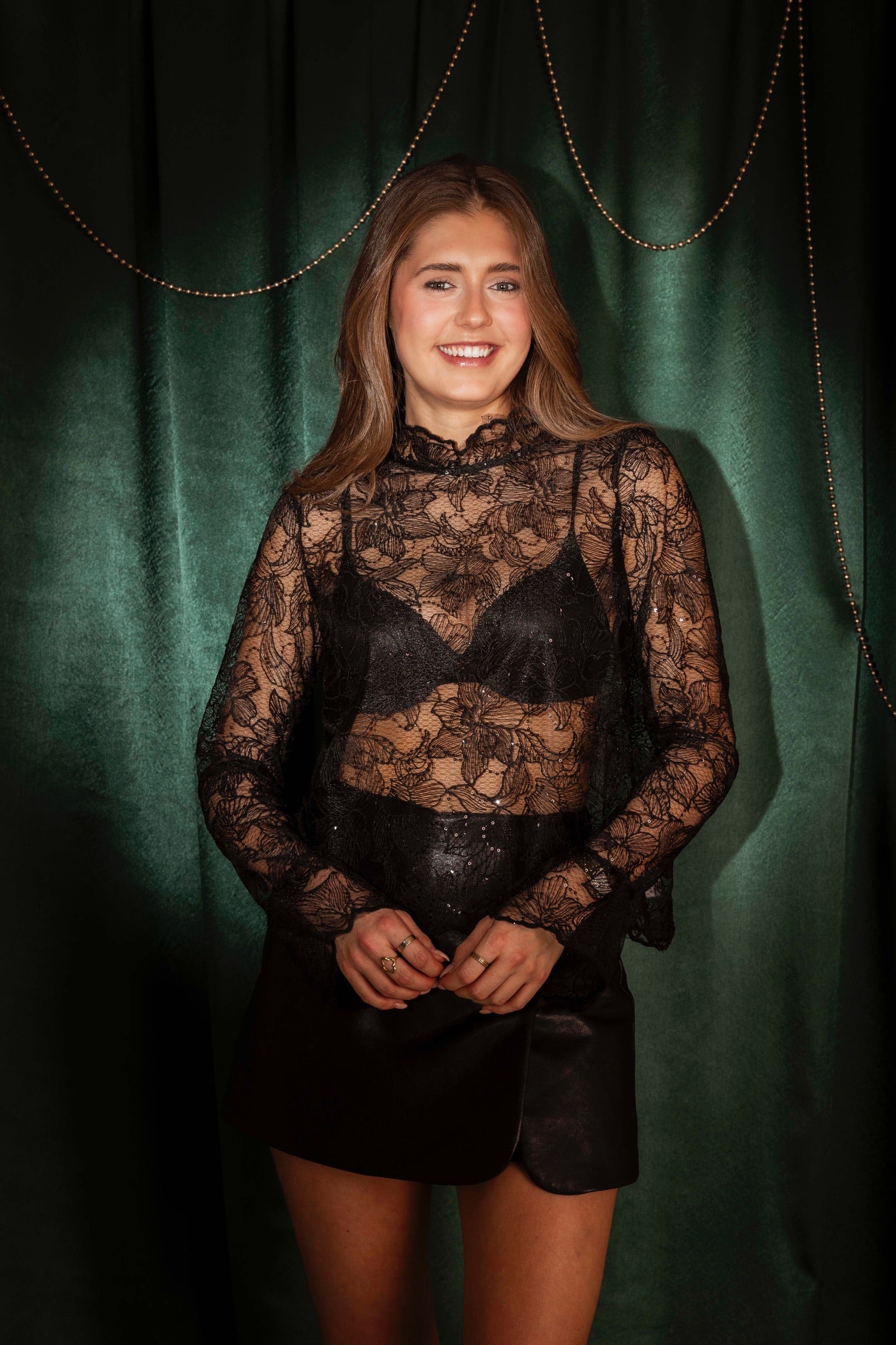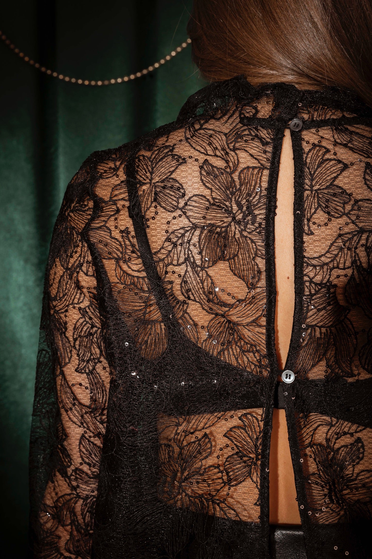Deze blouse combineert een zwarte tint met delicate kantdetails die zorgen voor een subtiele, feestelijke flair. Een stijlvolle keuze voor avonden waarop je elegantie en een zachte, verfijnde touch wilt uitstralen.