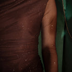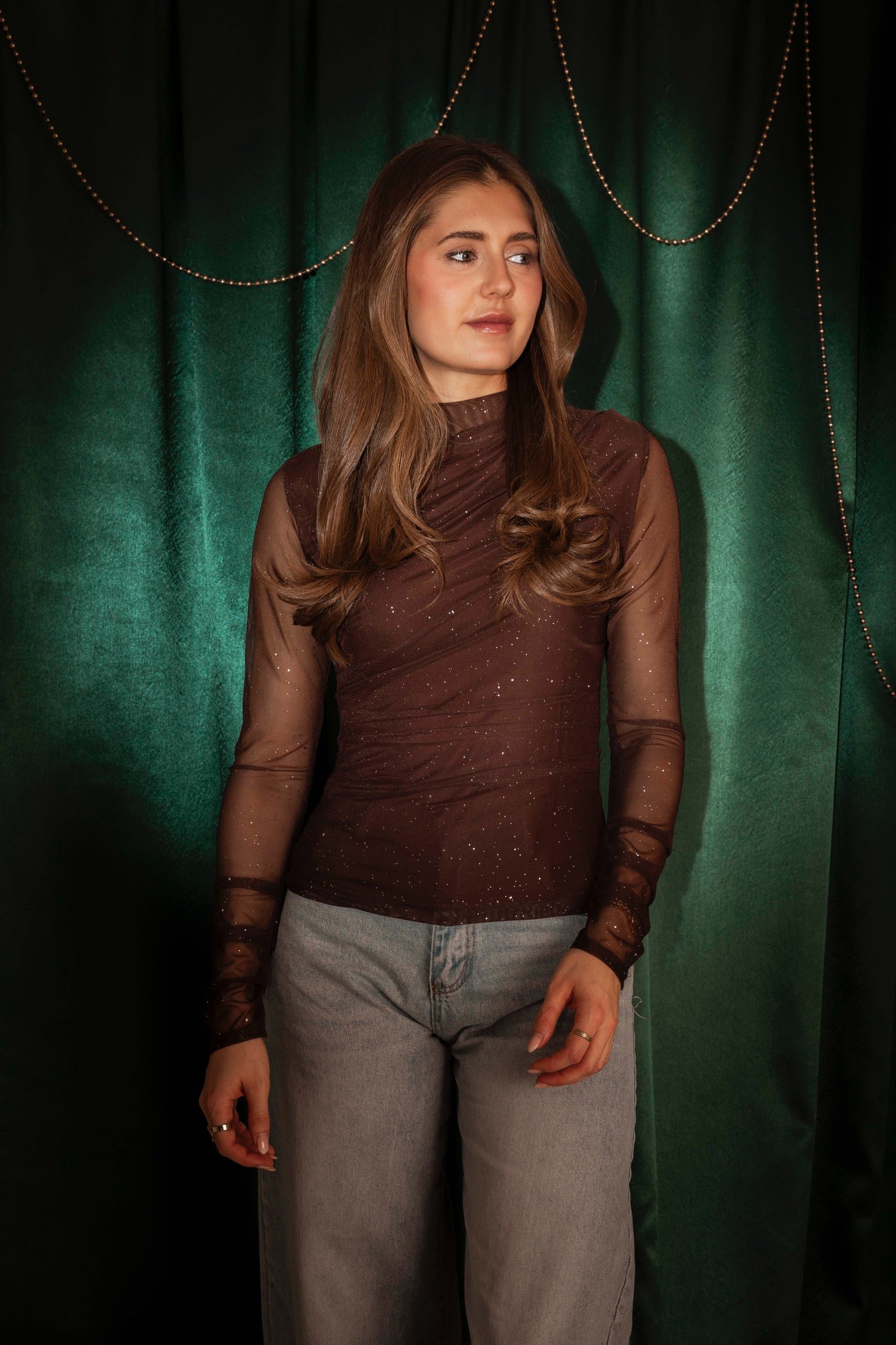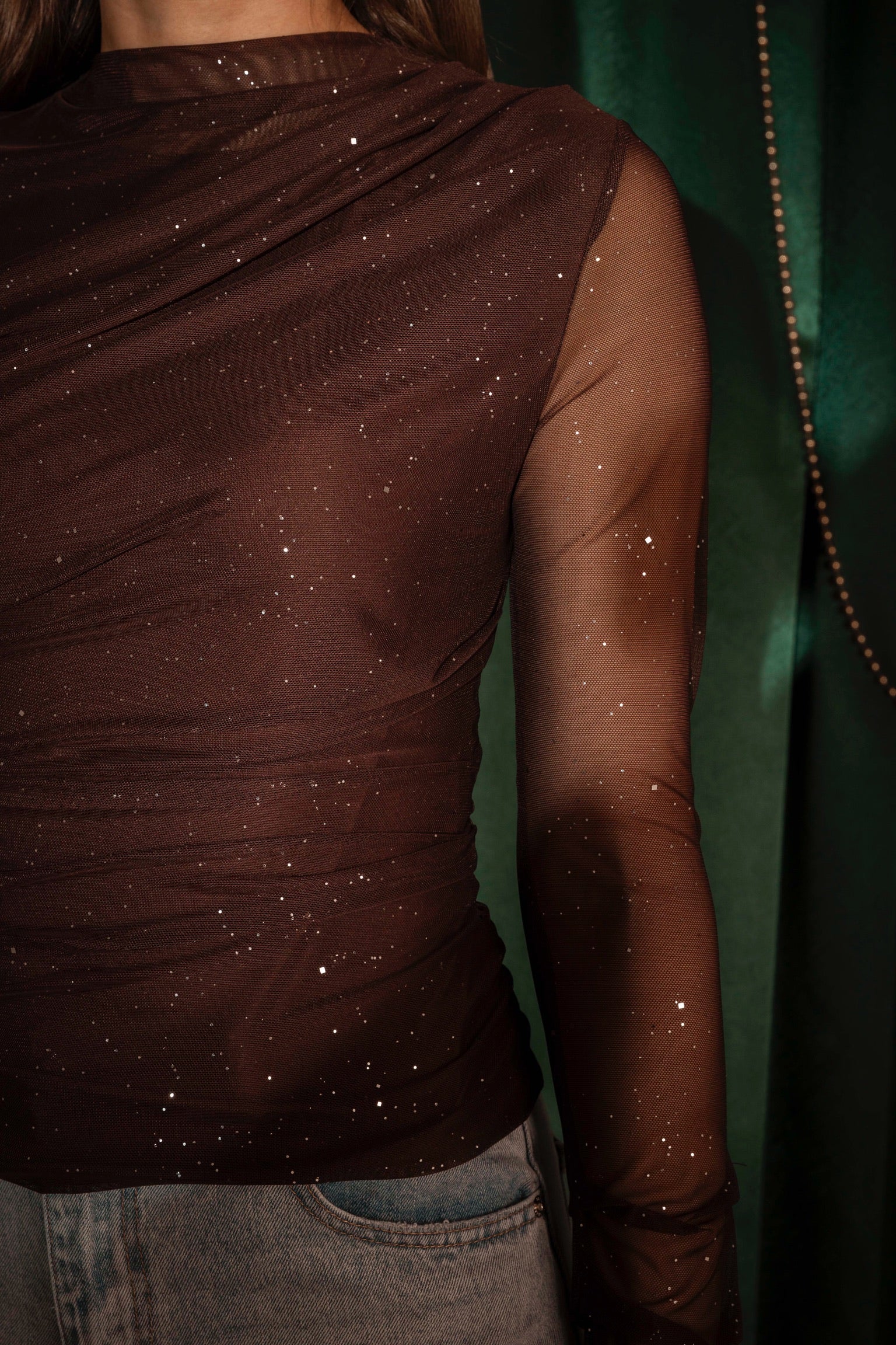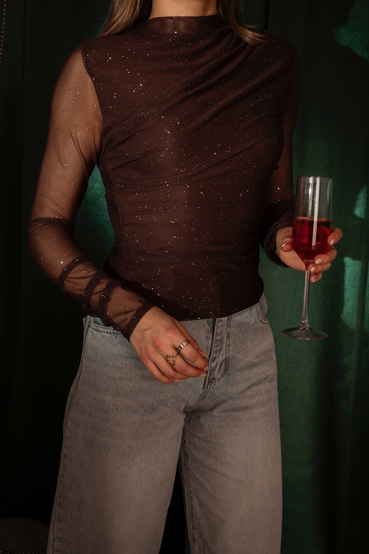 Een fonkelende verschijning die meteen feestelijke energie uitstraalt. De doorzichtige mouwen zorgen voor een subtiel speels effect terwijl de steentjes elke beweging laten schitteren. Perfect voor kerst, oudjaar of elke sprankelende winteravond.