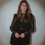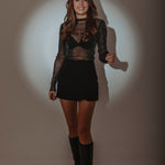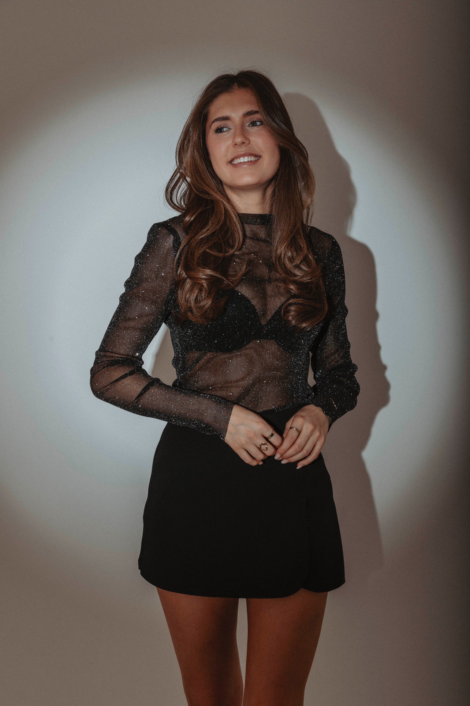 Een verfijnde glans die direct de feestelijke vibe oproept. De doorzichtige lange mouwen geven een subtiel speels effect terwijl de fonkelende steentjes elke beweging laten stralen.