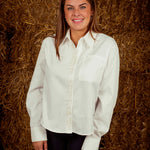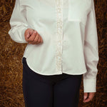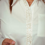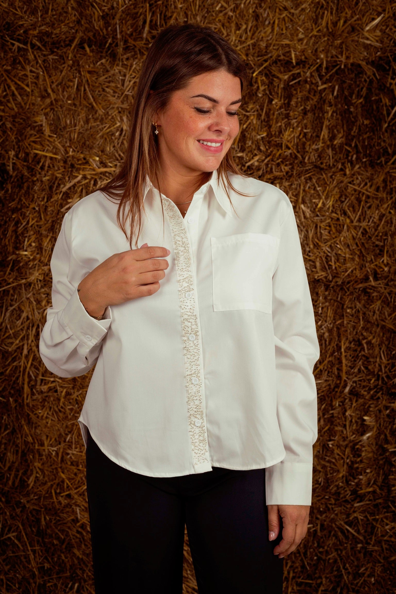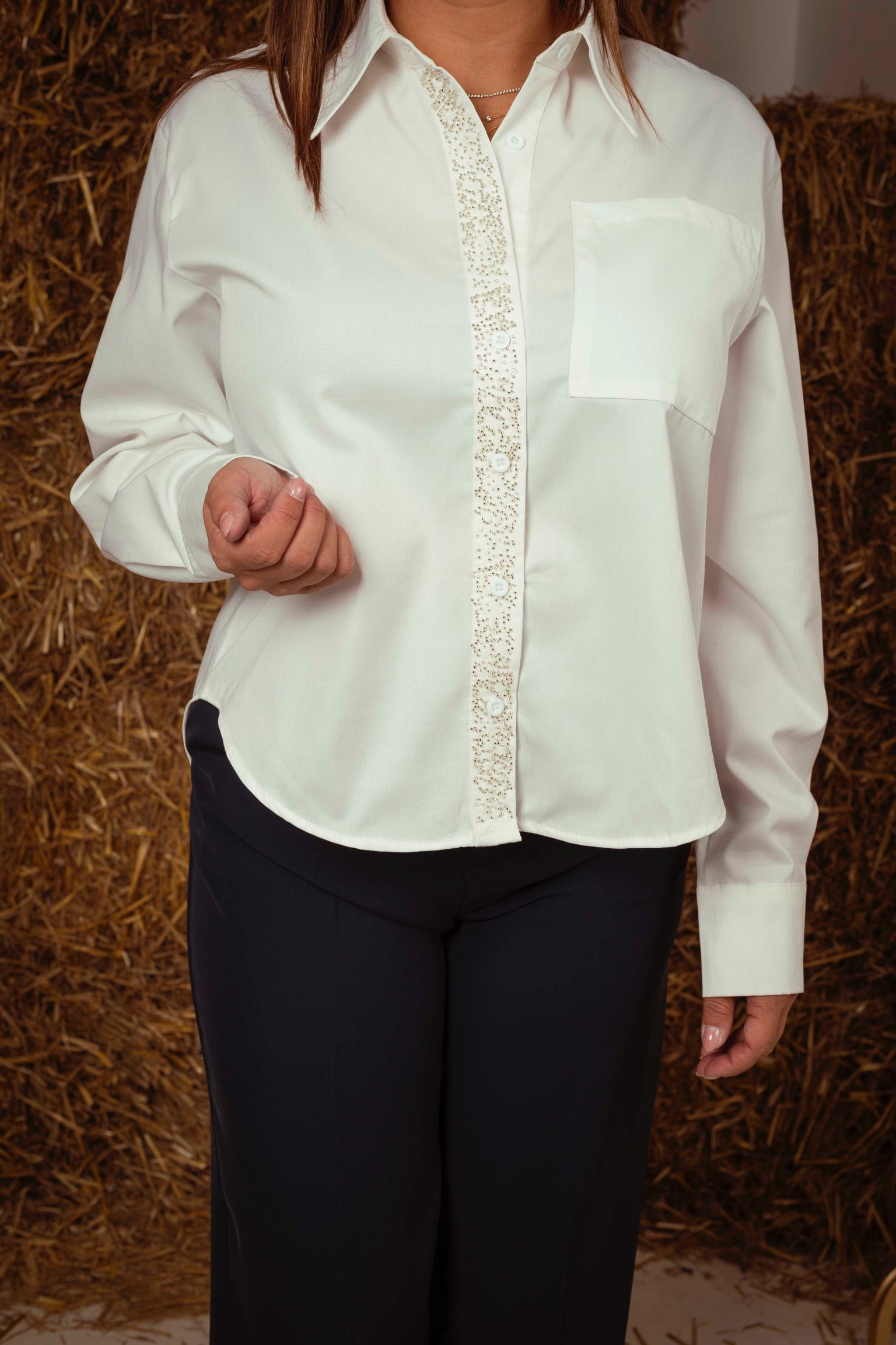 Luchtige elegantie met een speels accent, ideaal voor een herfstdag waarop het licht zachtjes weerkaatst. De borstzak voegt een nonchalant detail toe, terwijl de subtiele glitter bij de knoopjes zorgt voor een verfijnde glans bij elke beweging.