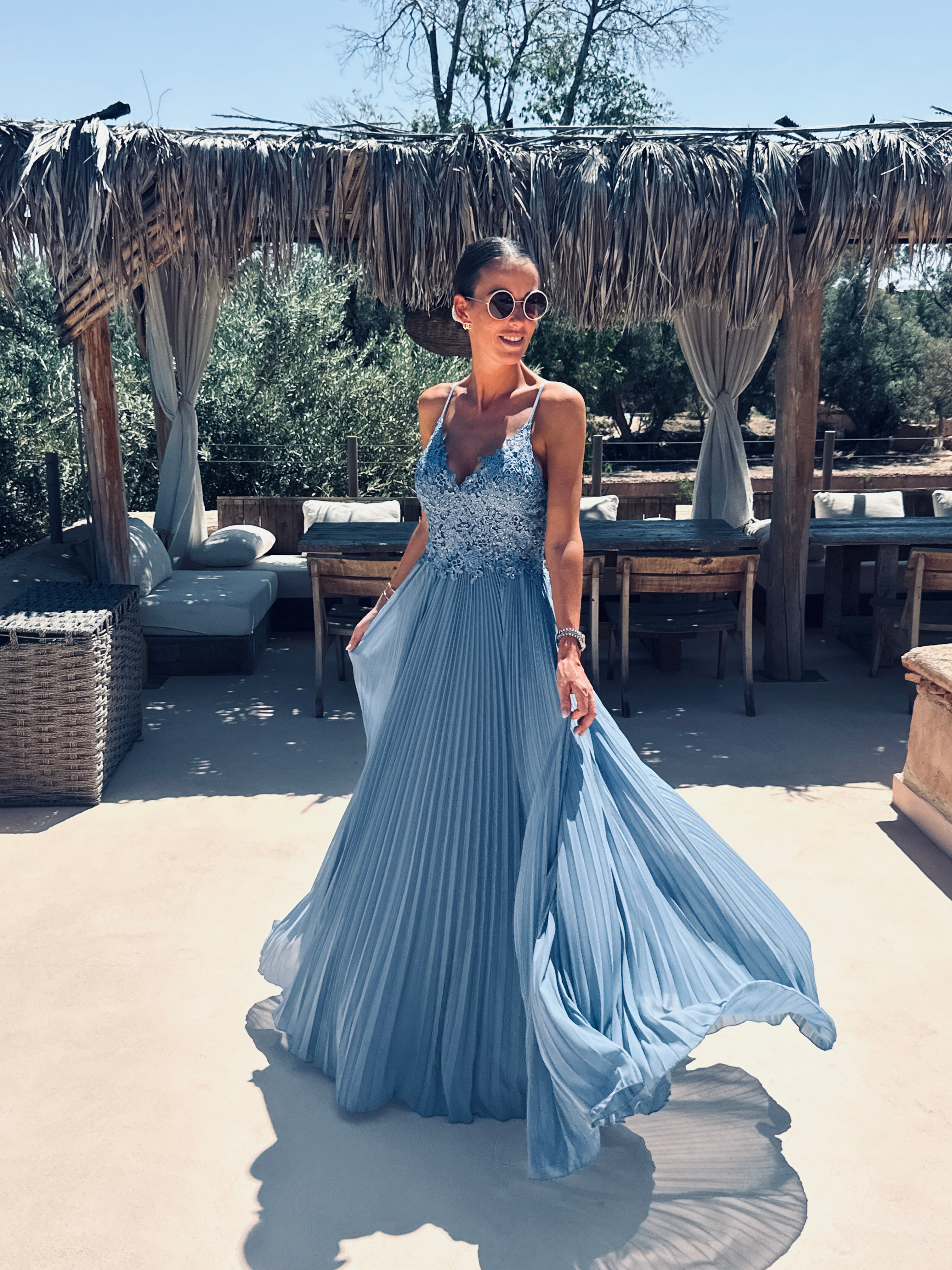 STEPHIE BLUE EMBROIDERED PLISSÉ DRESS