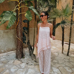 Luchtig en elegant met een speelse twist. Het bovenste deel is gevoerd als een short, terwijl de rest verfijnd doorschijnt voor een stijlvolle, zomerse look. Perfect te combineren met het bijpassende topje of gewoon op zichzelf voor een relaxte, vakantie-achtige outfit.