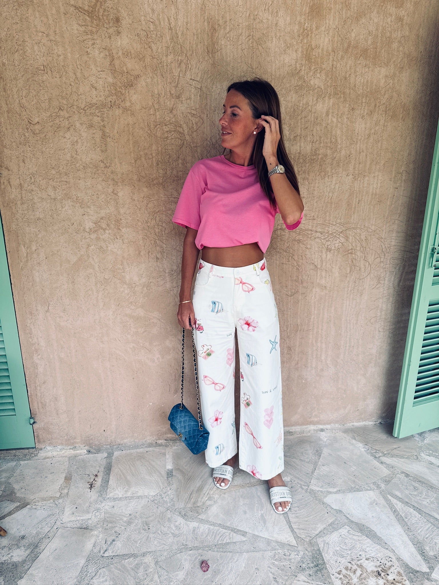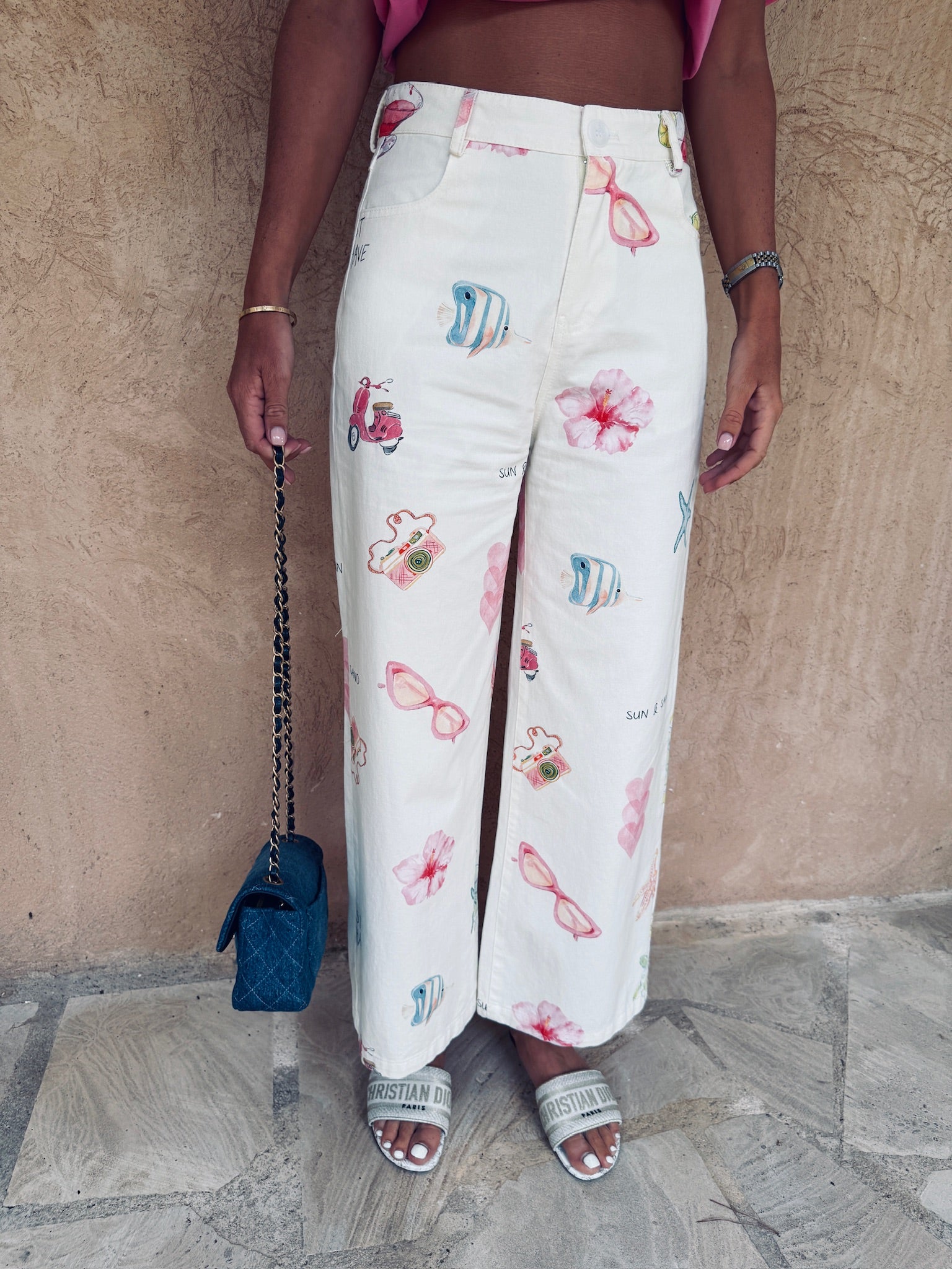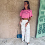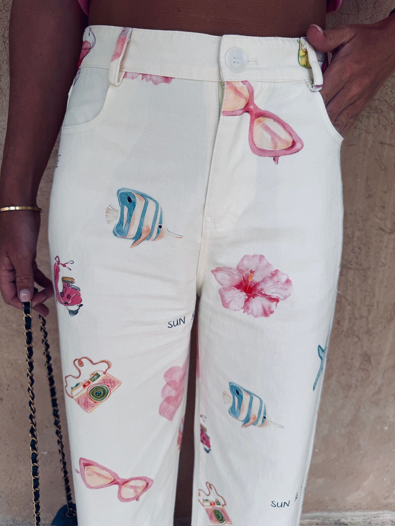 Een luchtige zomerbroek vol speelse prints zoals vissen, bloemen, zonnebrillen en camera’s – klaar voor elk avontuur. Ideaal om die relaxte holiday vibe mee uit te stralen, waar je ook bent. Girls just wanna have sun!