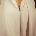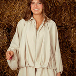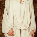 Een casual tweedelig setje met een losvallende blouse voorzien van een rits en een bijpassende puffy short, beide in comfortabele, zachte stoffen. Samen vormen ze een frisse, ontspannen look die makkelijk draagt tijdens de koelere herfstdagen.