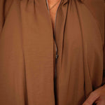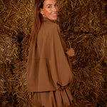 Een casual tweedelig setje met een losvallende blouse voorzien van een rits en een bijpassende puffy short, beide in comfortabele, zachte stoffen. Samen vormen ze een frisse, ontspannen look die makkelijk draagt tijdens de koelere herfstdagen.