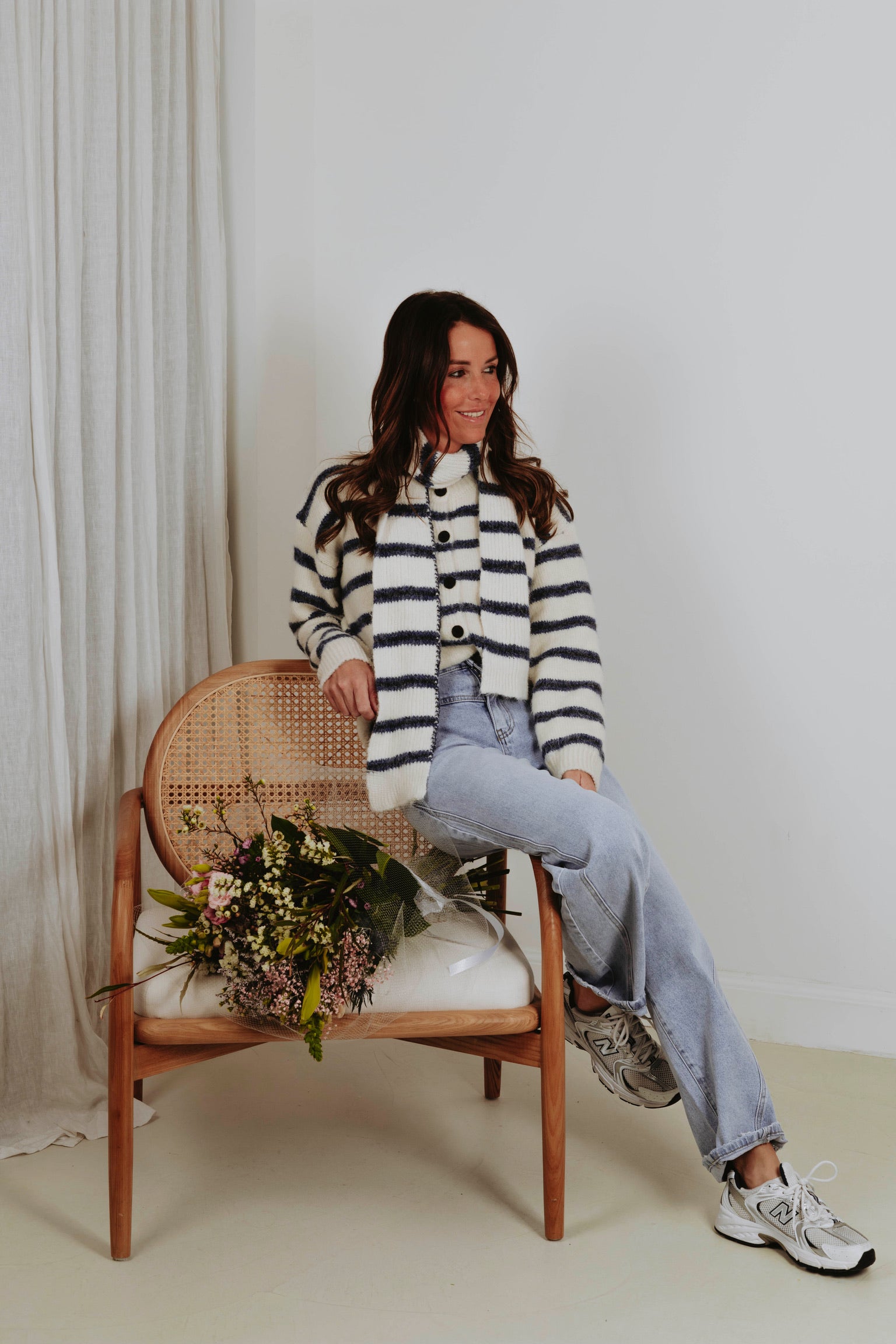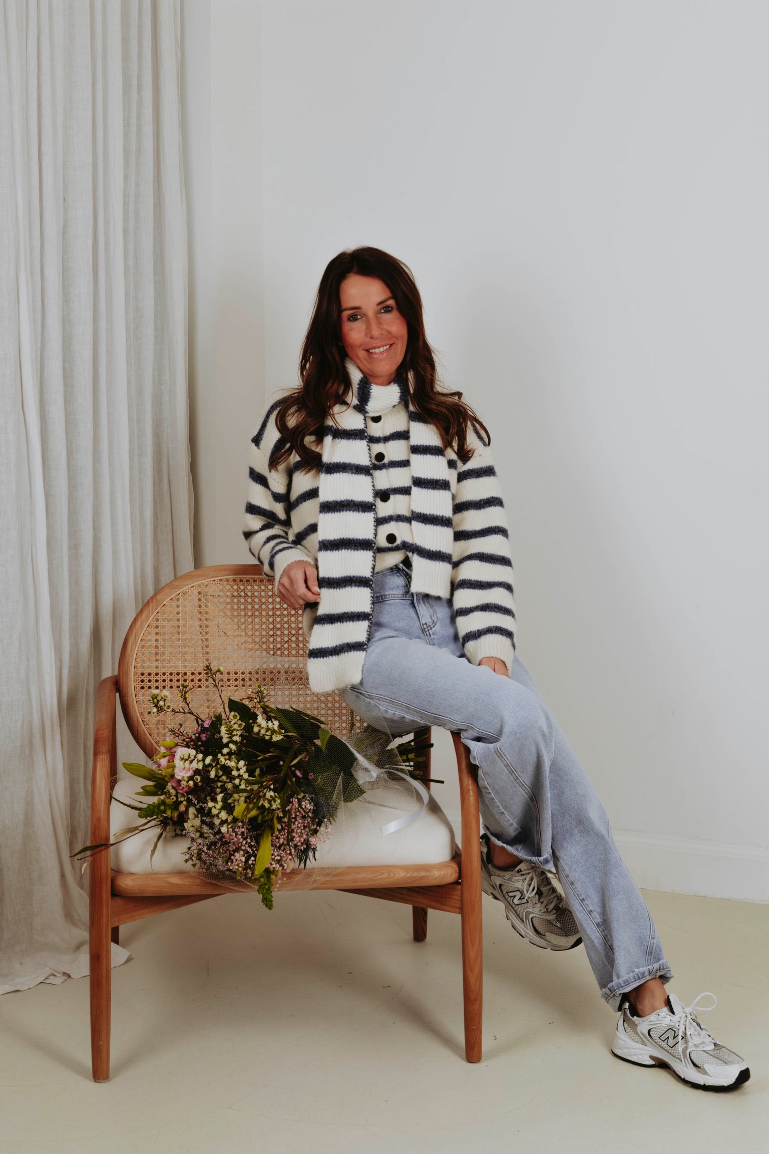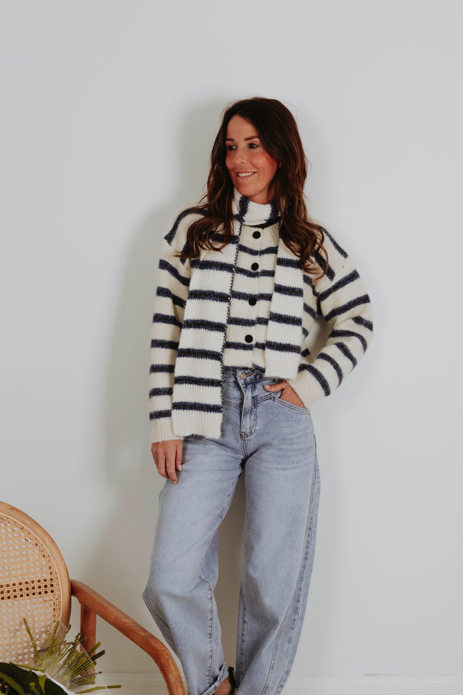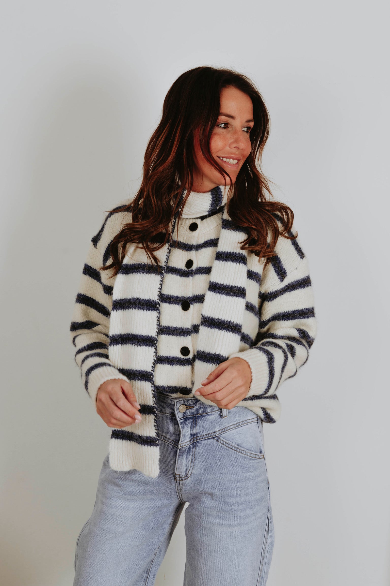 Een cosy cardigan in ecru en donkerblauw met speelse strepen, compleet met bijpassende sjaal voor een frisse, gelaagde look. Het zachte breisel en het vrolijke contrast geven een luchtige, voorjaarsachtige charme aan elke outfit.