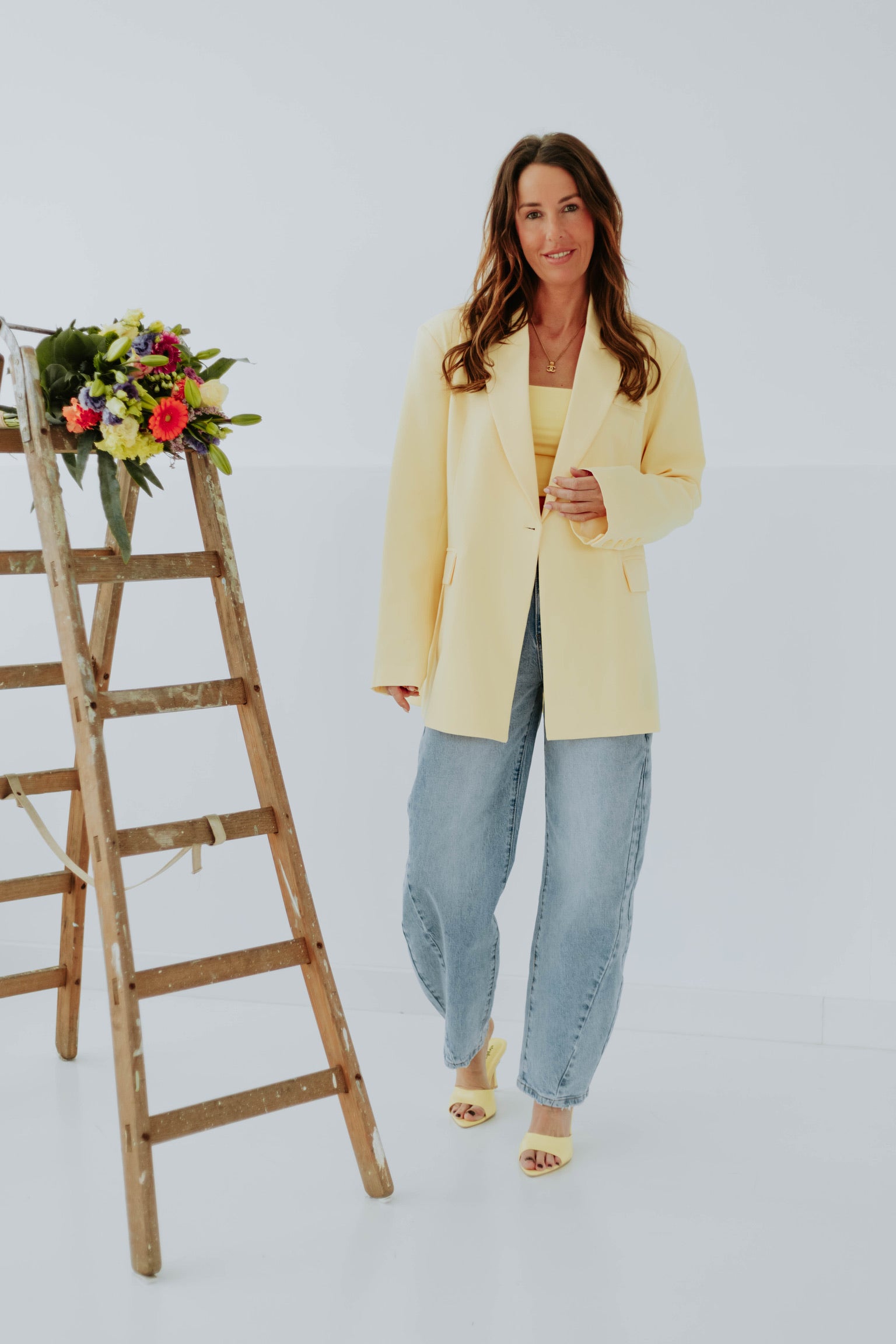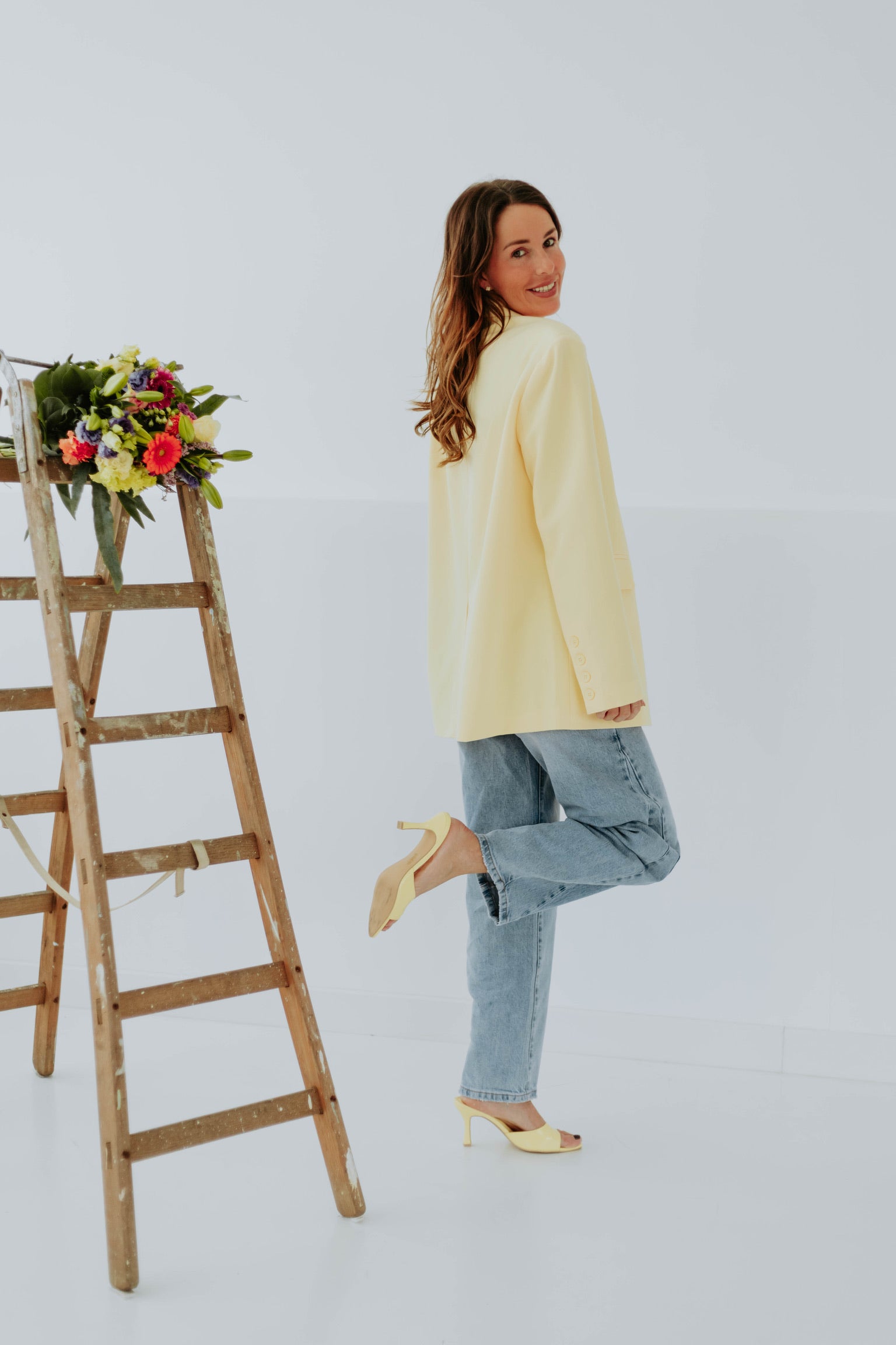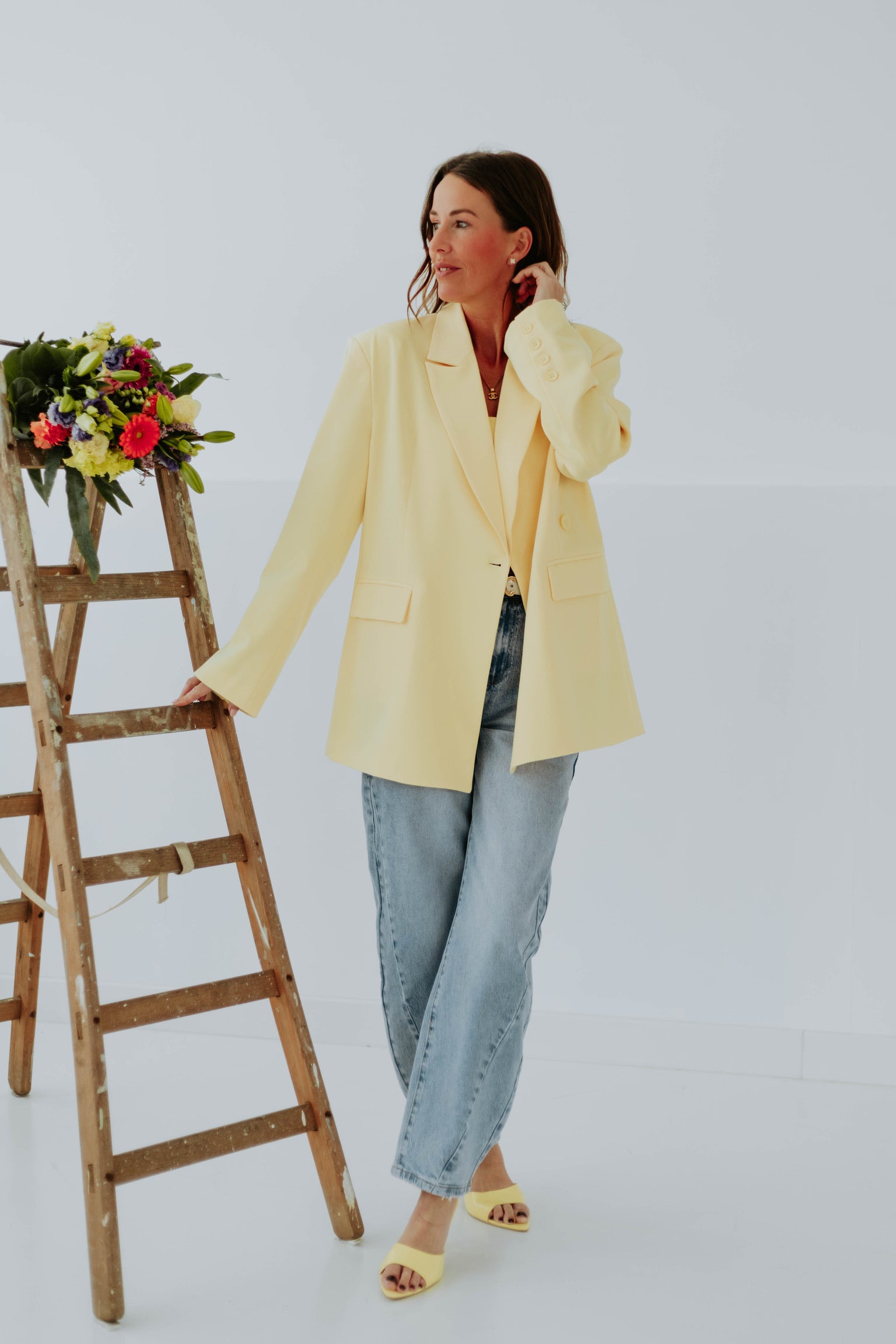 De zachte botergele tint brengt meteen licht en frisheid in je look. Het strakke silhouet krijgt hierdoor een speelse, lente-achtige twist zonder aan elegantie in te boeten. Perfect om een eenvoudige outfit in één beweging een zonnige upgrade te geven.