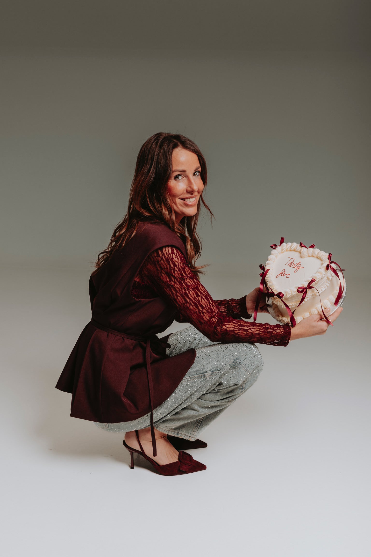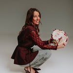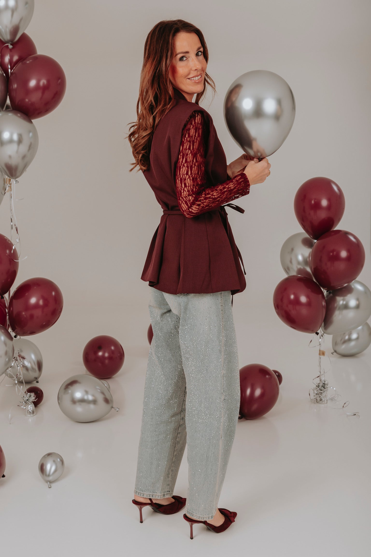 Deze mouwloze blazer valt op met een rijke bordeauxrode kleur die kracht en feestelijkheid uitstraalt. Perfect om elke outfit een elegante en sprankelende touch te geven op speciale momenten.