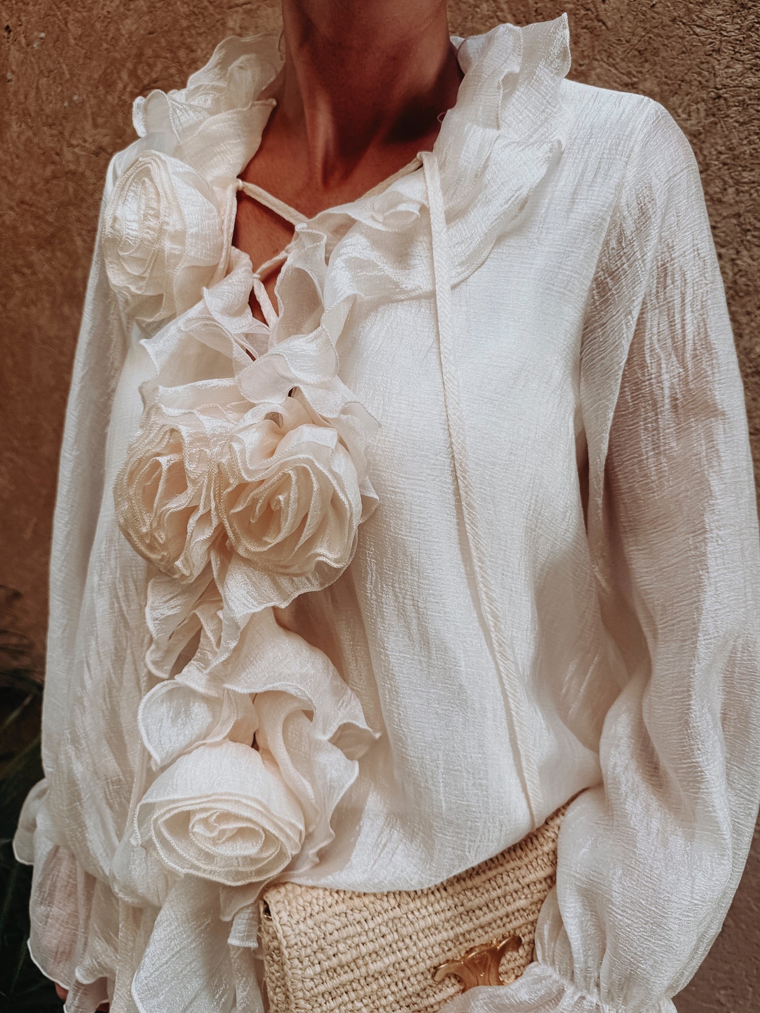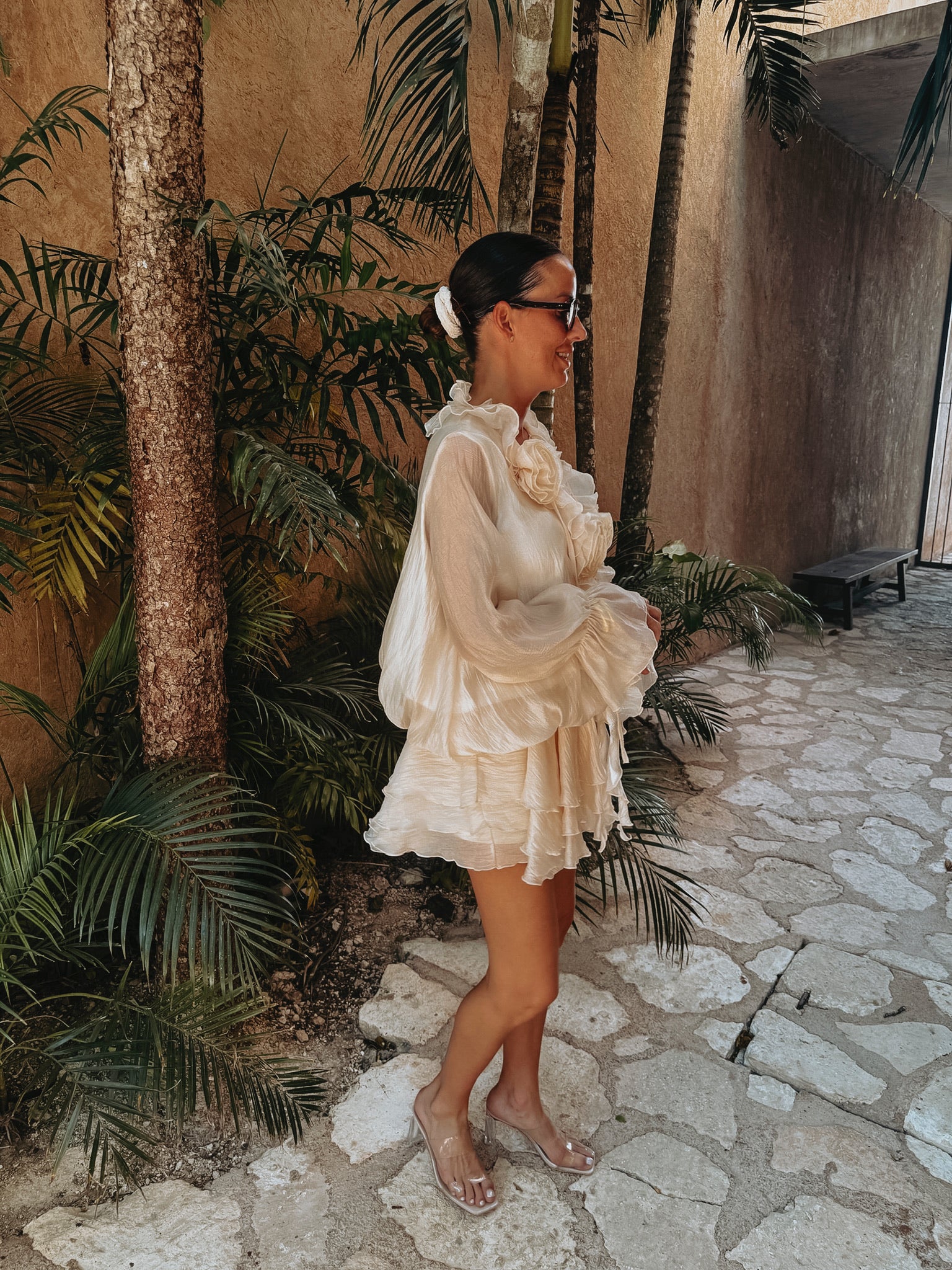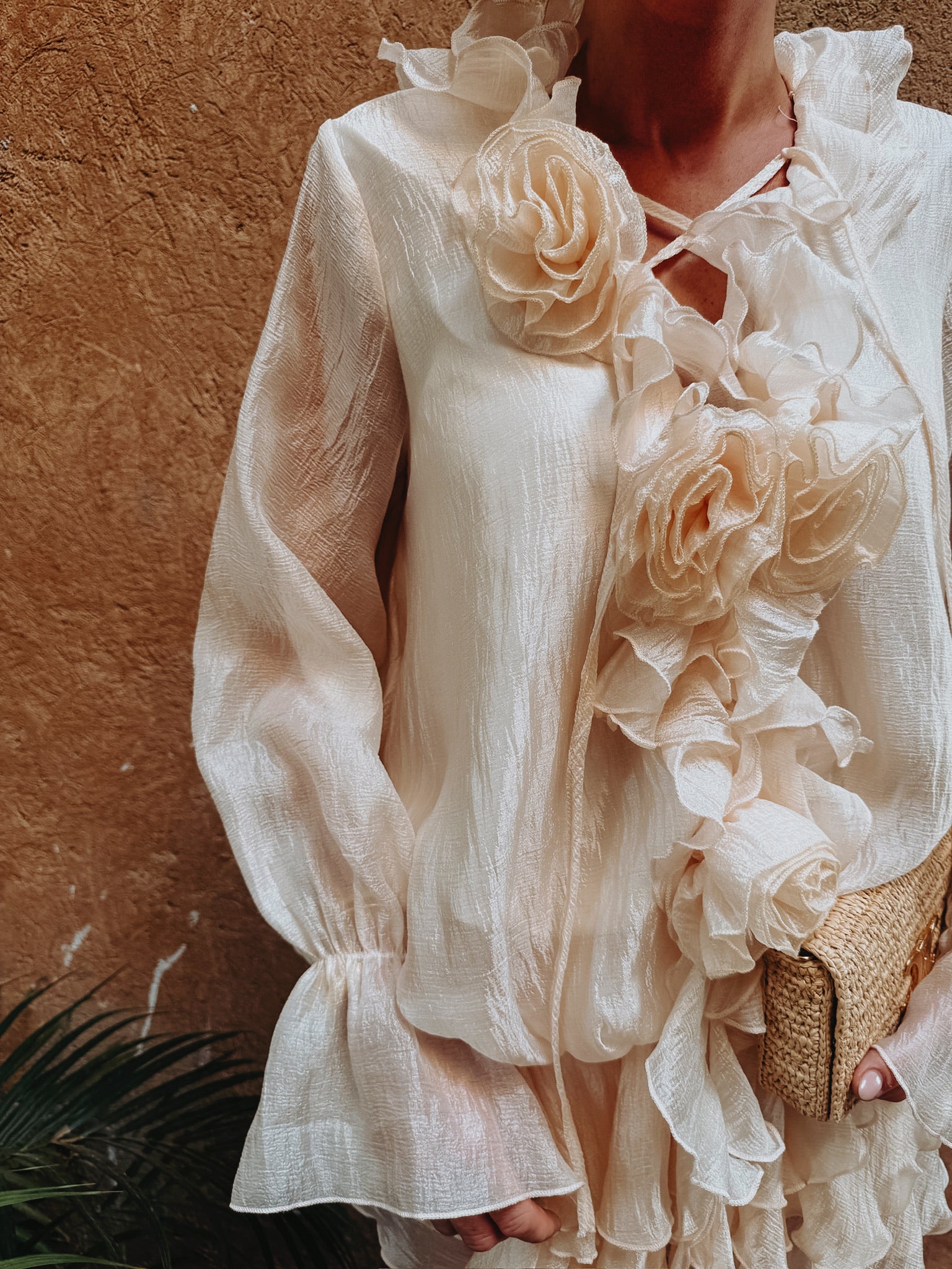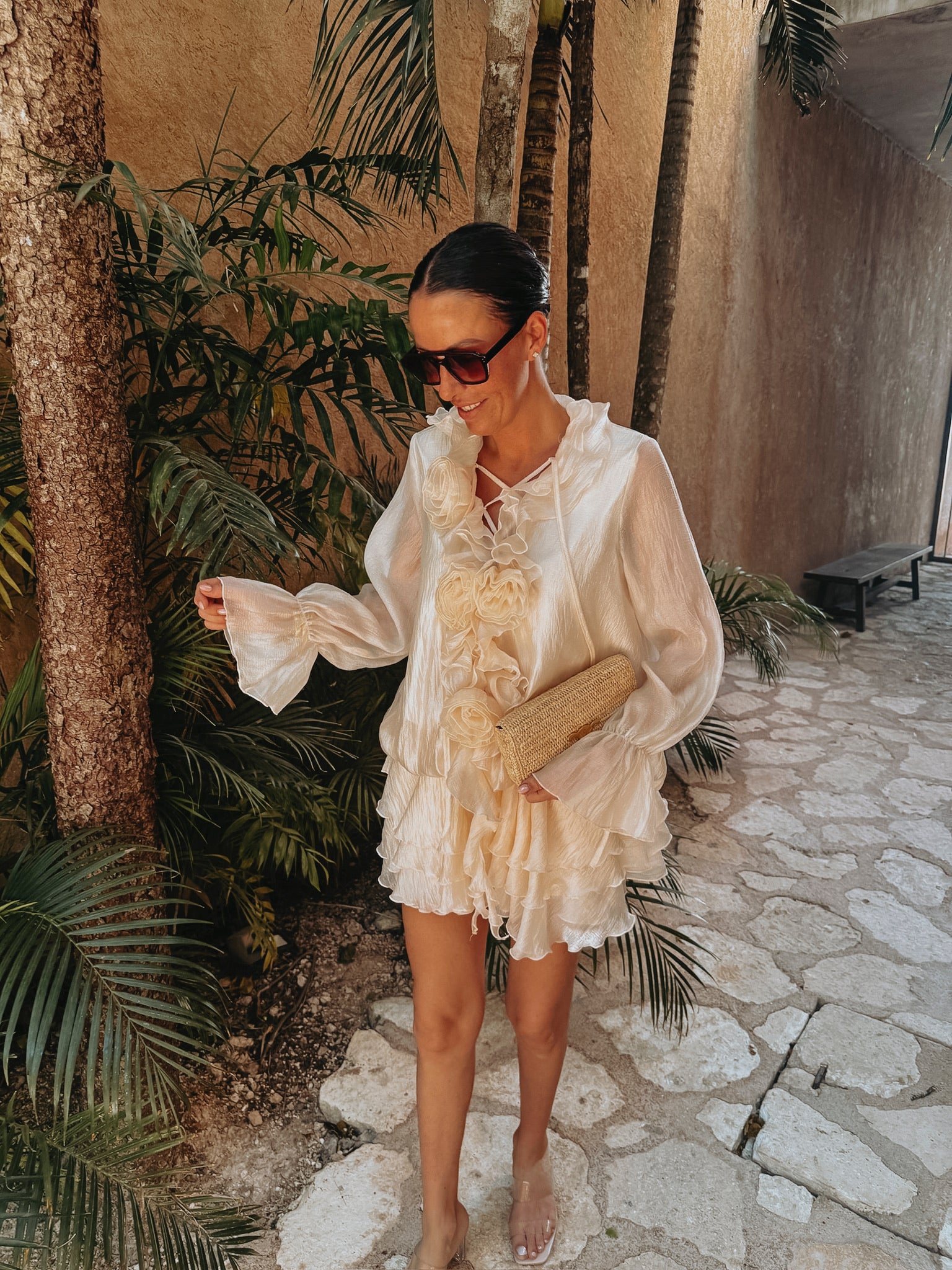 Een korte, luchtige jurk in een zachte ecrutint die meteen een romantische zomeruitstraling heeft. De uitlopende mouwen geven een speelse beweging, terwijl de opvallende geborduurde bloemen zorgen voor een charmant, dromerig detail. Perfect voor zonnige dagen, tuinfeestjes en lange avonden in vakantiesfeer.