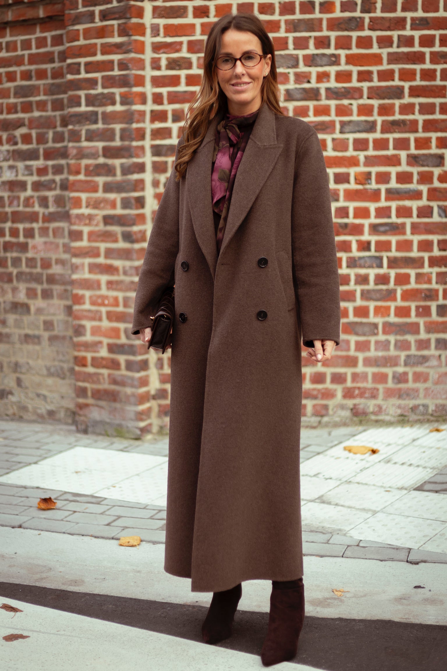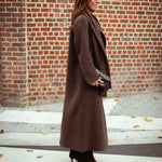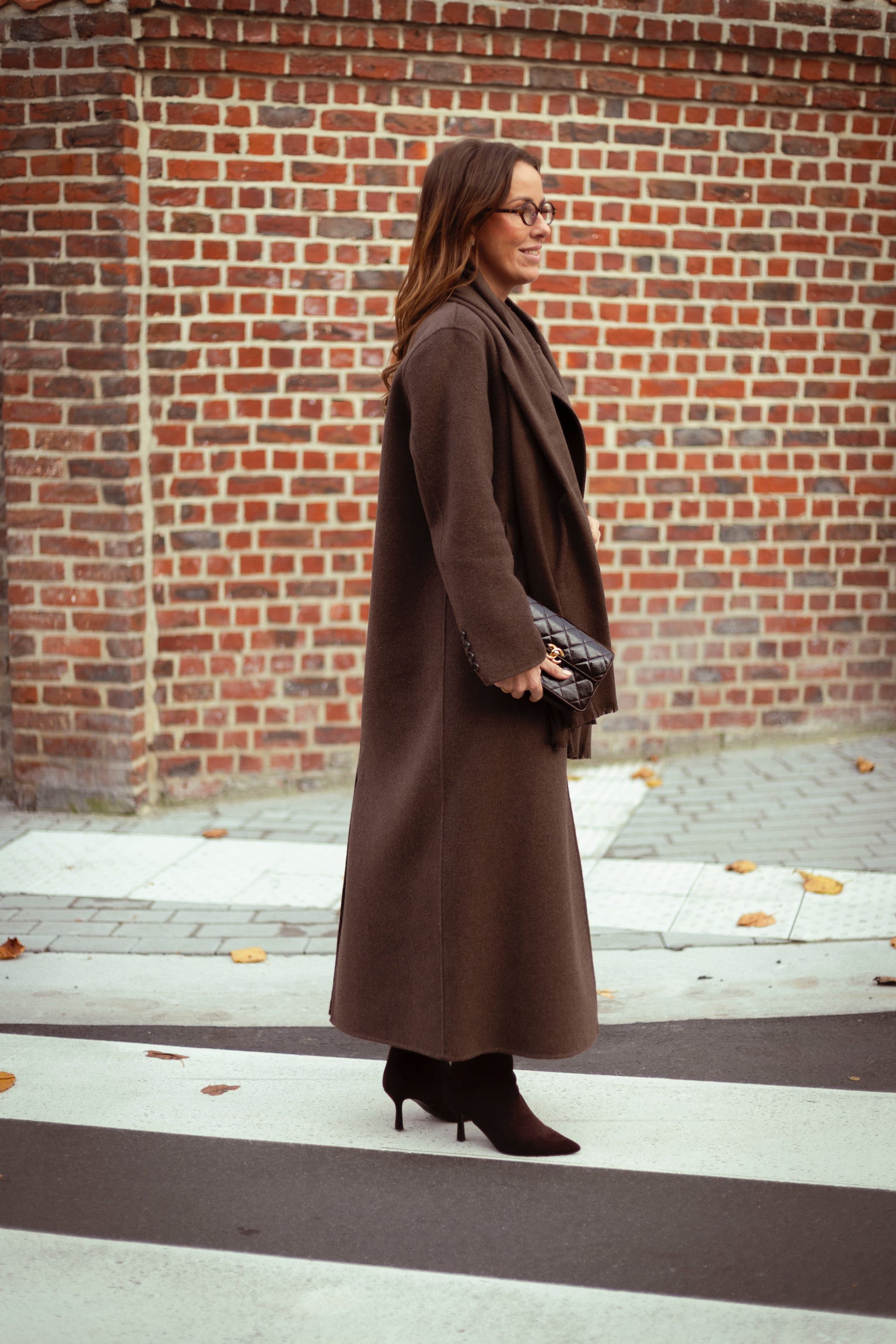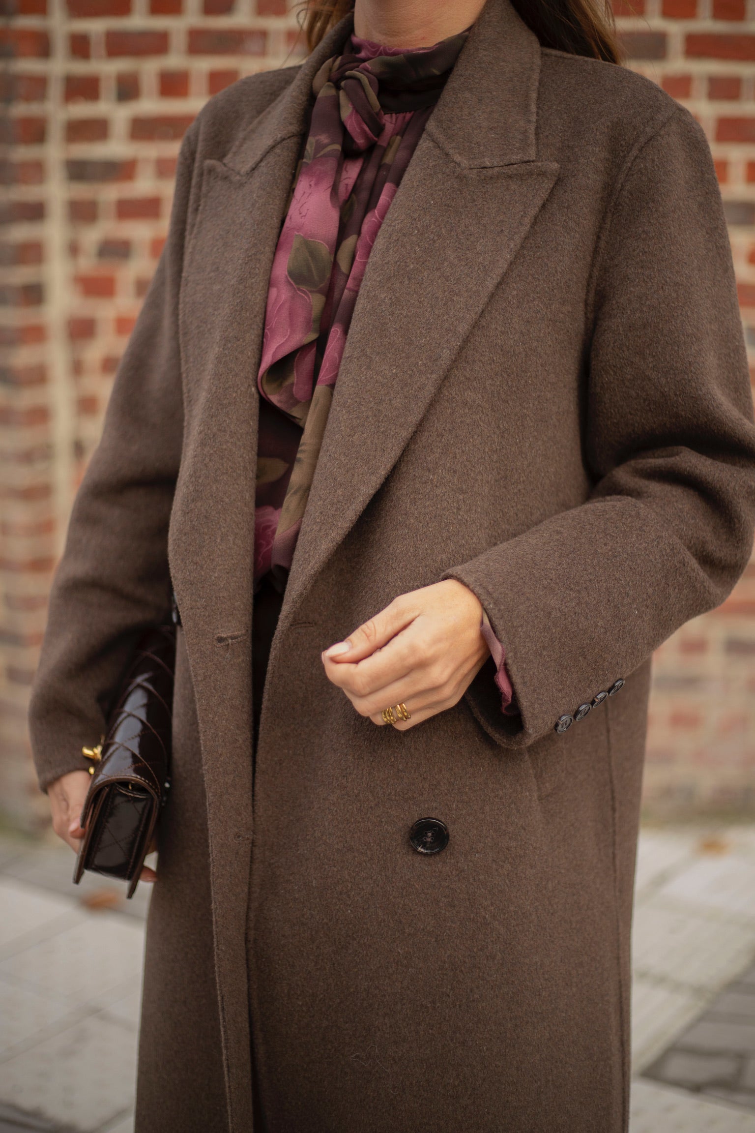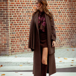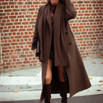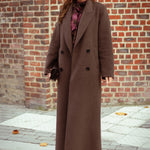 Een lange, elegante jas in diepe bosbruine tinten die elke stap door de stad een vleugje mystiek geeft. Warm, tijdloos en moeiteloos chic: het soort laag dat de herfst omarmt met stijl en zelfvertrouwen.
