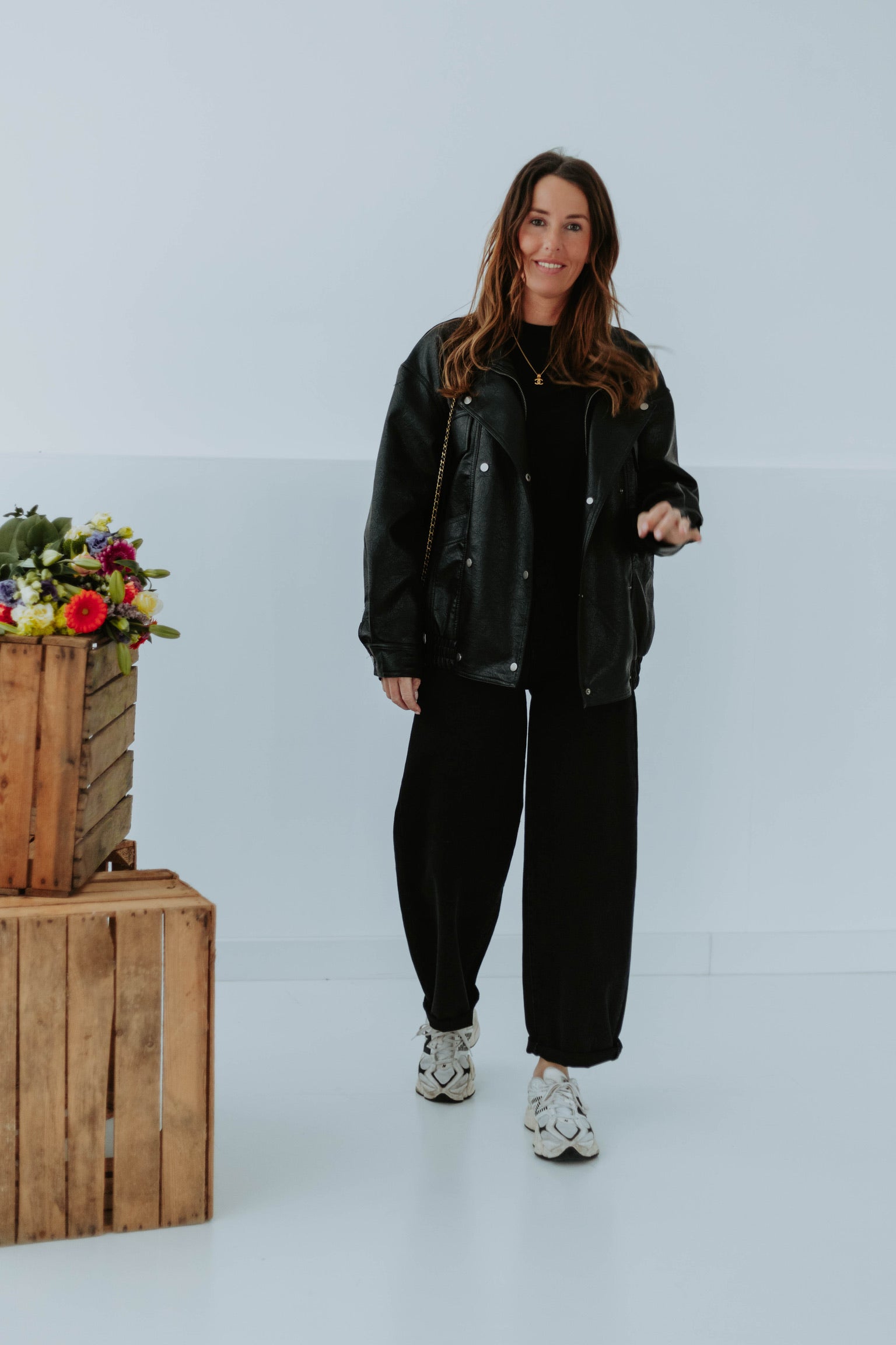 Het oversized model geeft een nonchalante en stoere uitstraling, terwijl het leer een luxe en tijdloze touch toevoegt. Perfect om een simpele outfit direct een edgy en frisse lentekracht te geven. Zo combineer je comfort met een opvallende stijl zonder moeite.