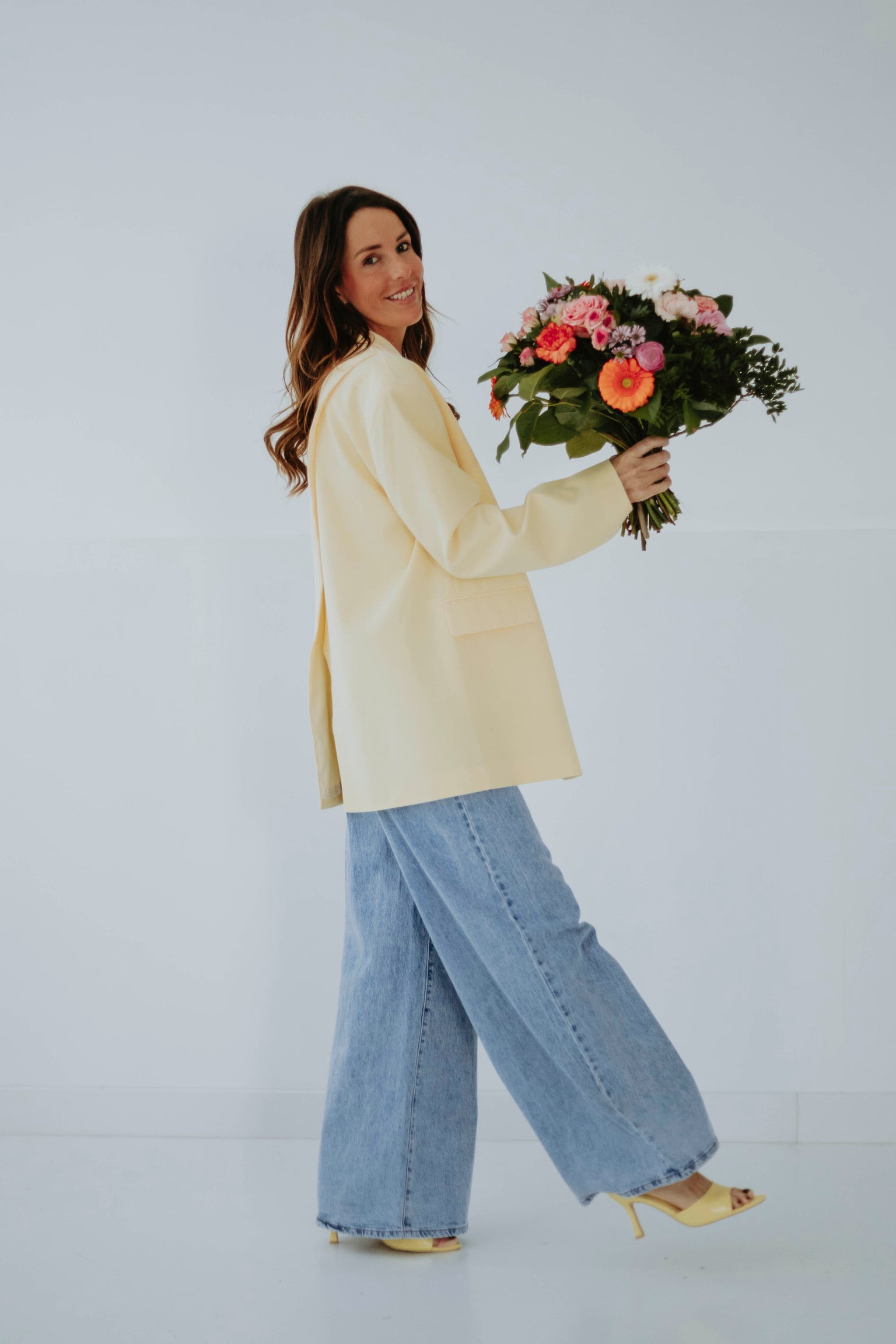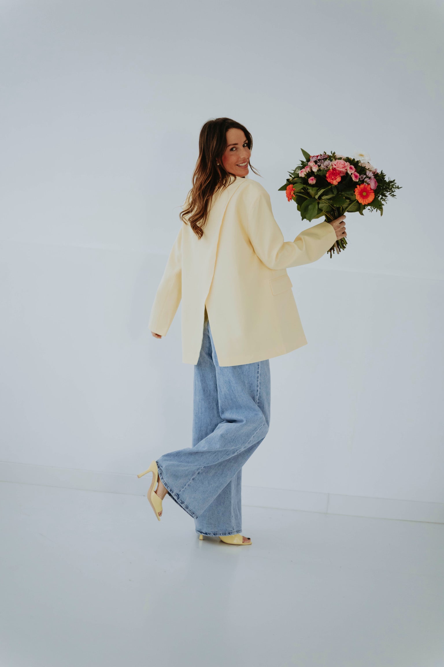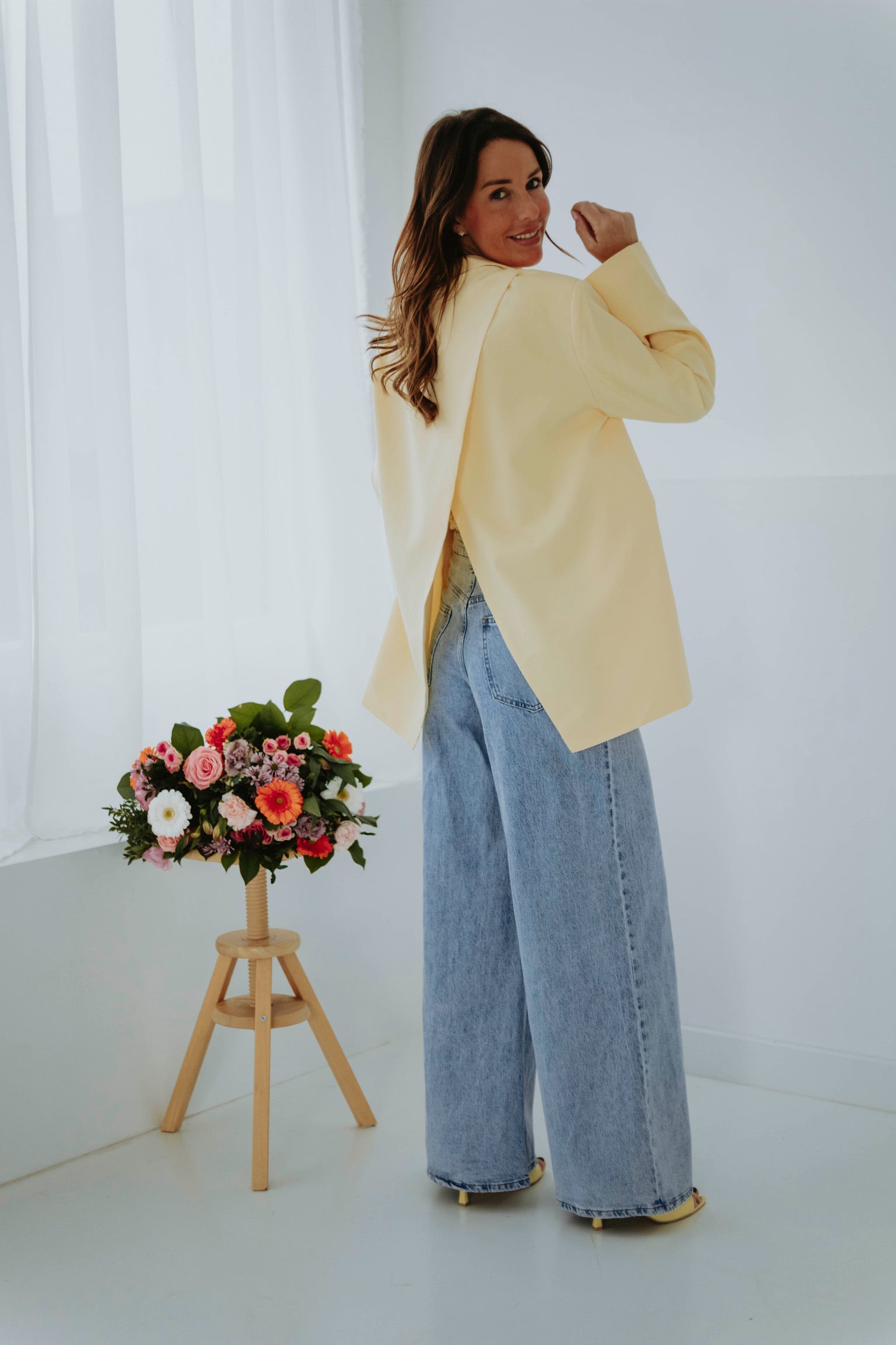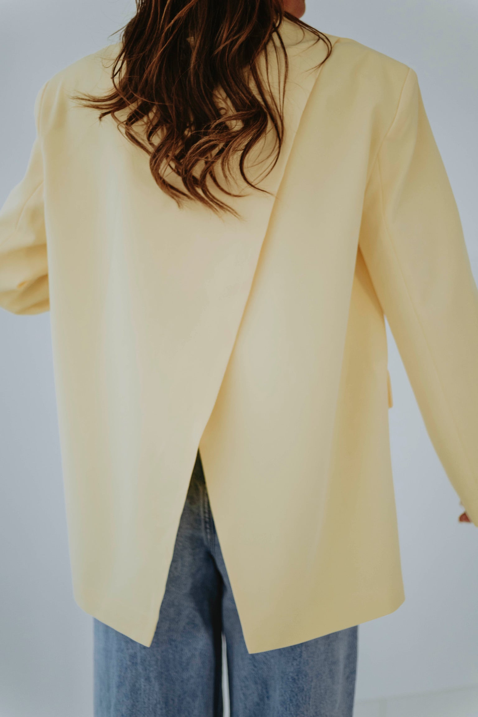 Zachtgeel en luchtig, met een onverwachte open rug die een speelse draai geeft aan elke beweging, oversized en moeiteloos chic voor zonnige lentesferen.
