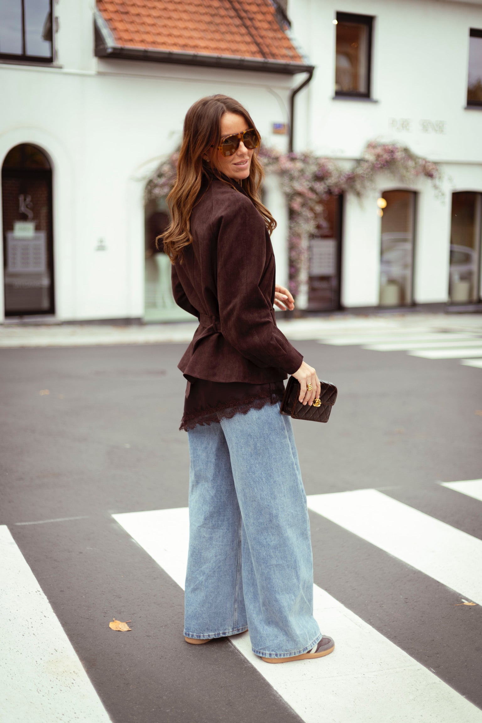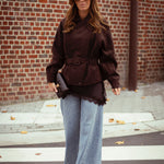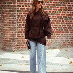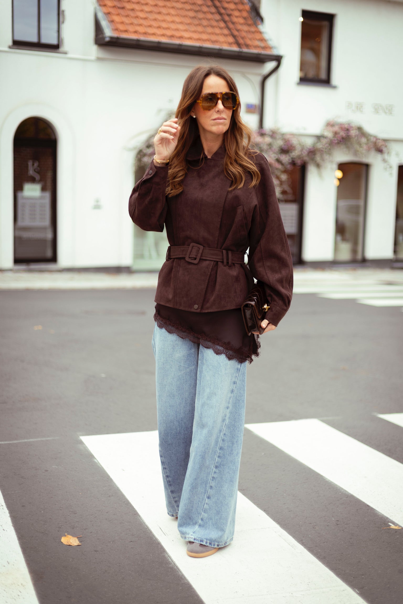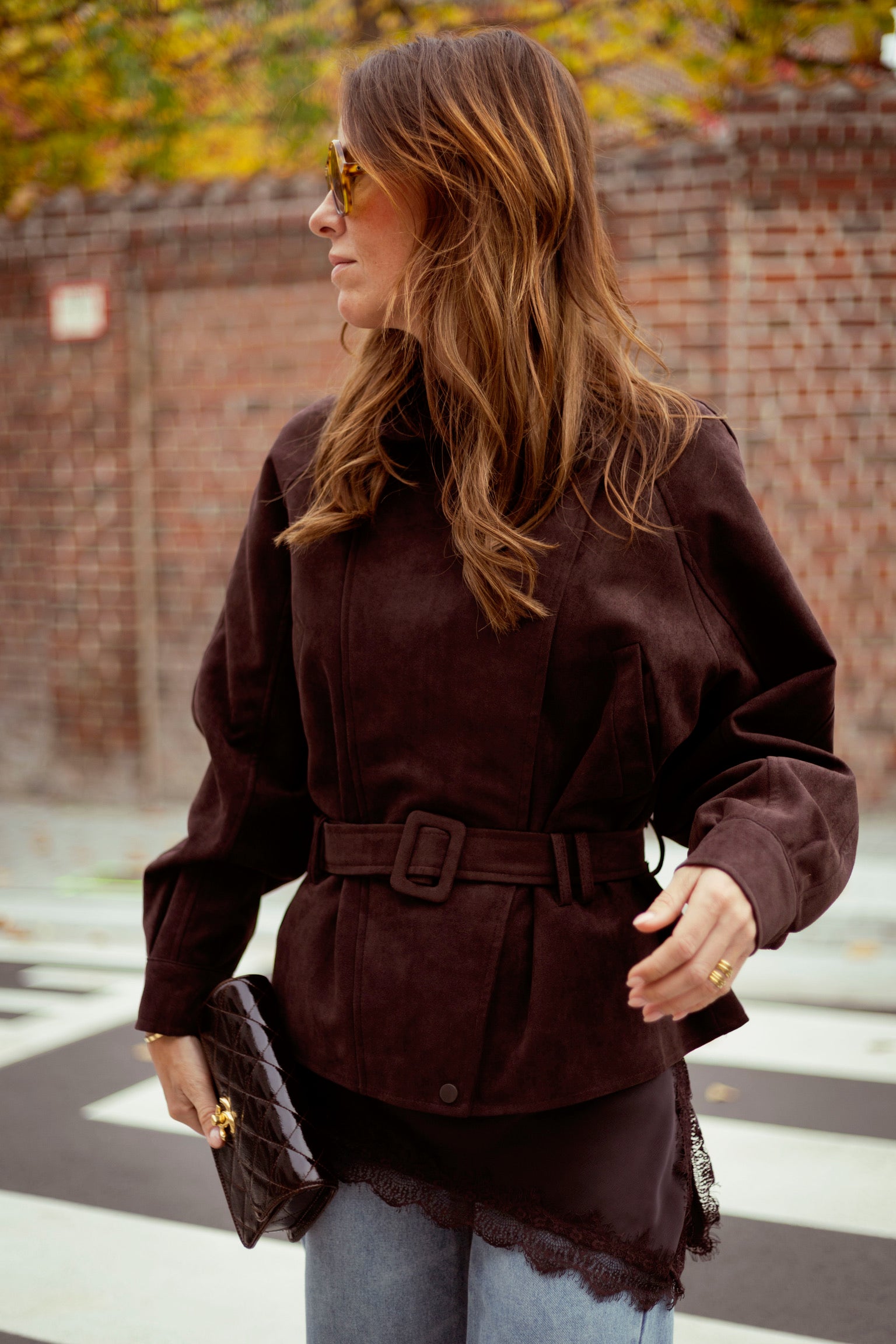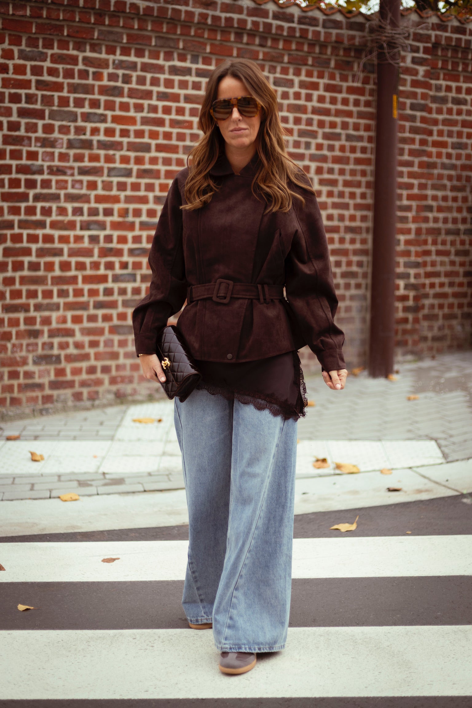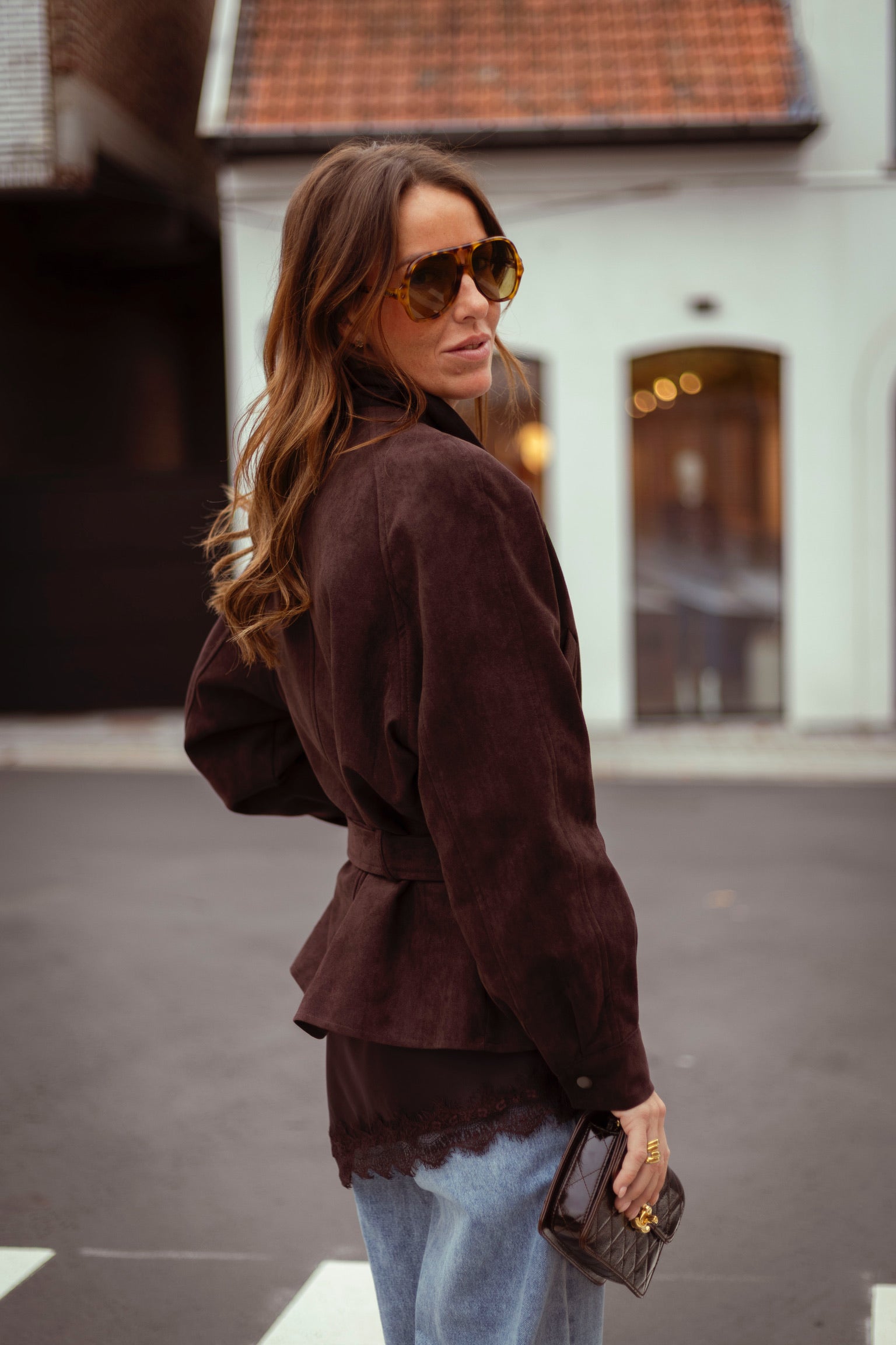 Een zacht suède jack dat warmte en textuur toevoegt aan elke stadslook. De ceintuur accentueert de taille subtiel, waardoor je outfit moeiteloos chic en herfstklaar aanvoelt.
