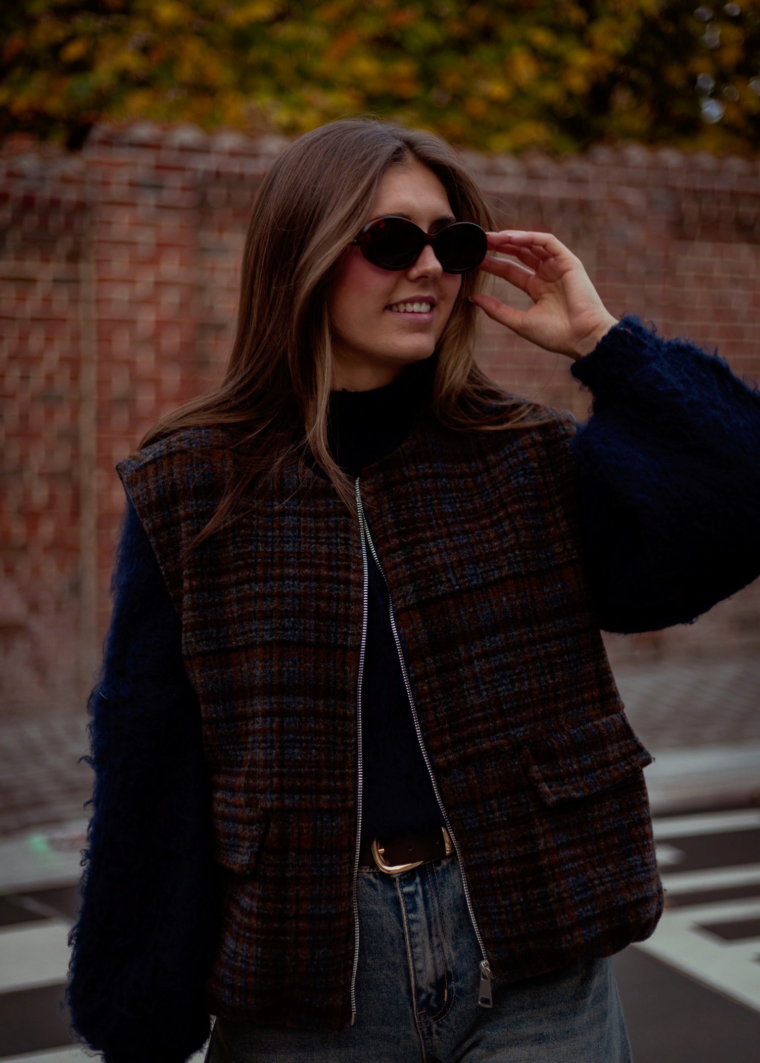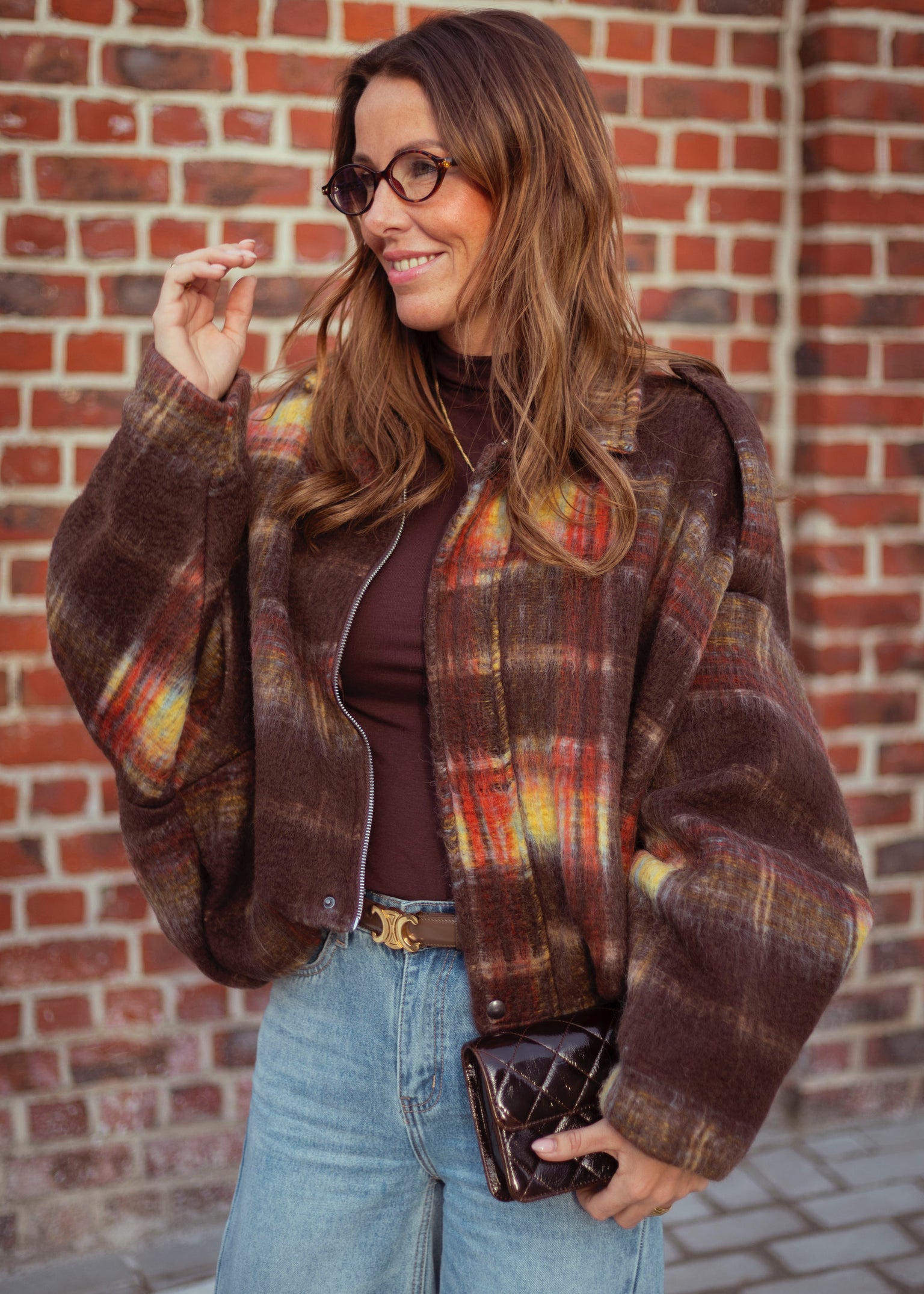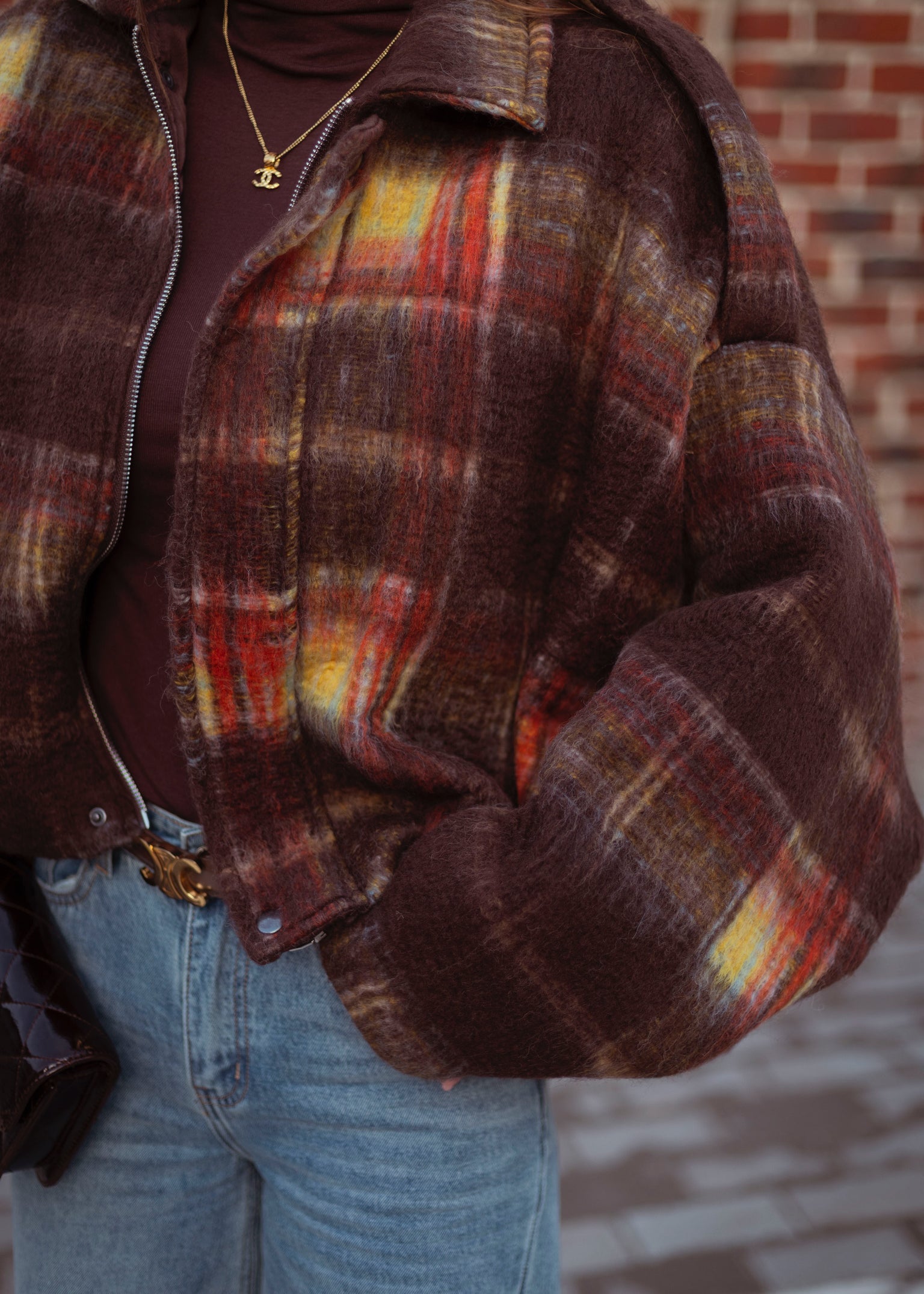 FALL IN LOVE BROWN CHECKERED ZIP JACKET