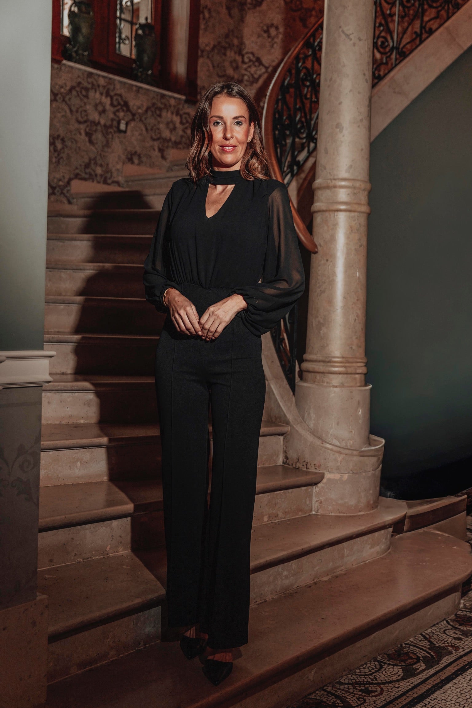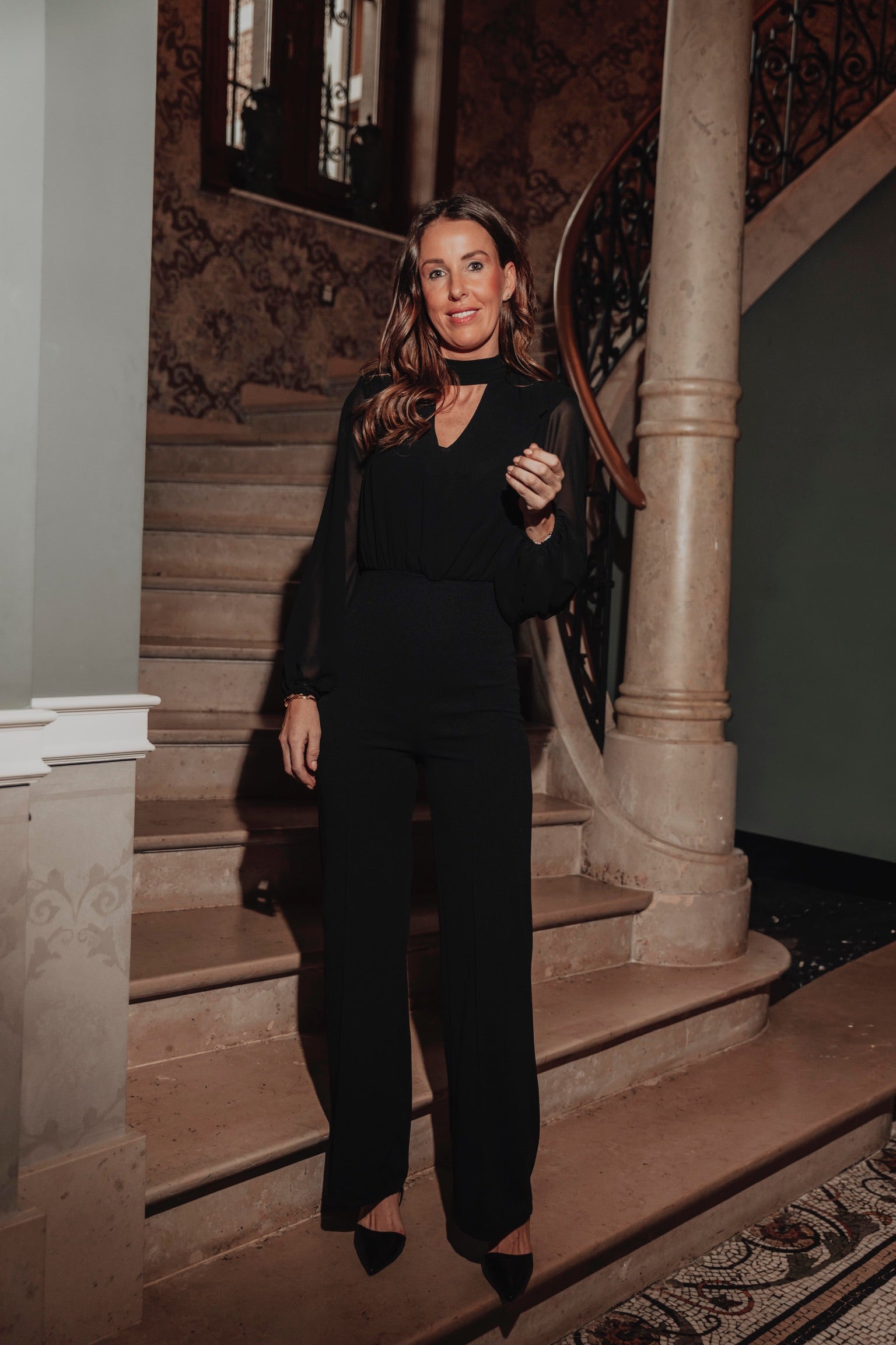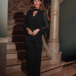 Een strakke en stijlvolle jumpsuit in zwart die een krachtige en feestelijke uitstraling heeft. Het elegante model benadrukt de vormen op een verfijnde manier en geeft een moderne touch aan je look. Perfect om tijdens de feestdagen zelfverzekerd en chic voor de dag te komen.