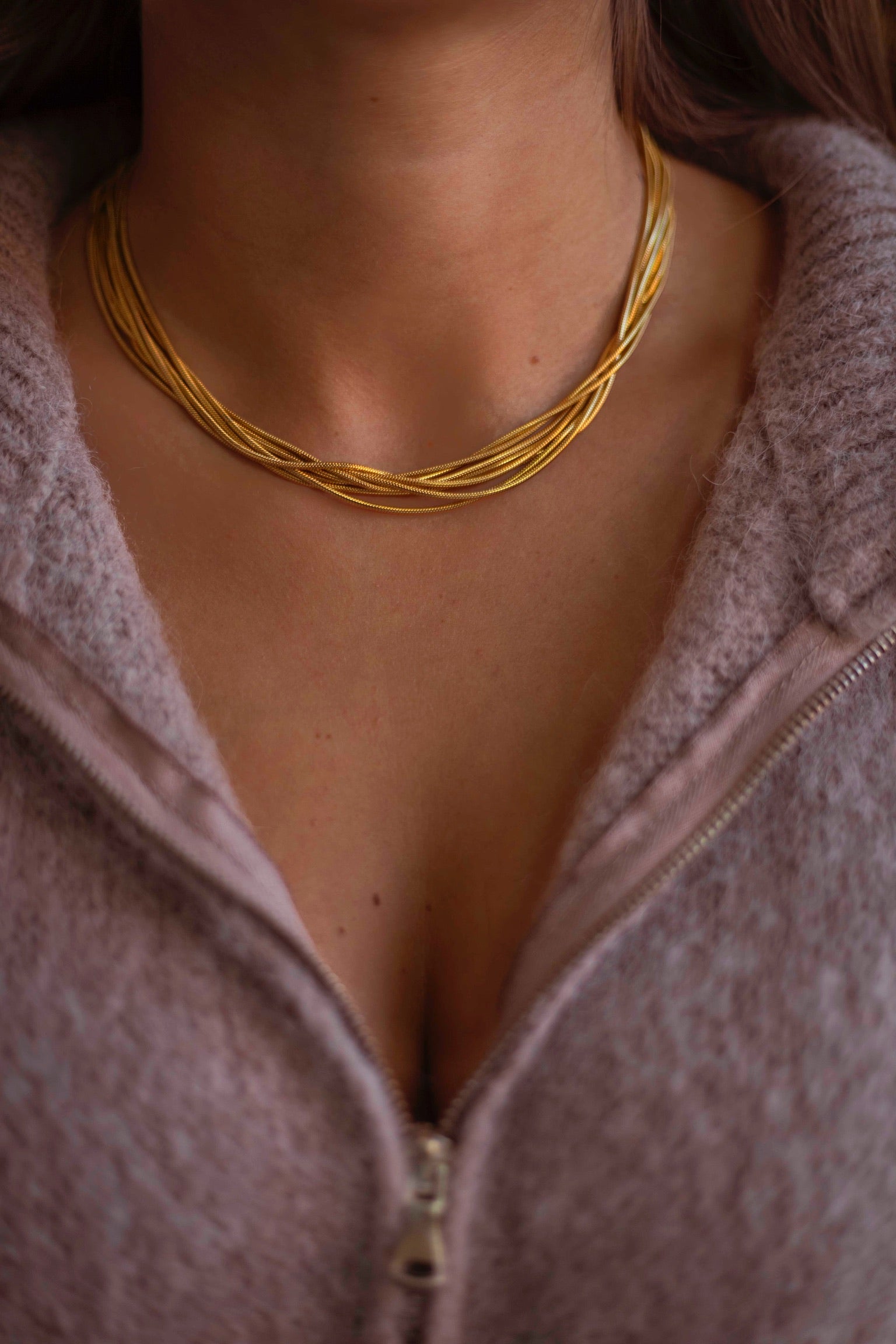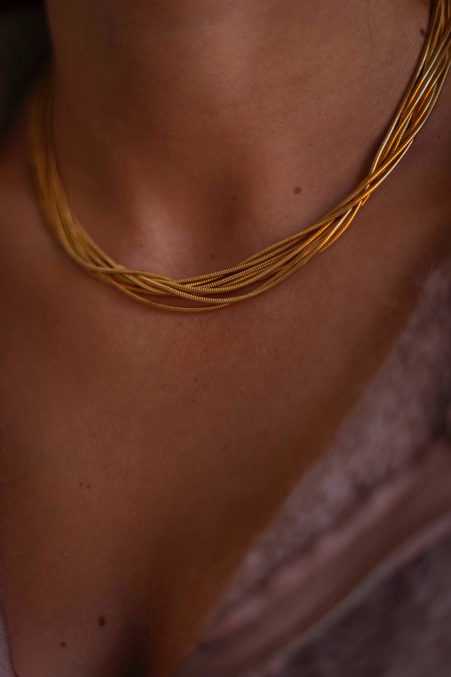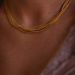 Een verfijnde ketting met meerdere dunne schakels die samen een speels en sprankelend geheel vormen. Dit veelzijdige sieraad voegt een lichte glans toe aan warme herfstlagen zonder te overheersen.