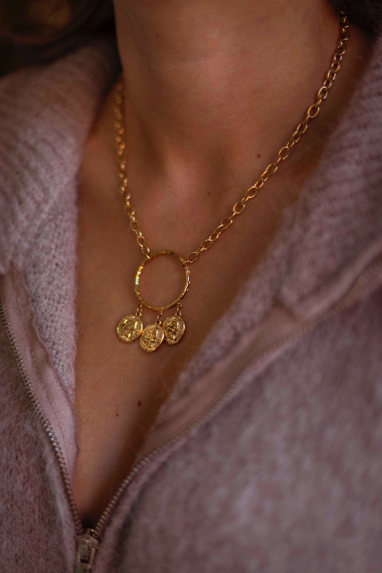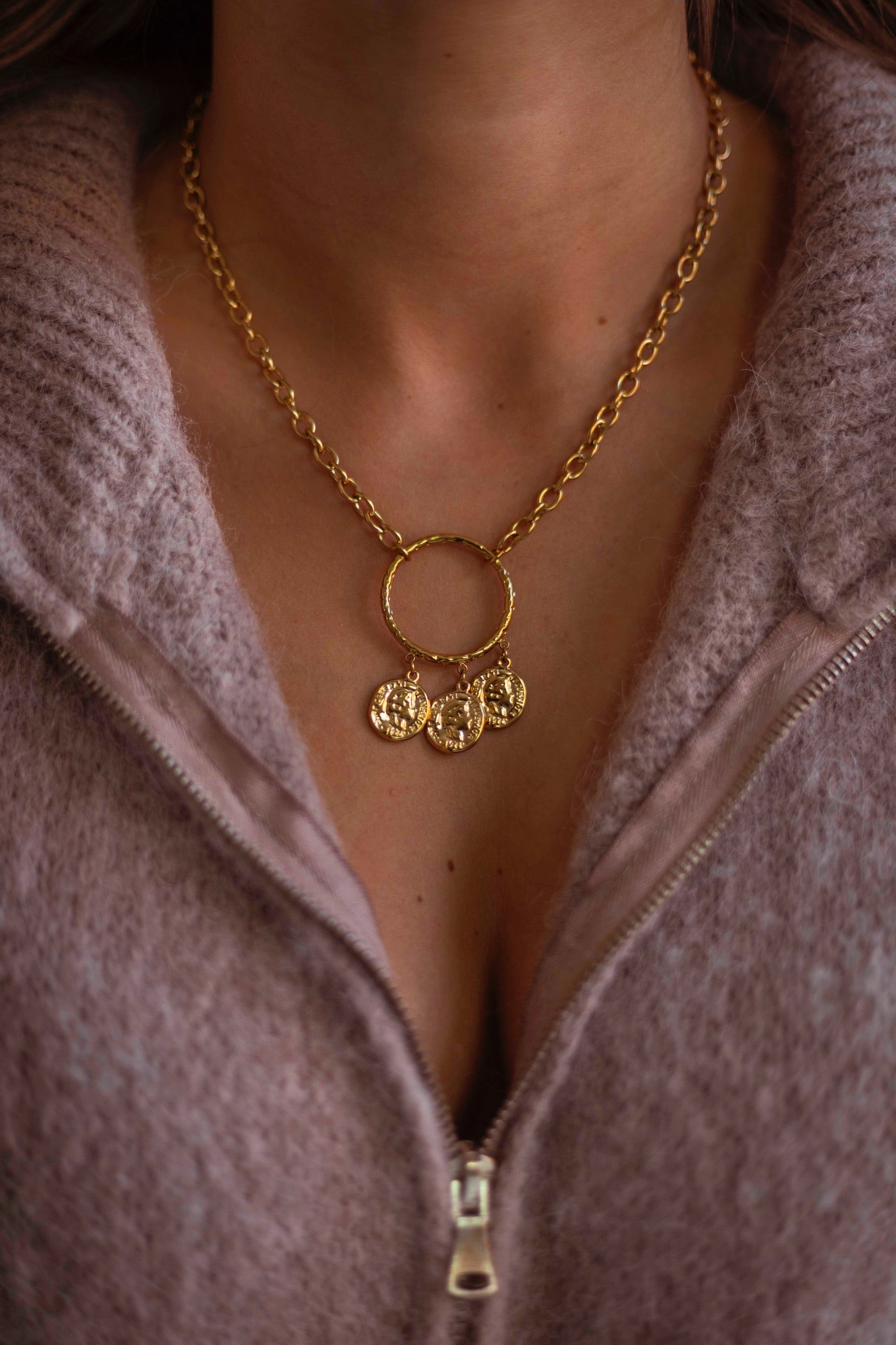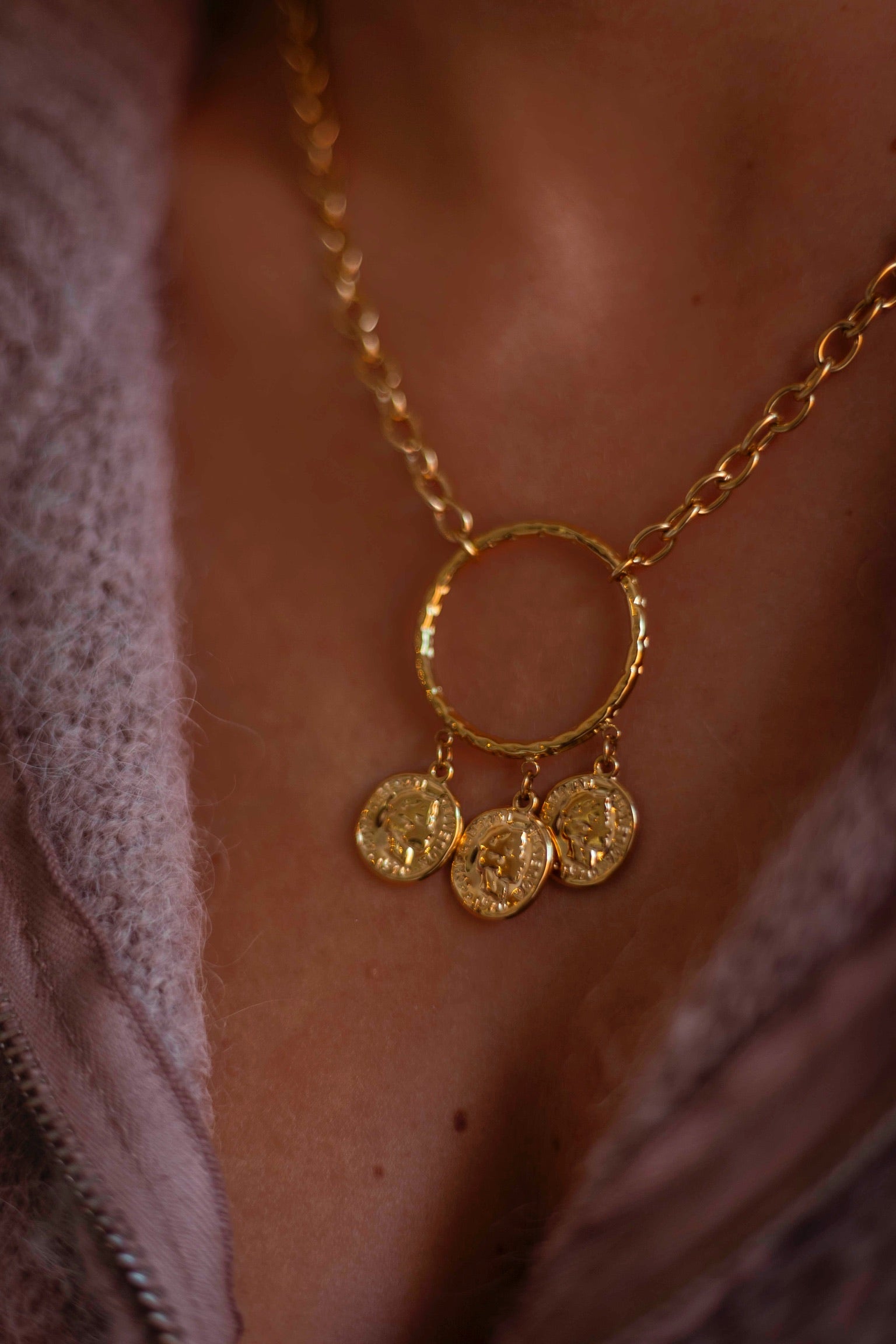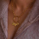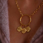 Een gouden ketting met een tijdloze cirkelhanger waar drie muntjes zachtjes aan hangen. Dit subtiele sieraad brengt een warm, vintage gevoel dat perfect past bij knusse herfstdagen.