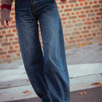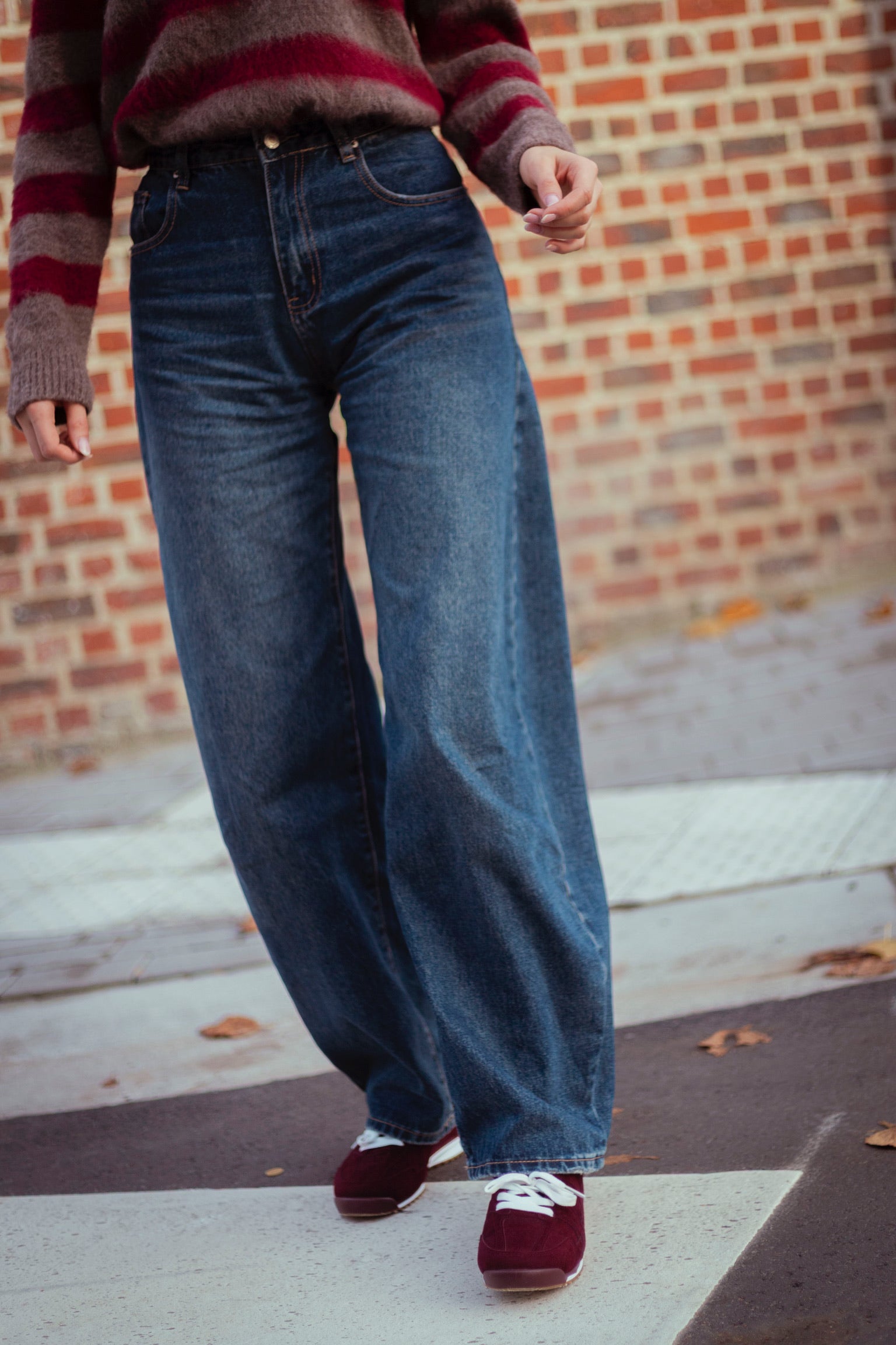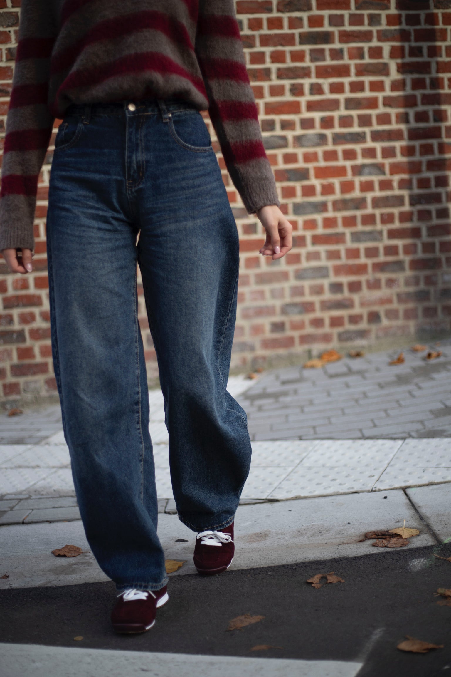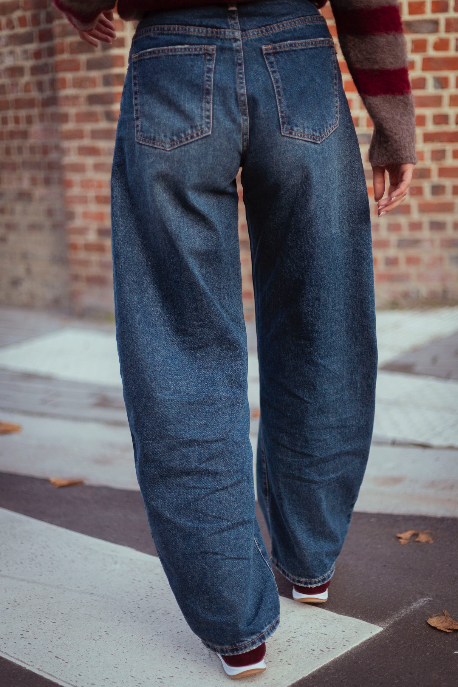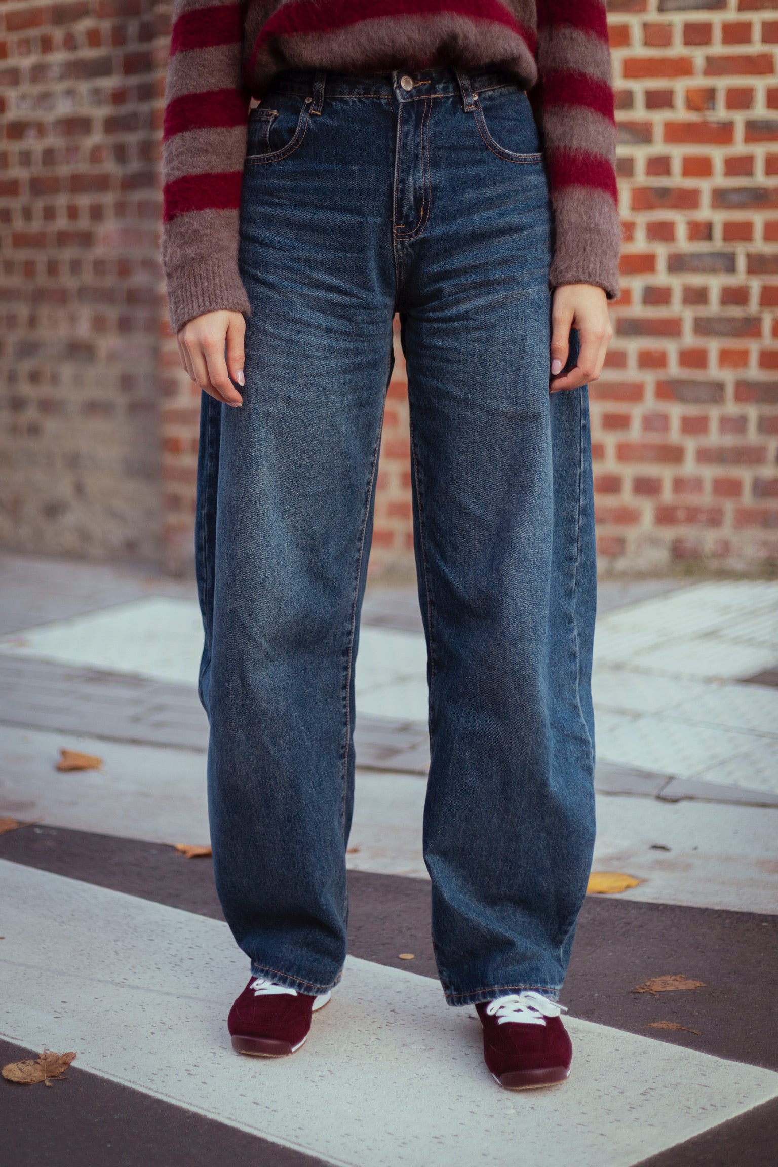 Een diepe blauwe jeans met een brede pasvorm die comfort en urban stijl moeiteloos combineert. Ideaal voor herfstige citydagen, makkelijk te dragen met cosy knits of een statement blazer voor een nonchalant-chique look.
