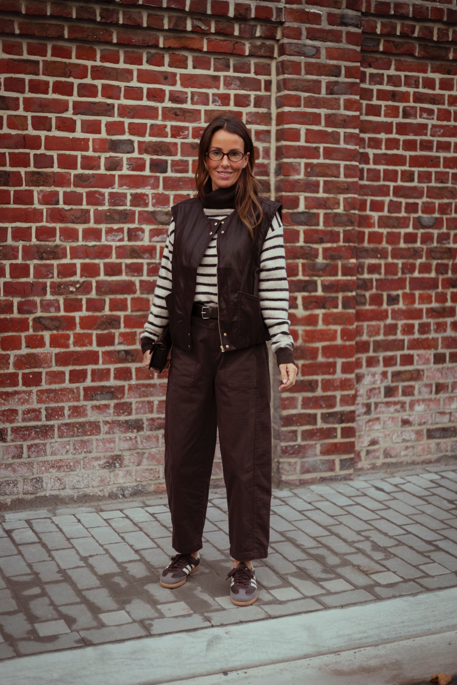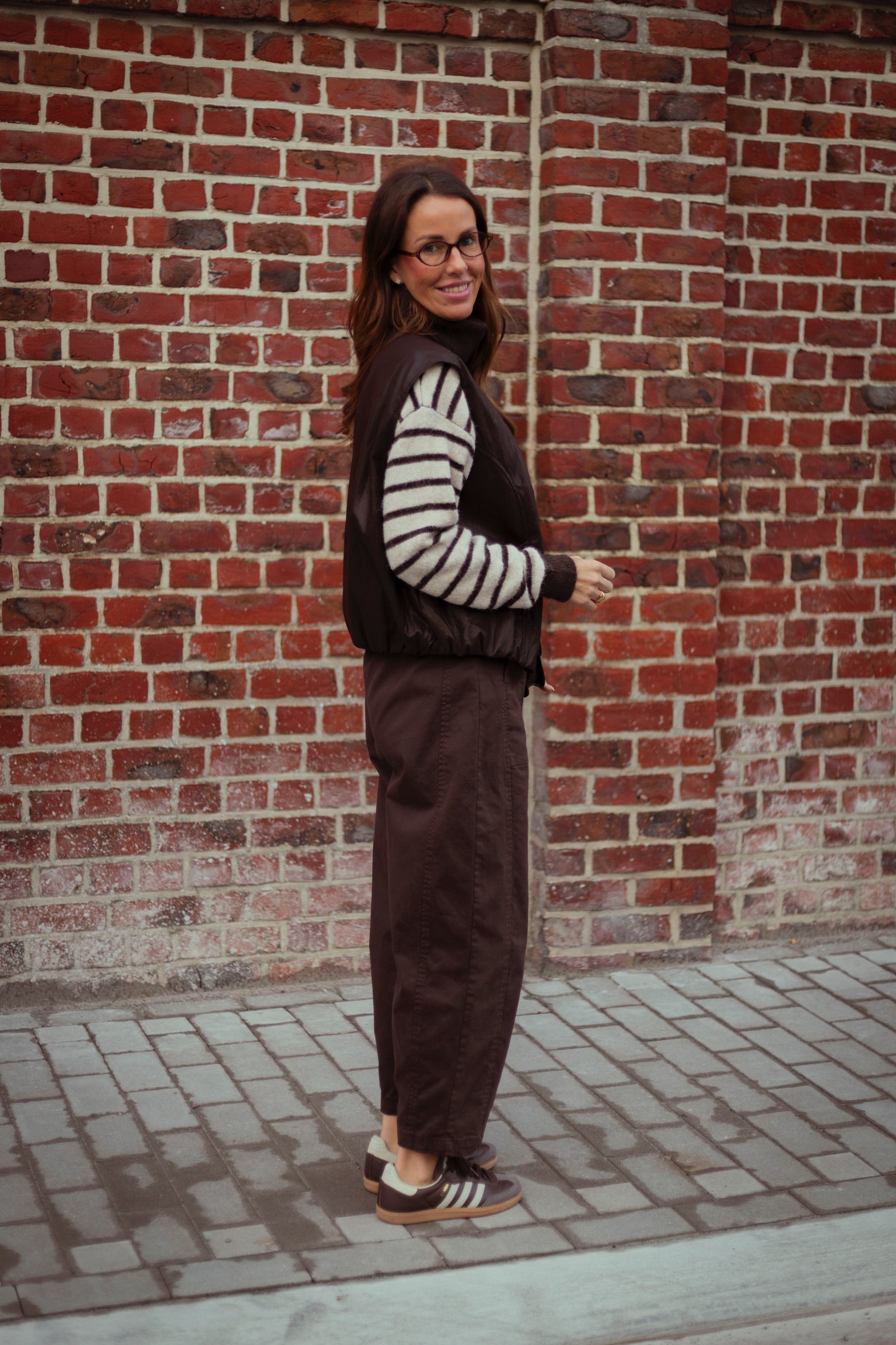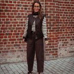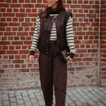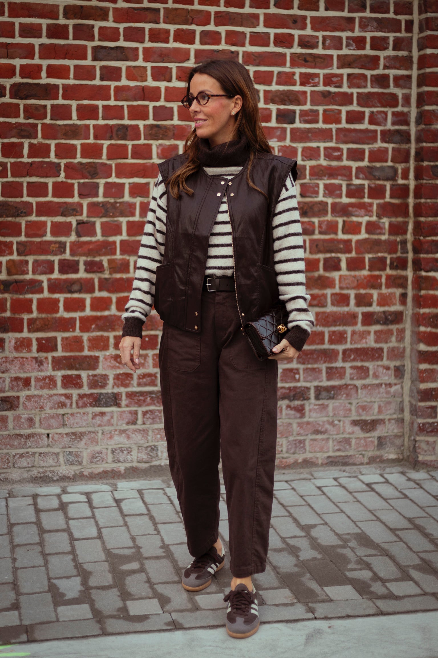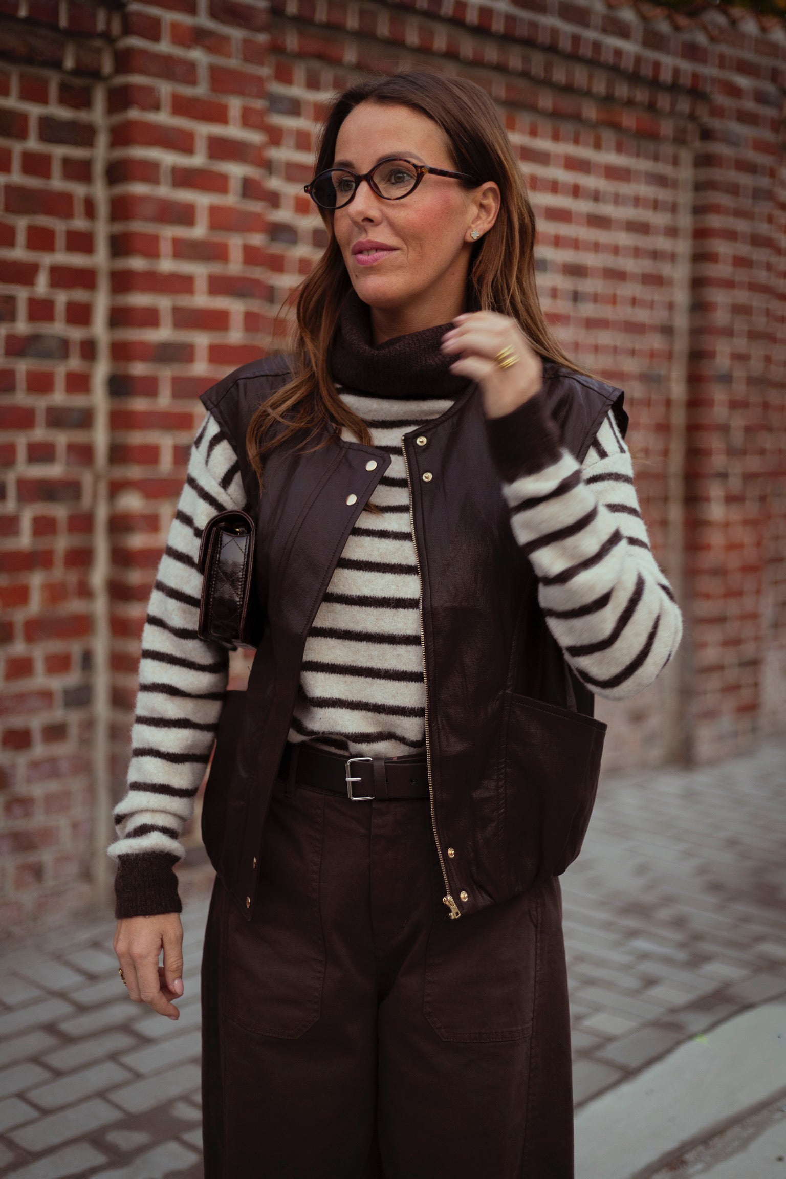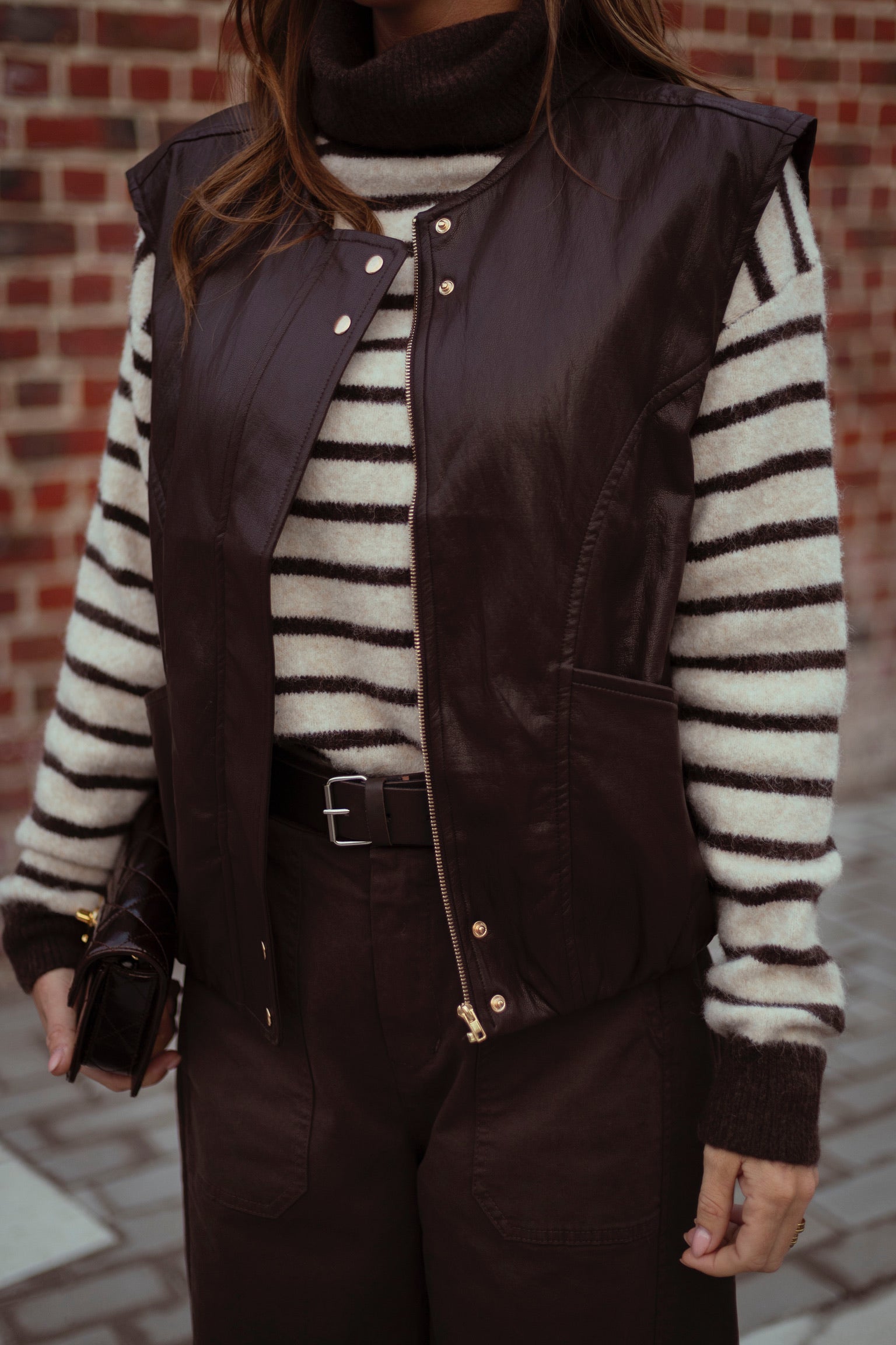 Een stoer mouwloos jack in rijk bruin leer dat een edgy touch geeft aan elke herfstlook. Perfect om over cosy knits te dragen en moeiteloos een urban statement te maken.