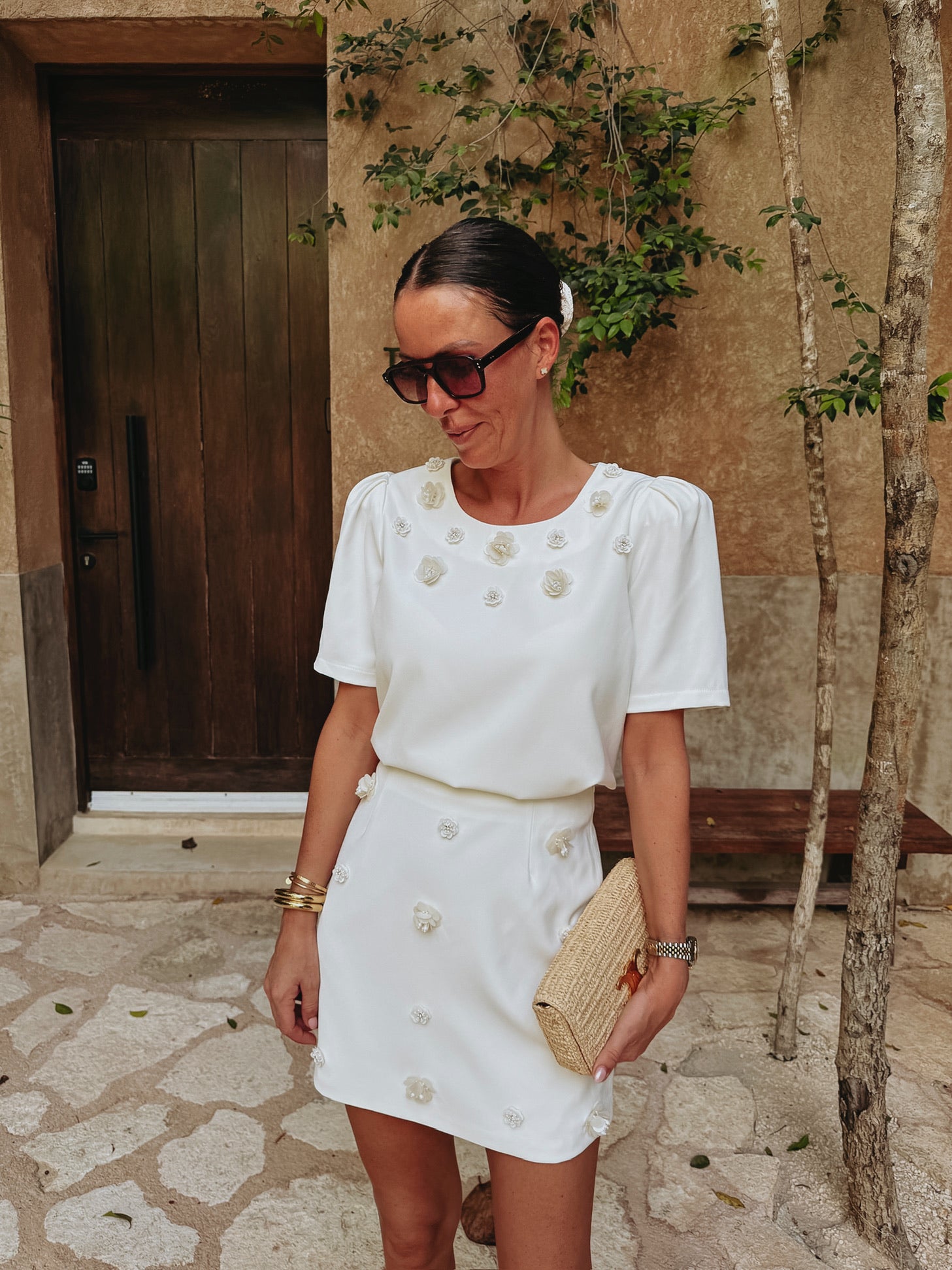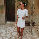 Een luchtige witte rok met gehaakte bloemen en subtiele parelaccenten die een elegante, zomerse flair geven. Het speelse ontwerp maakt het ideaal om te combineren met de bijpassende top voor een complete look, maar staat ook prachtig op zichzelf voor een moeiteloze, zonnige outfit. Perfect voor vakantie, terrasjes of een zonnige wandeling door de stad.