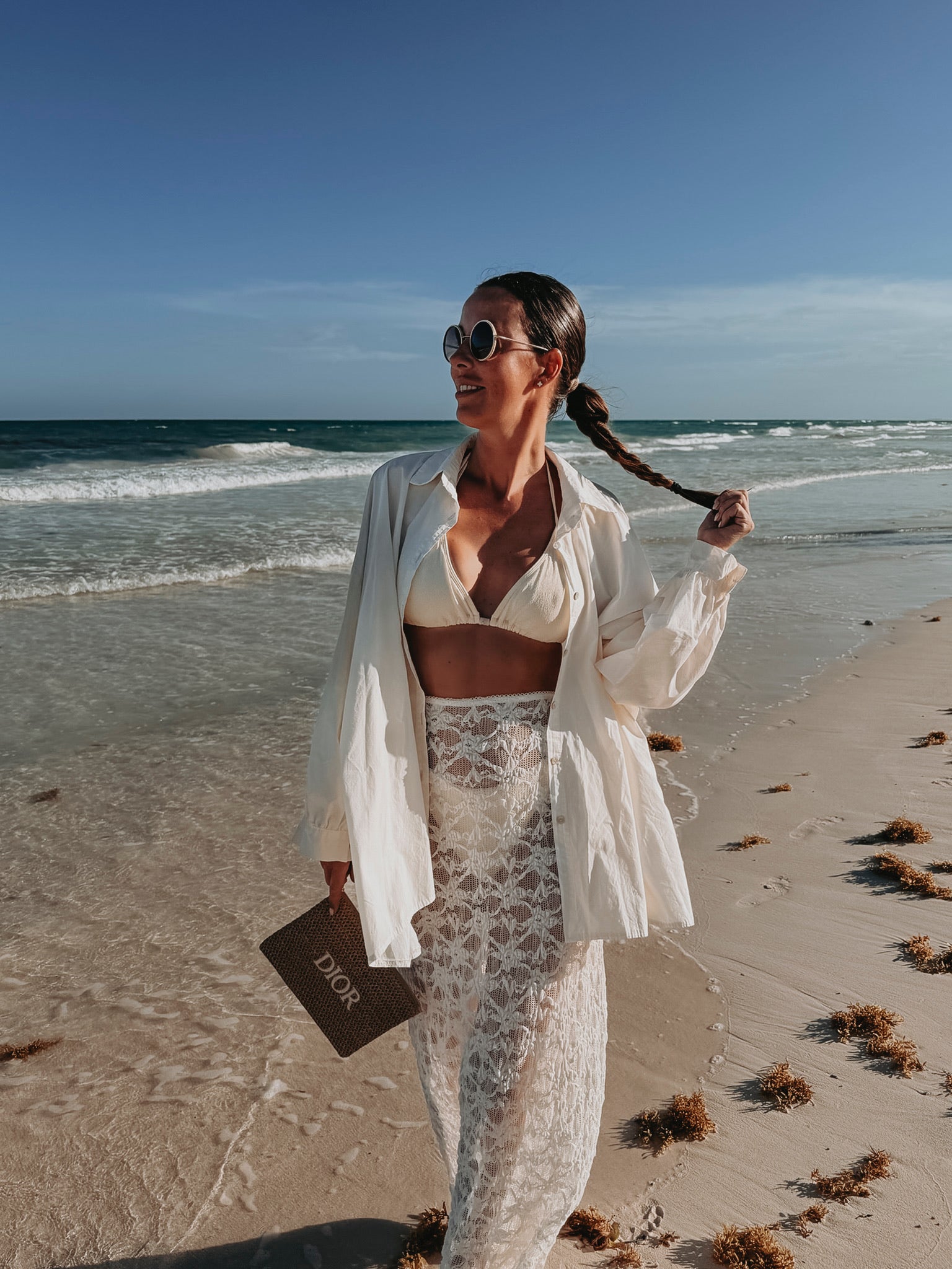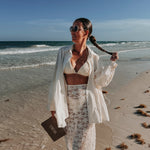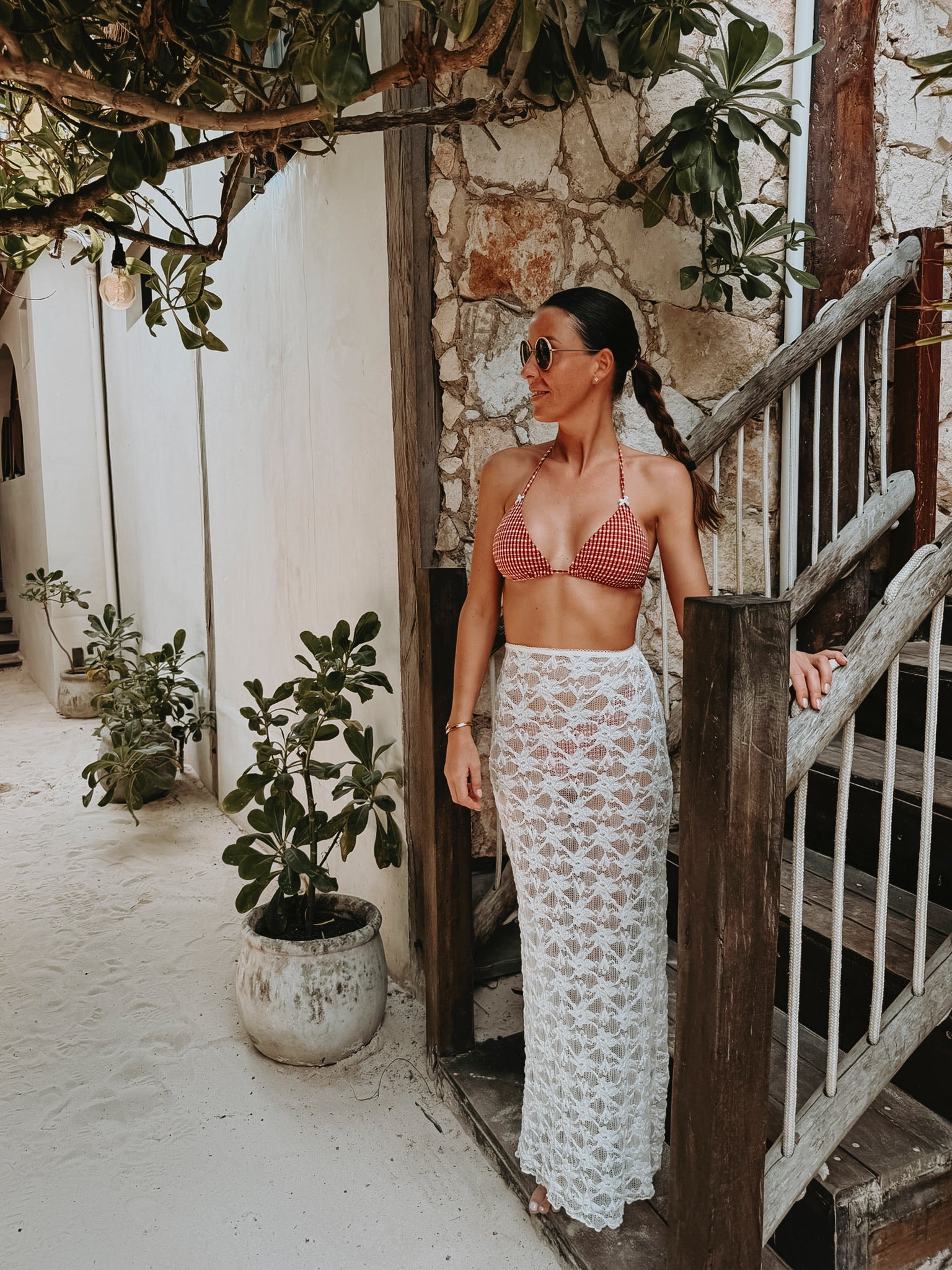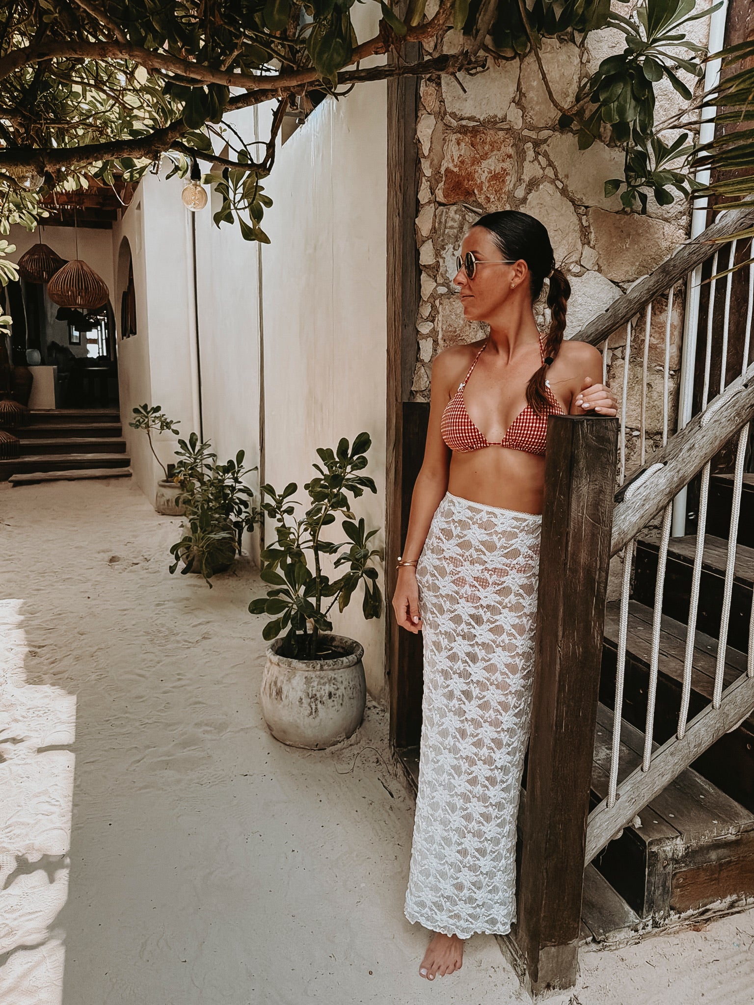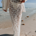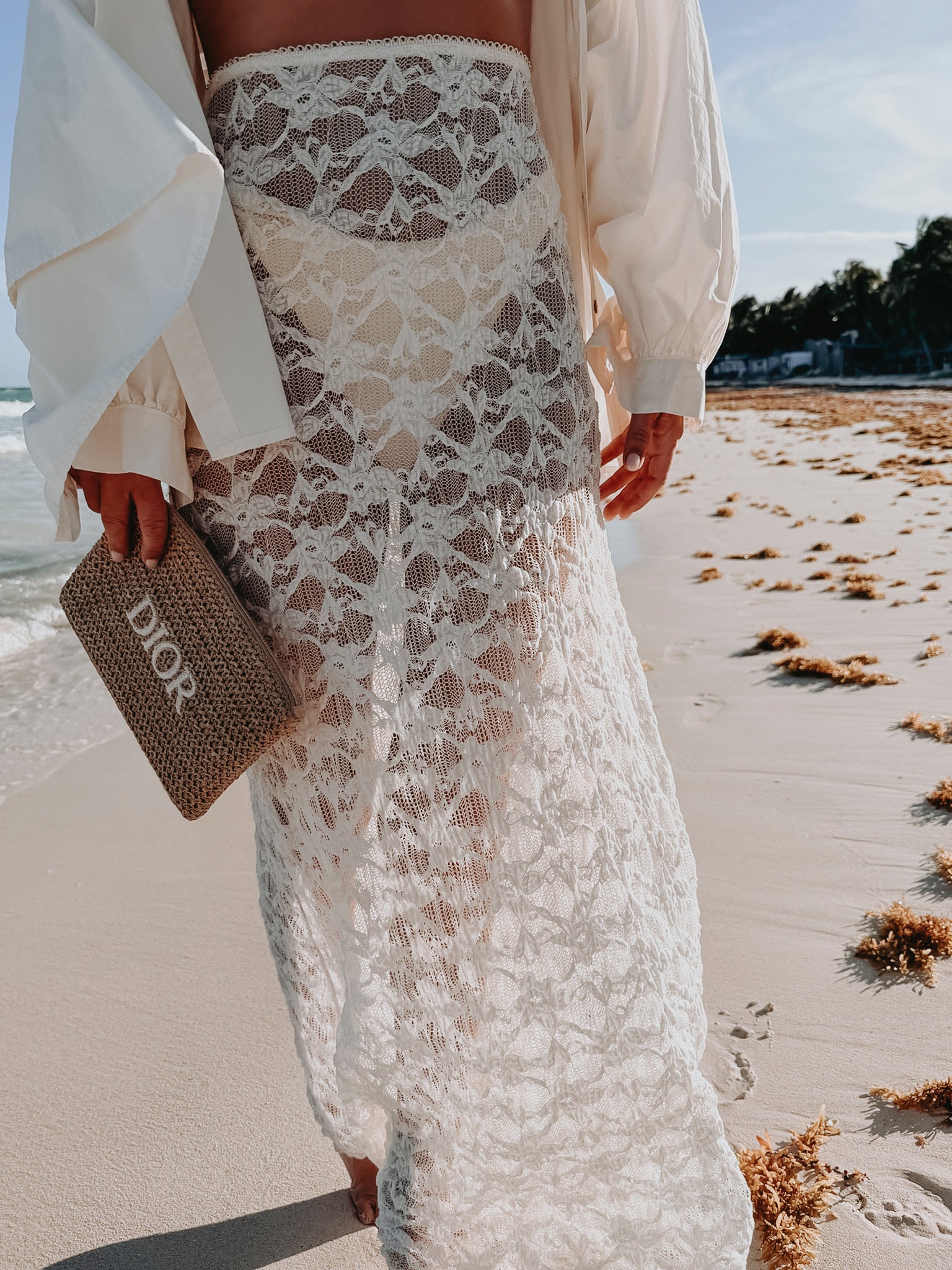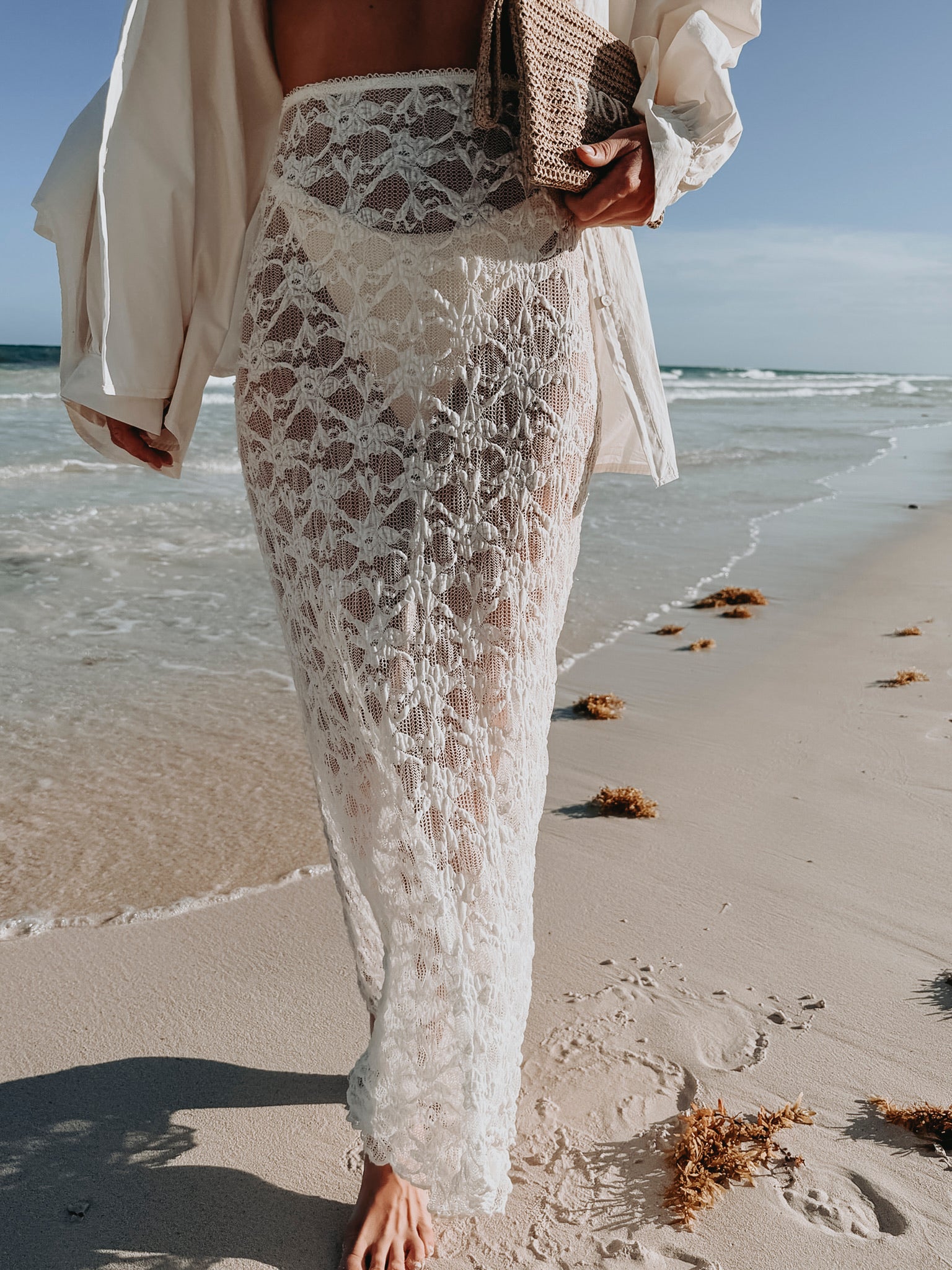 Een elegante lange kanten rok, perfect om over een bikini te dragen of te stylen met een trendy blouse of blazer voor een chique look.