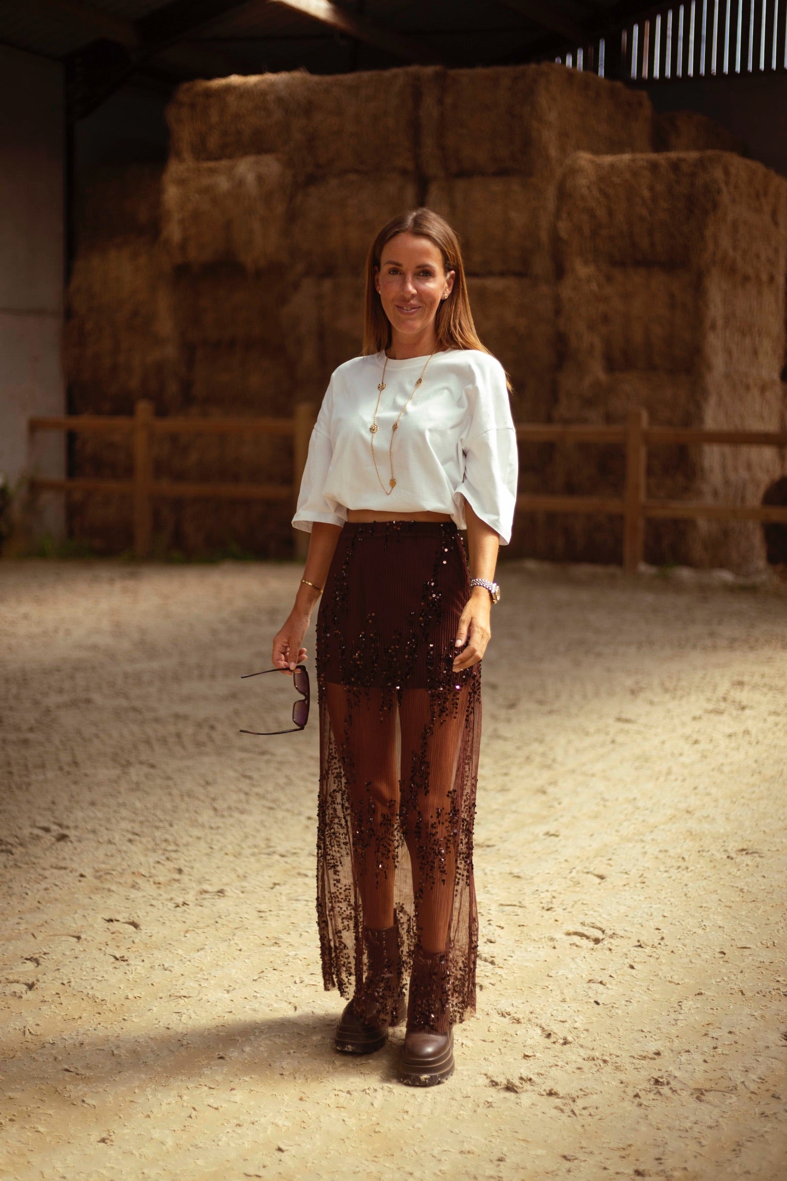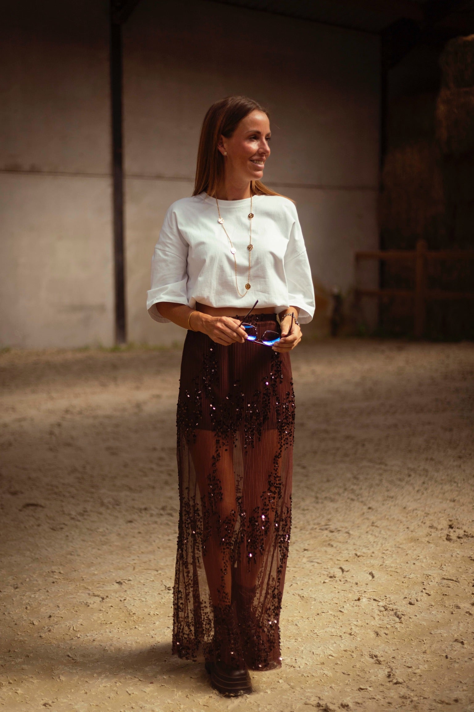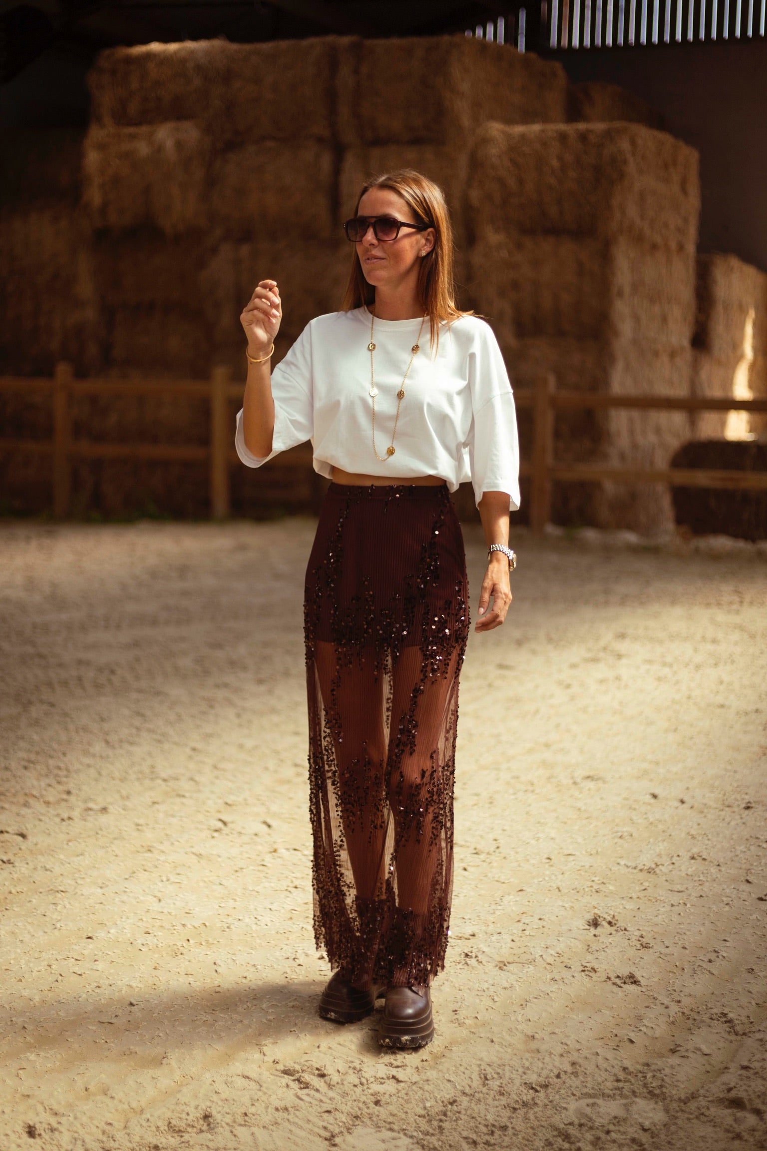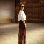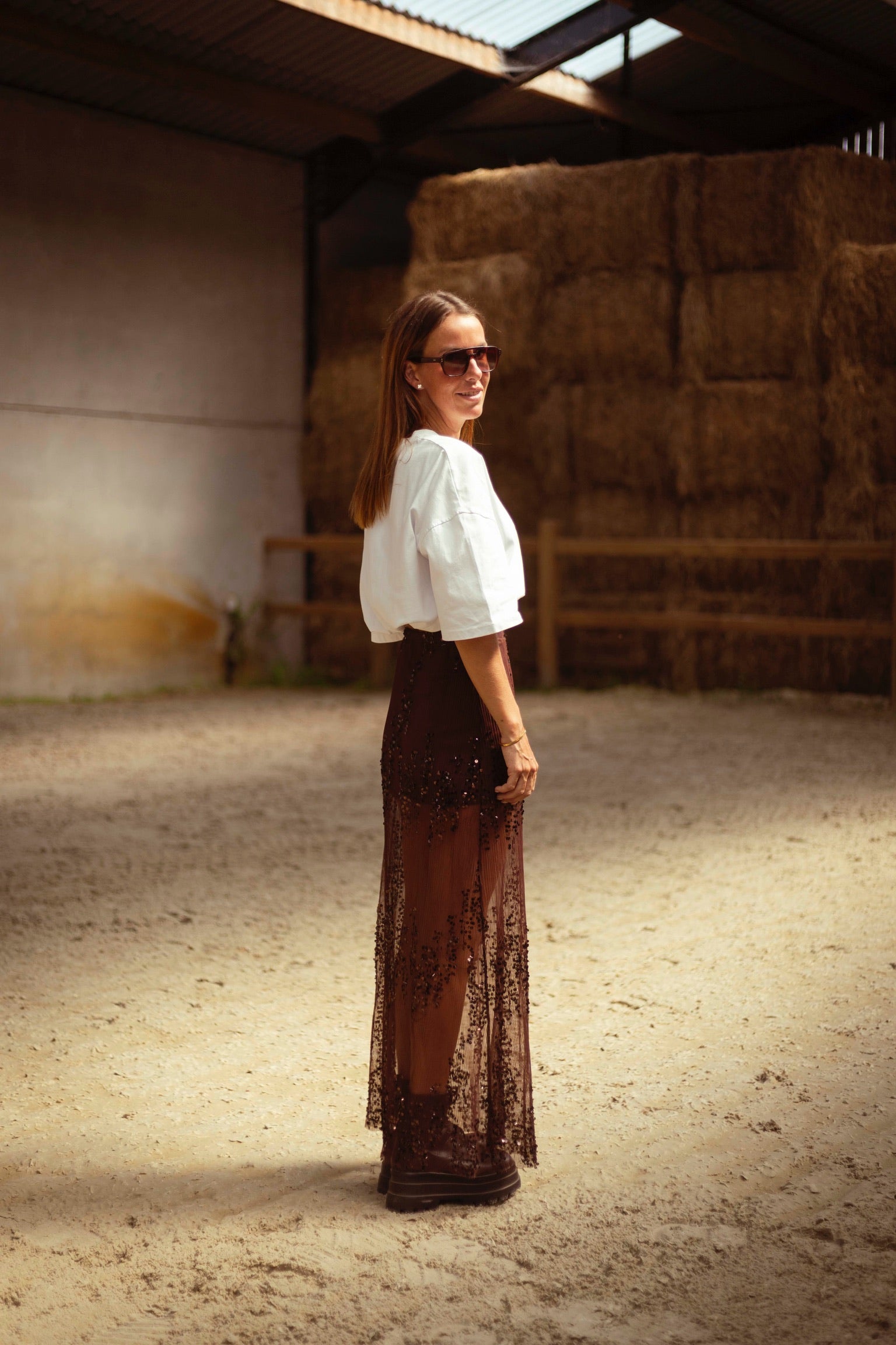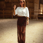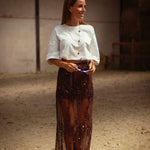 Een rokje in warme bruintint, rijkelijk afgewerkt met fonkelende pailletten die het licht vangen bij elke stap. De combinatie van western flair en subtiele glans maakt het perfect voor herfstdagen die nét dat tikkeltje meer mogen hebben. Draag met een grove knit of leren jasje voor een stoere, sprankelende look.