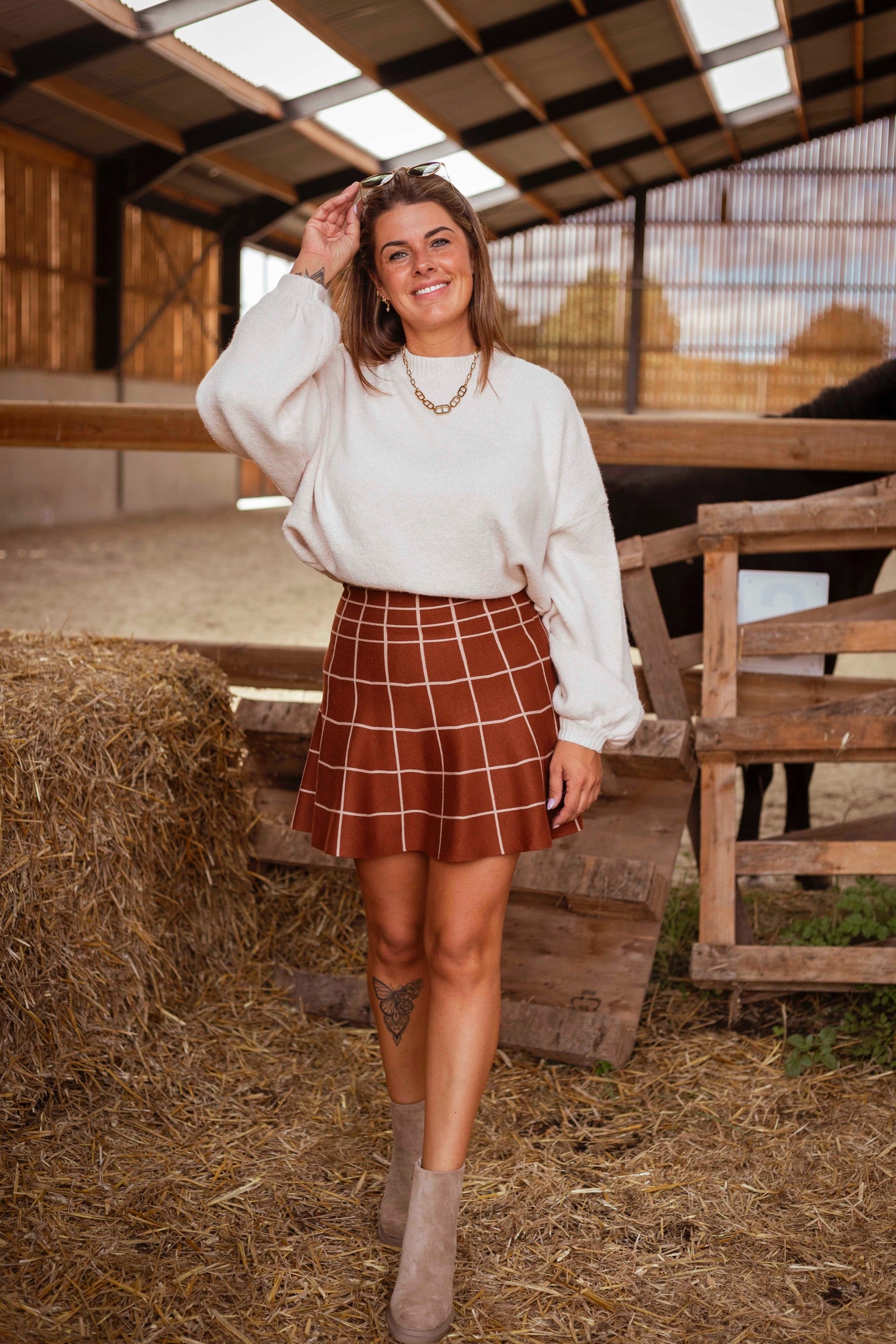 Deze geruite rok in warme camel- en bruintinten ademt herfst, met een klassieke print die nooit uit de mode raakt. De flatterende snit en rijke kleuren maken haar perfect voor gelaagde looks, van een chunky trui tot een lichte blouse met laarzen.