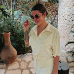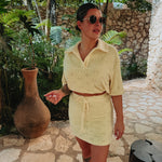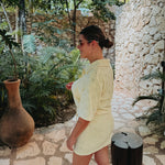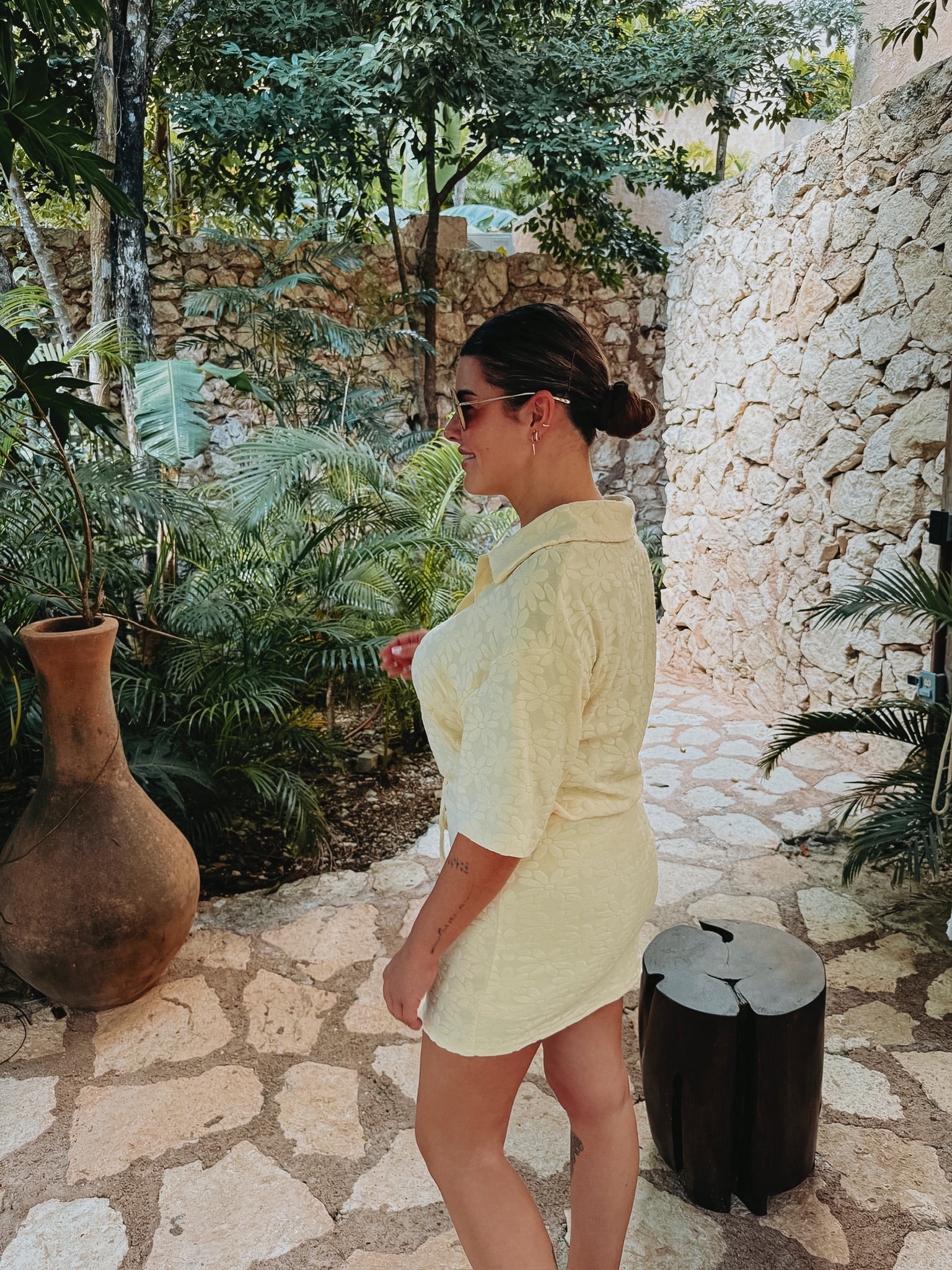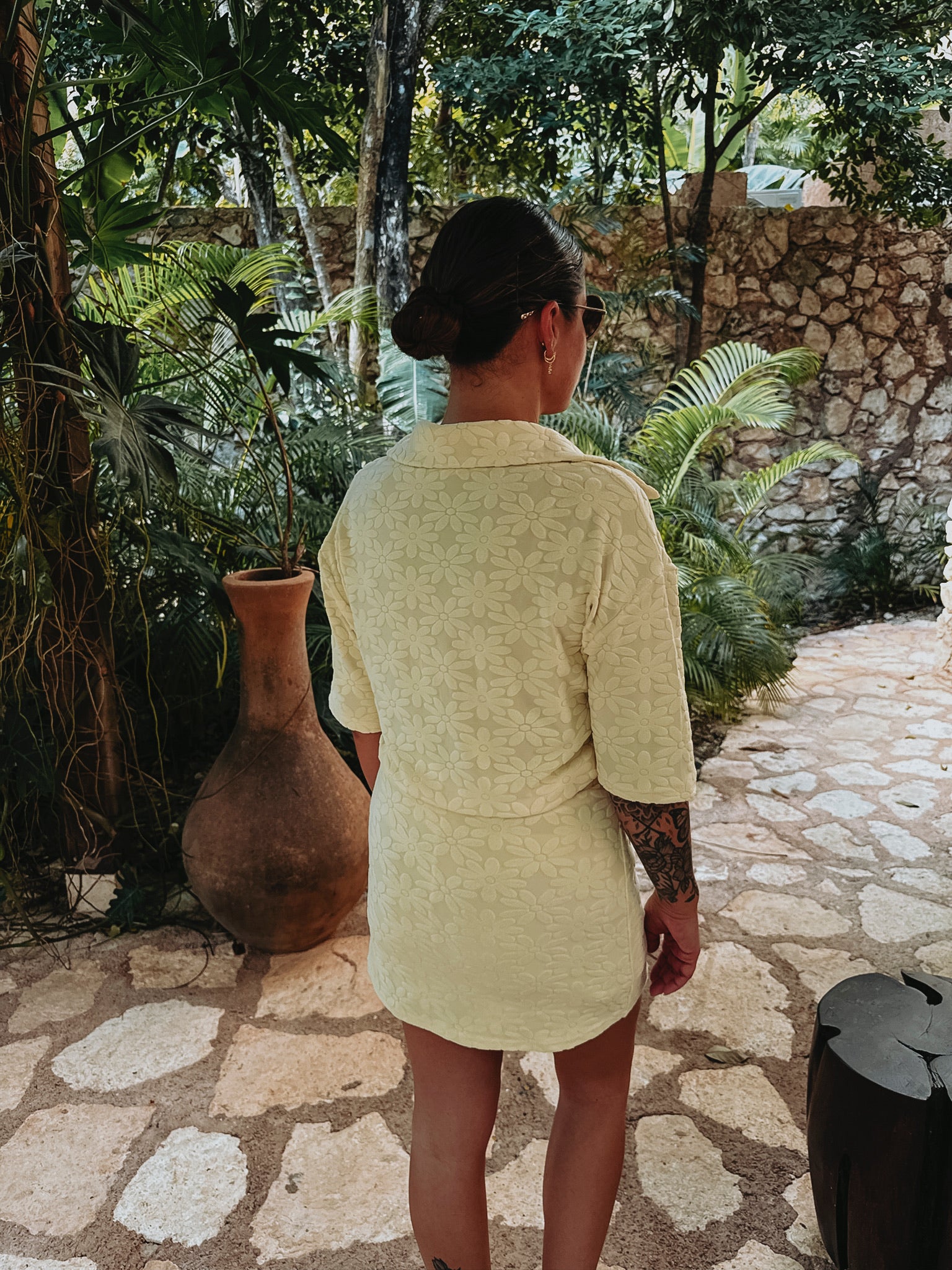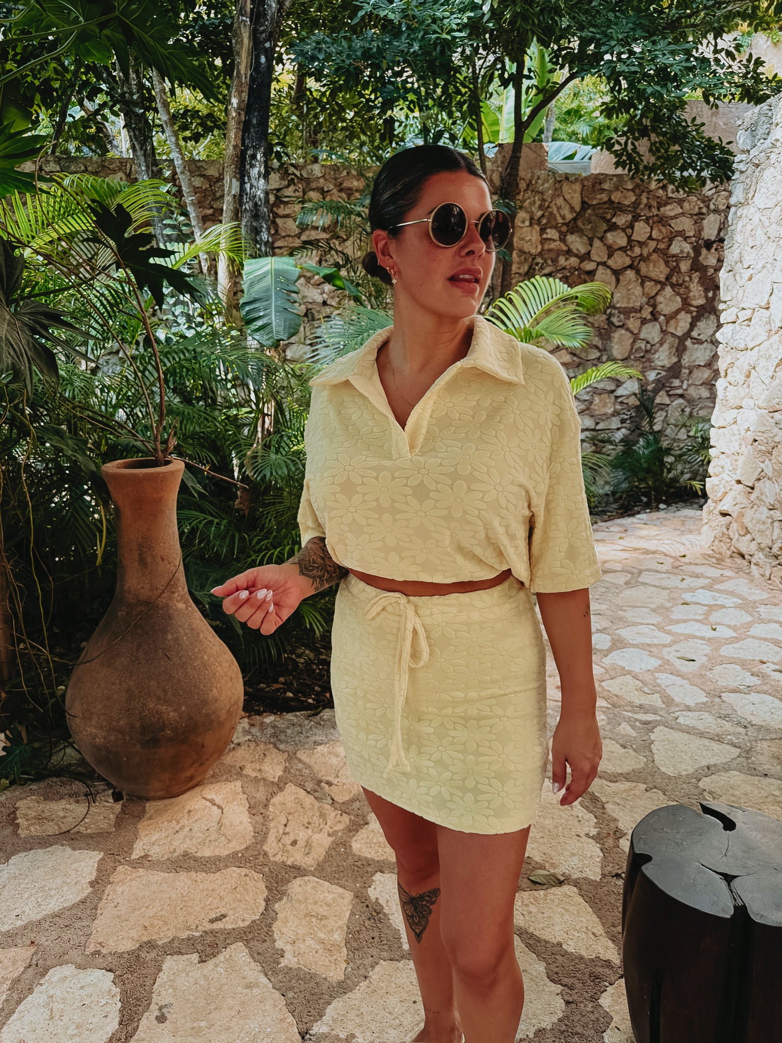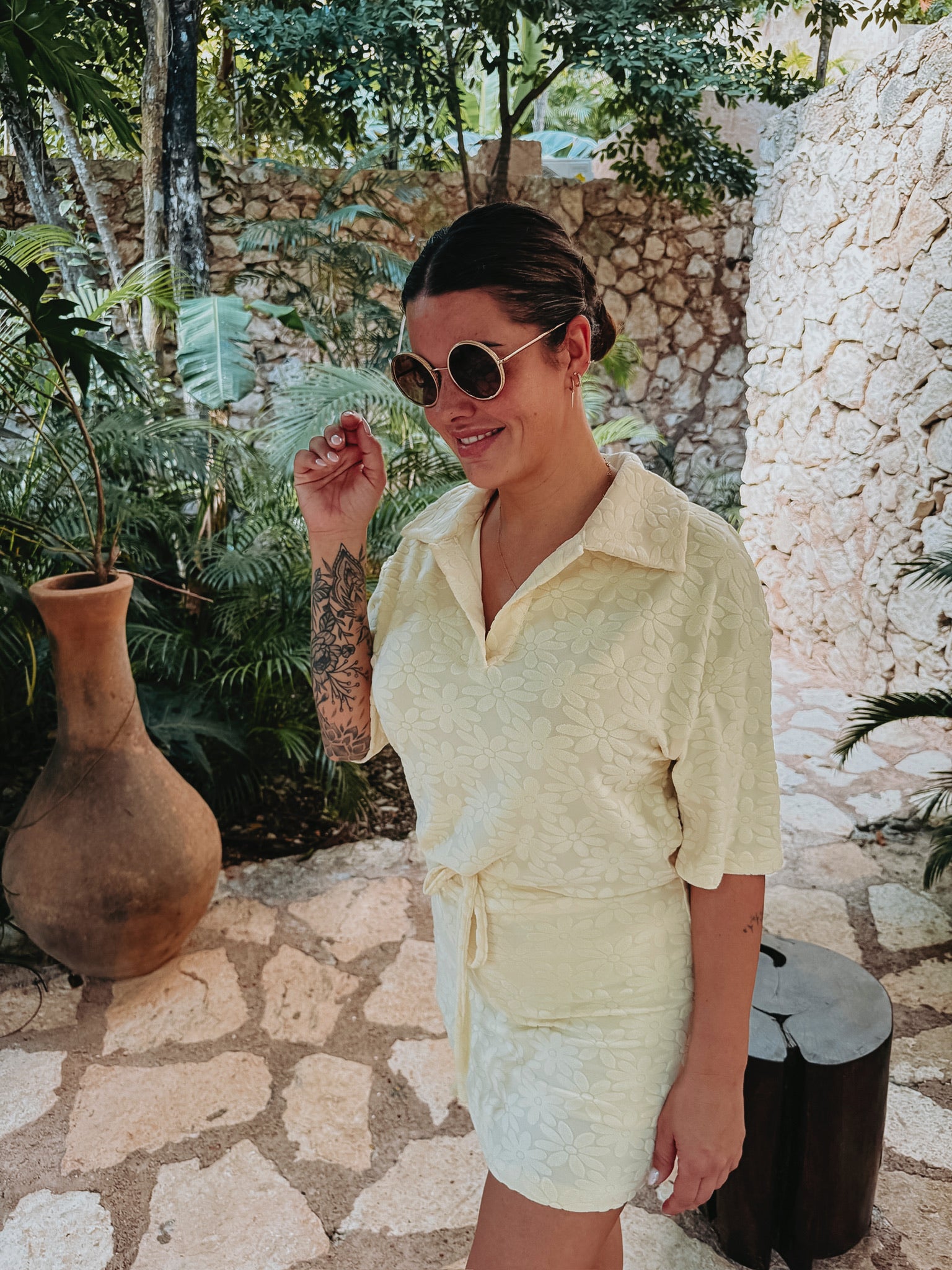 Een zonnige rok met shortje onder in botergeel met een speelse bloemenstructuur van sponsstof die luchtig meebeweegt. Draag hem met de bijpassende top of solo voor een vrolijke vakantievibe vol kleur en licht.