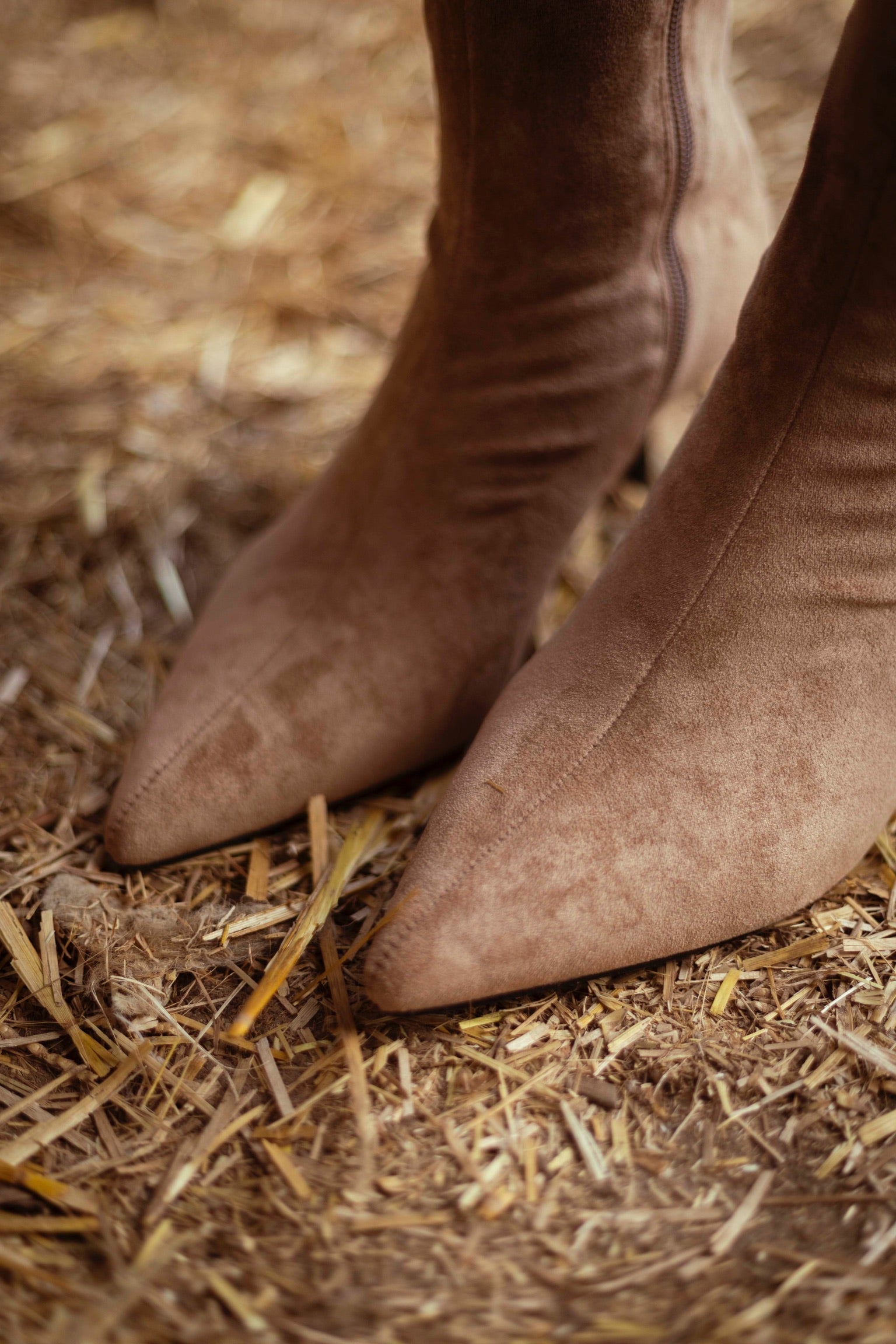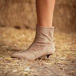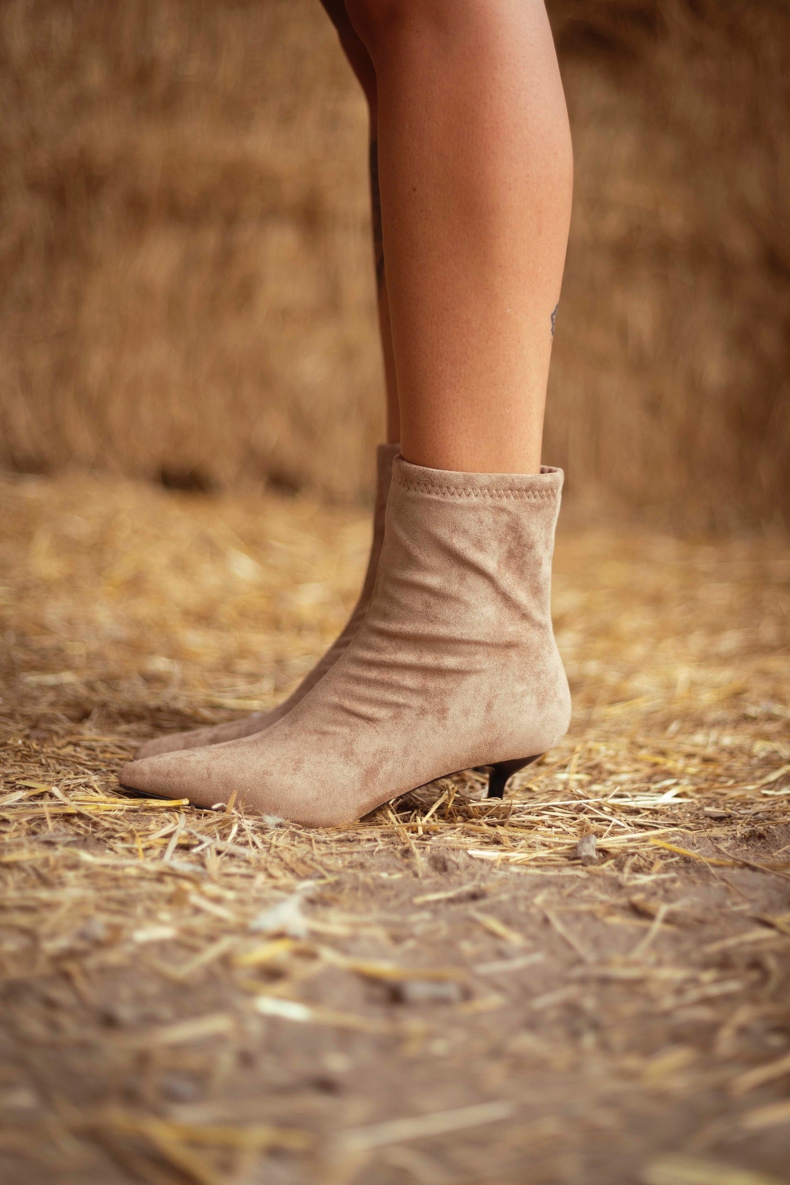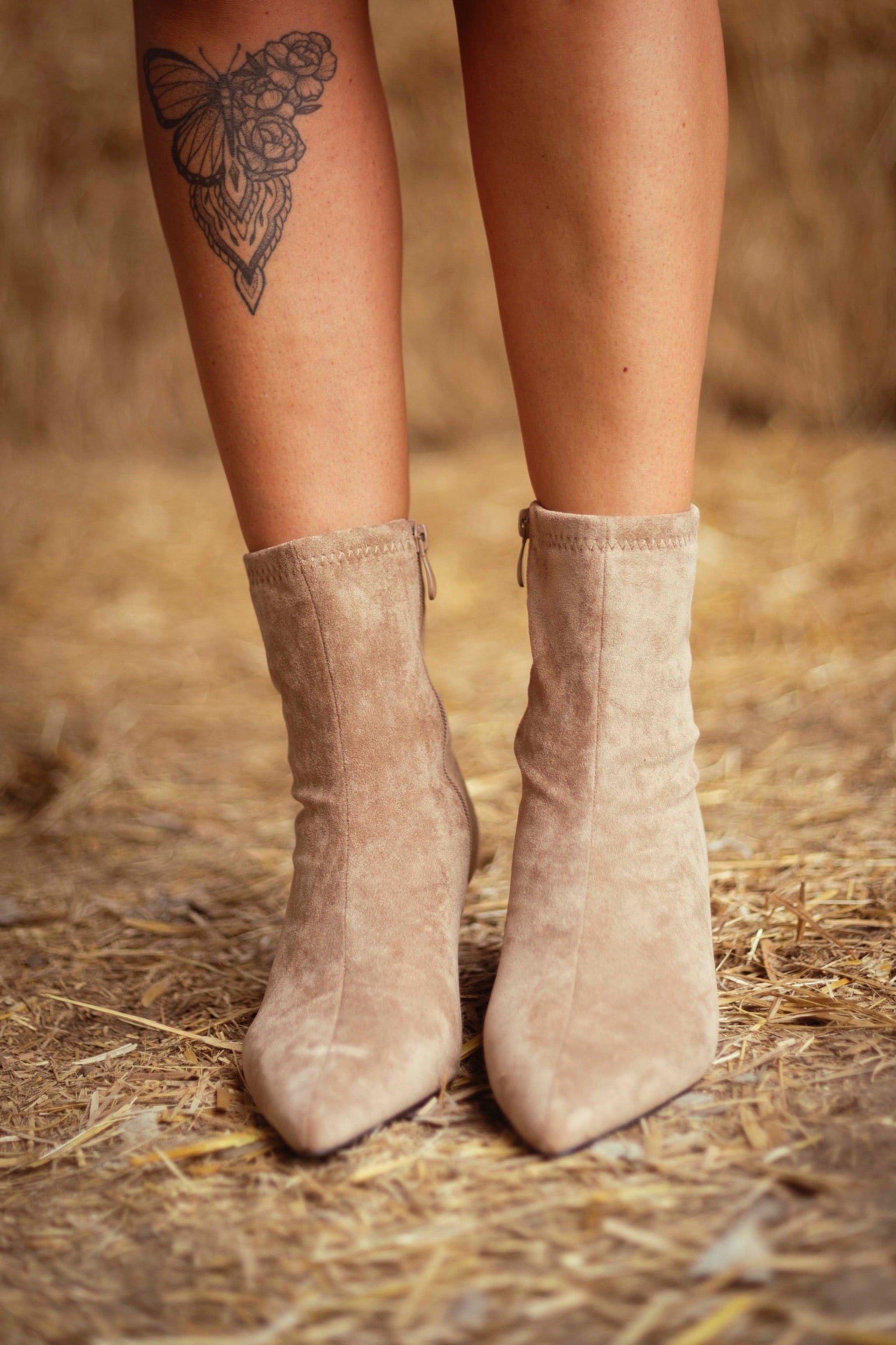 Beige suède enkellaarsjes met een elegante hak die warmte en stijl combineren. Ideaal om te dragen bij jurken, rokken of jeans voor een verfijnde herfstlook.