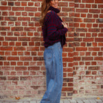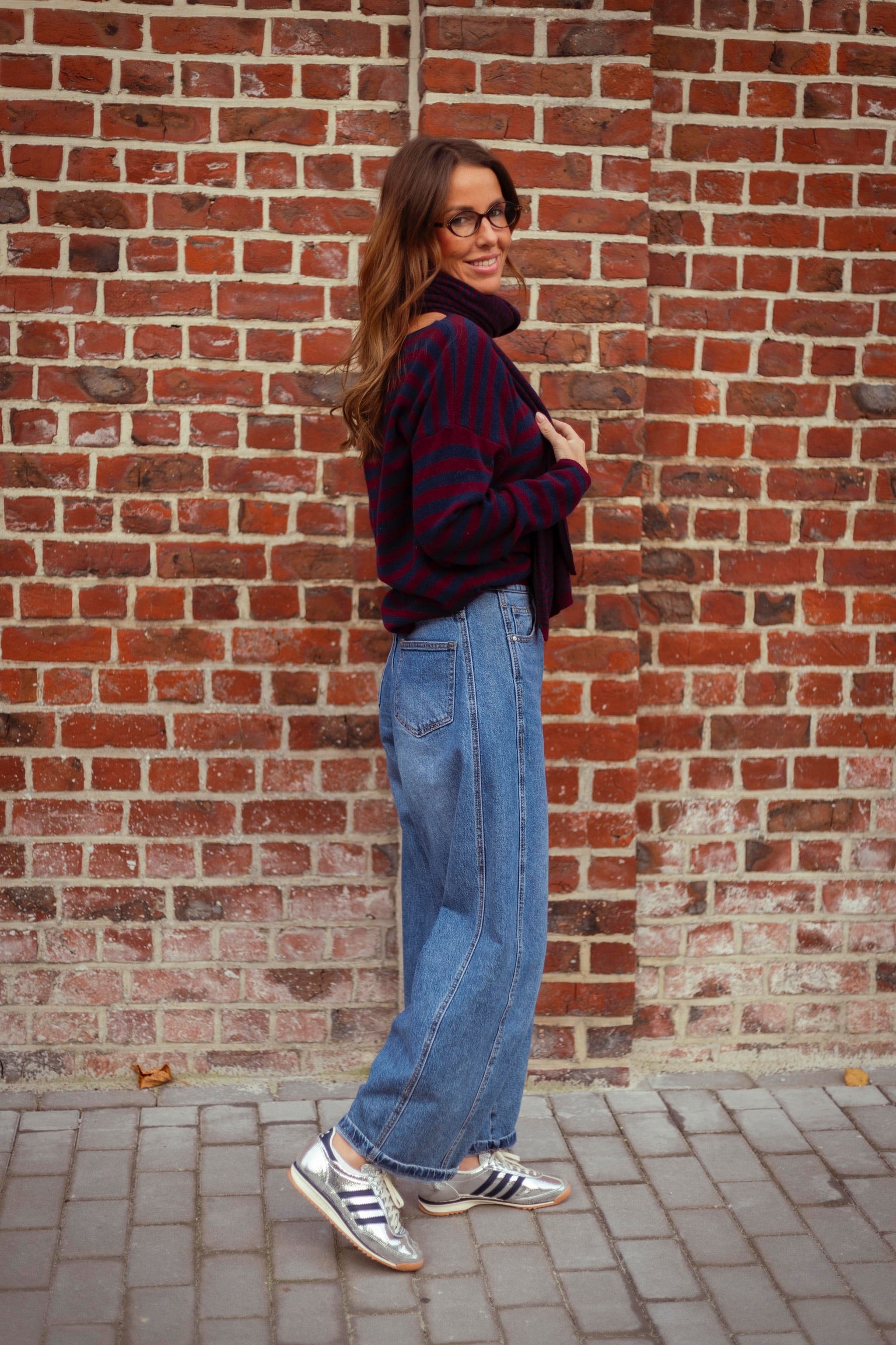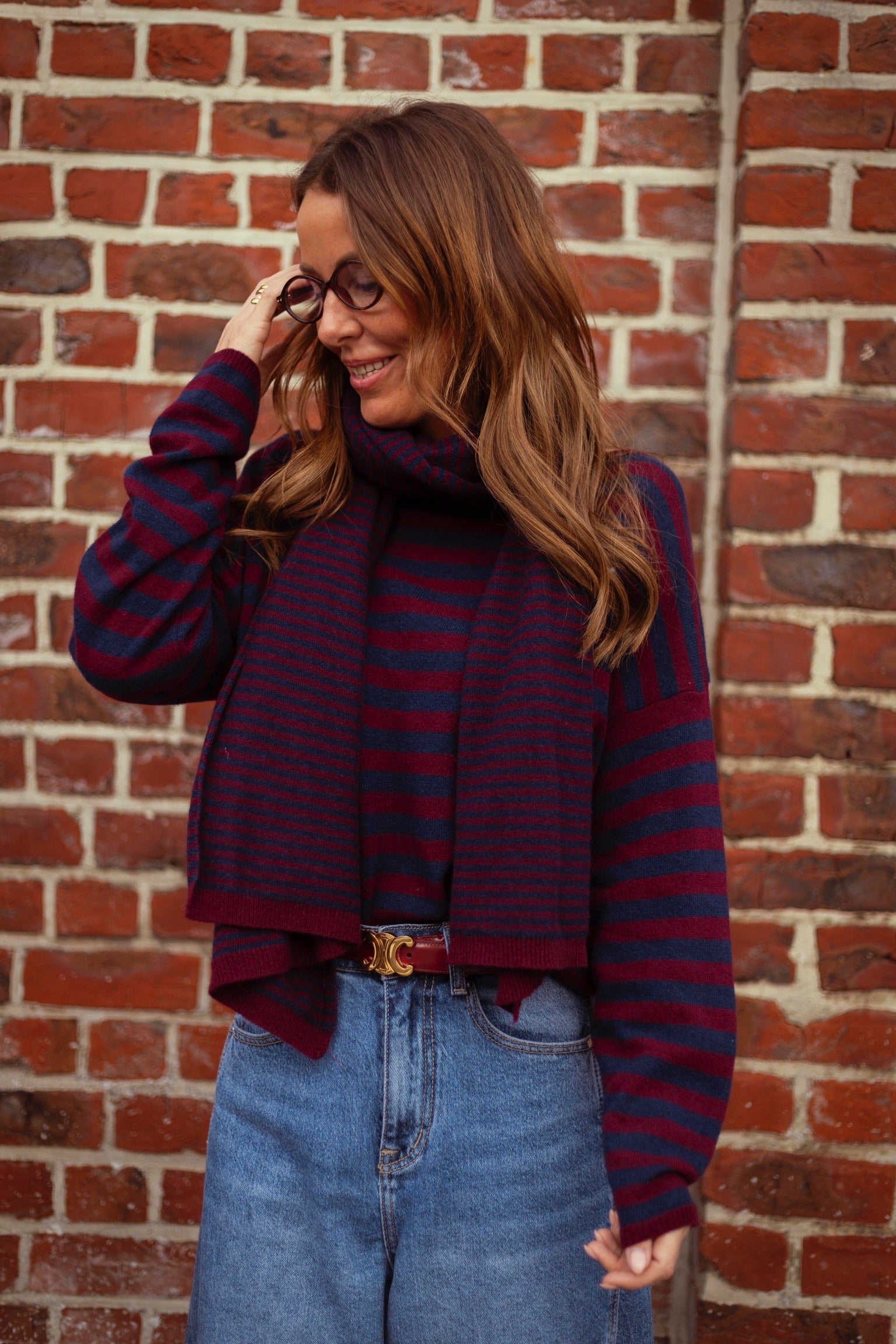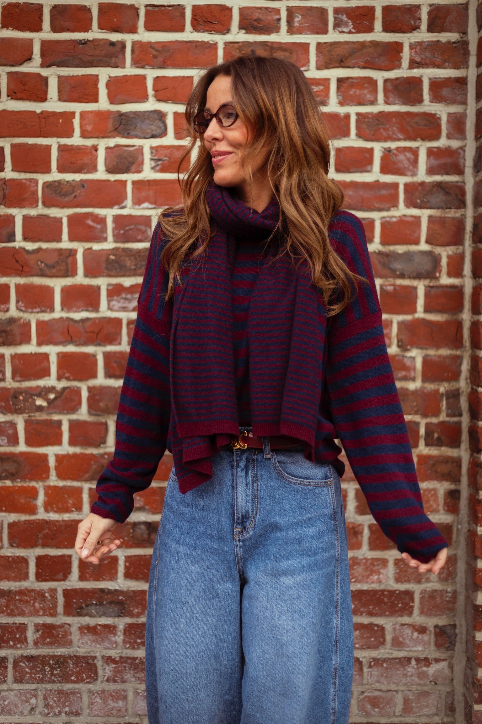 Een gezellige, warme trui die perfect is voor koude dagen. De bordeaux- en donkerblauwe strepen geven een stijlvolle uitstraling en maken het makkelijk te combineren met de bijpassende sjaal of los te dragen.