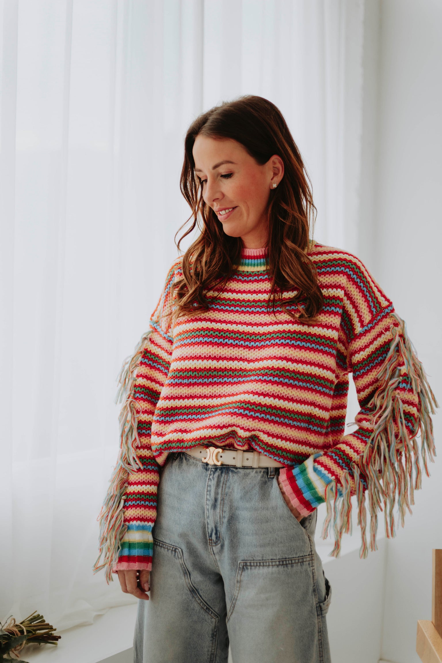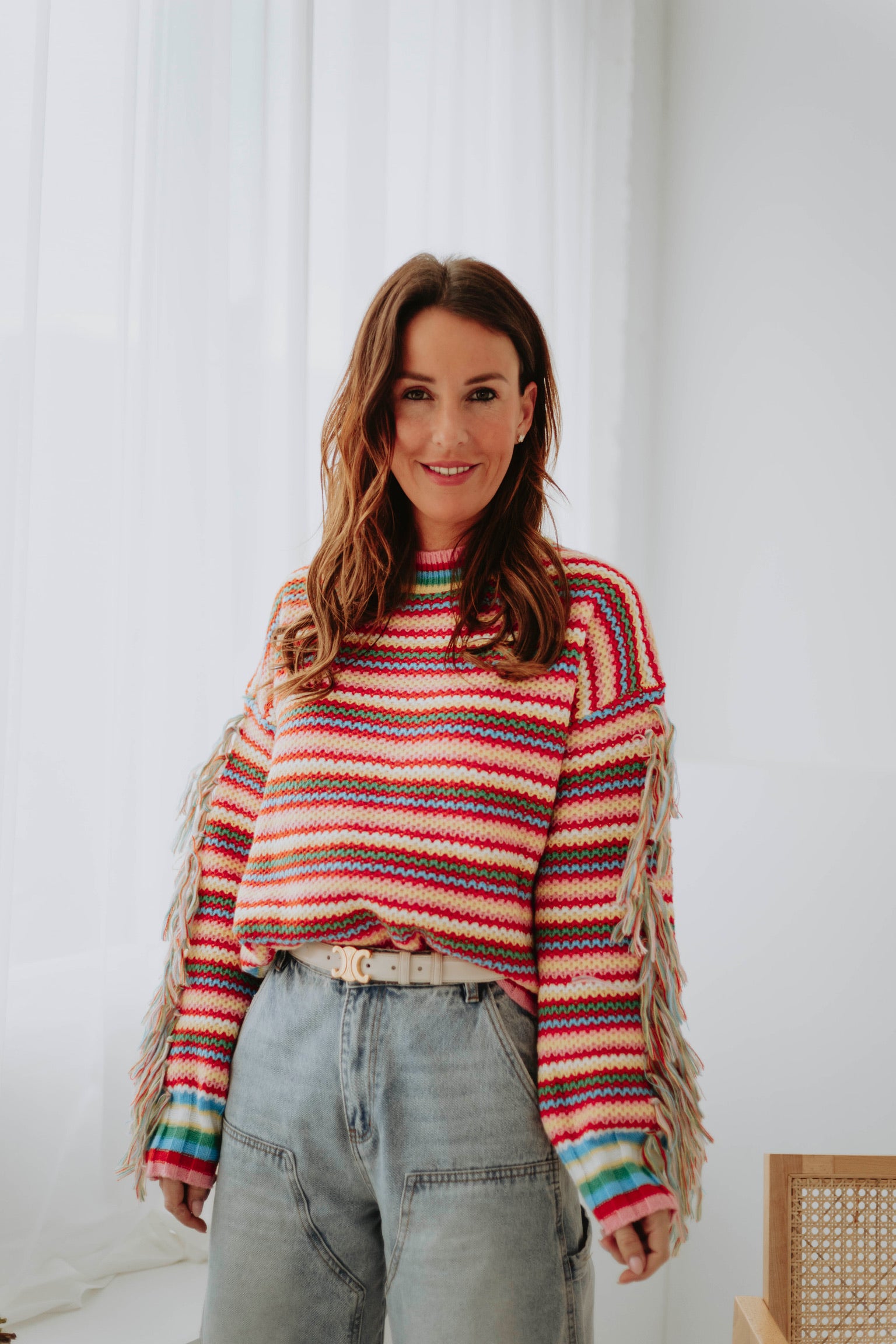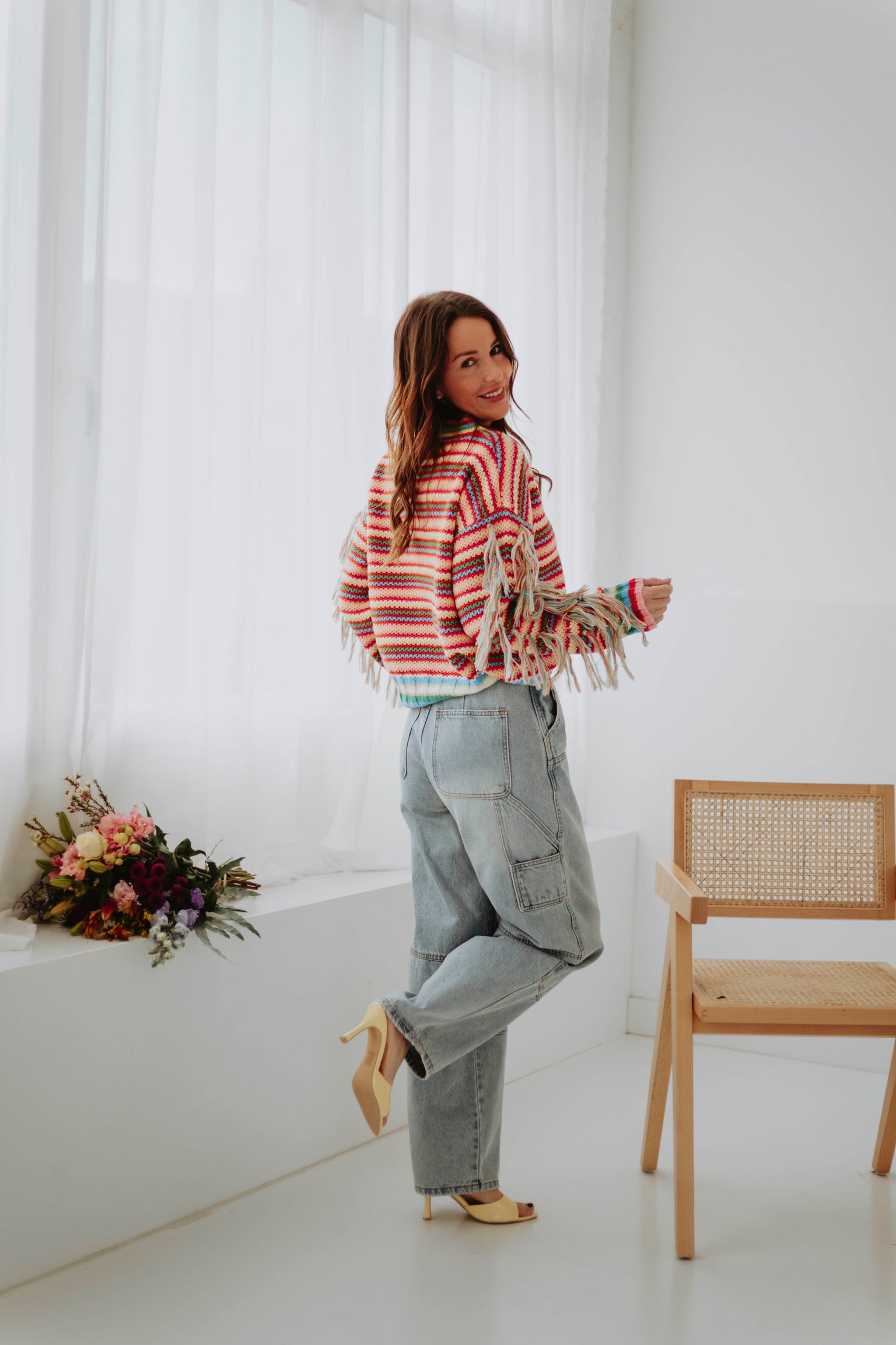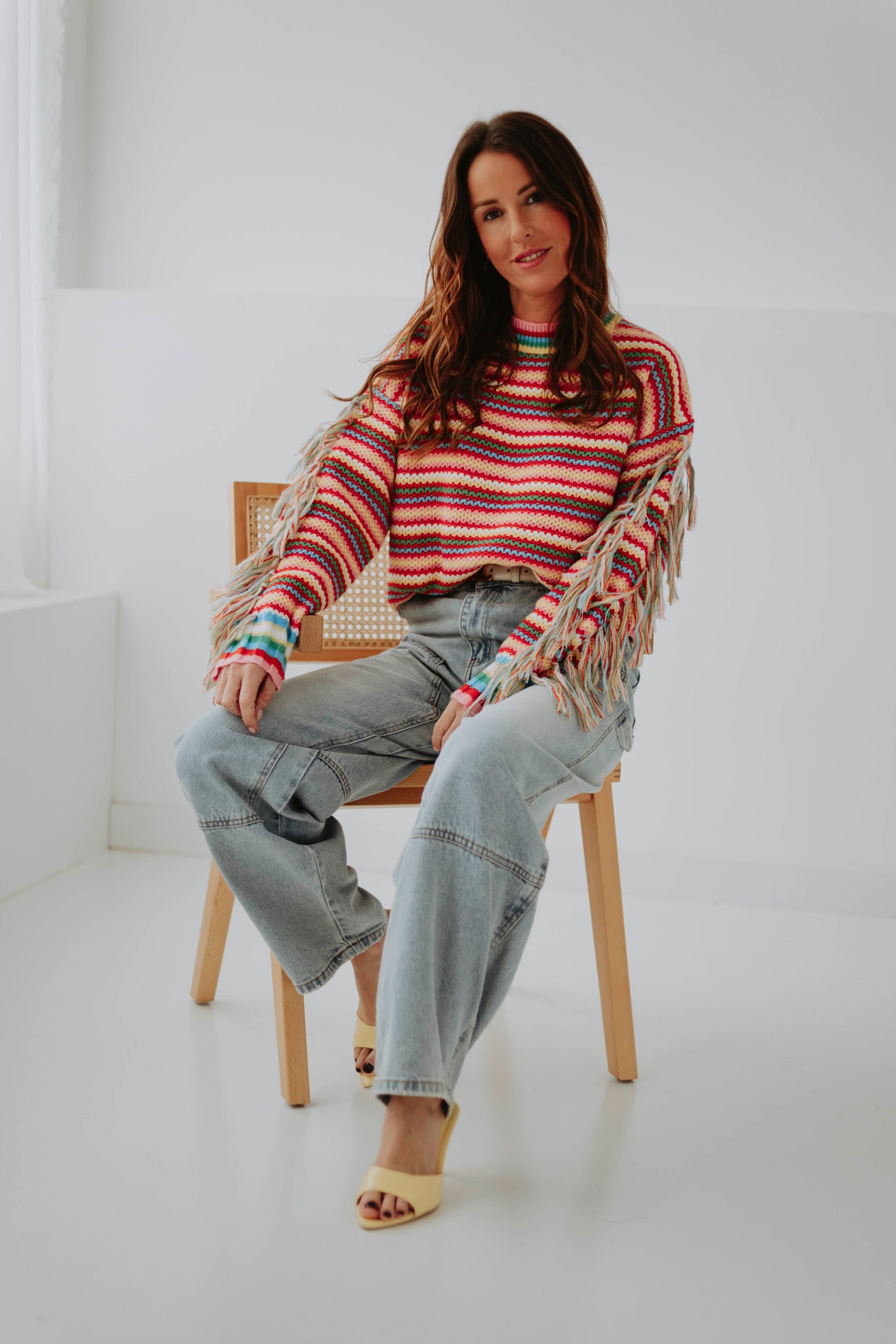 Een vrolijke knit die meteen kleur en energie toevoegt aan je voorjaarslook. De speelse strepen zorgen voor een frisse, trendy uitstraling, terwijl de franjes aan de mouwen net dat extra detail geven. Perfect om je outfit een zonnige twist te geven.