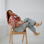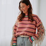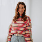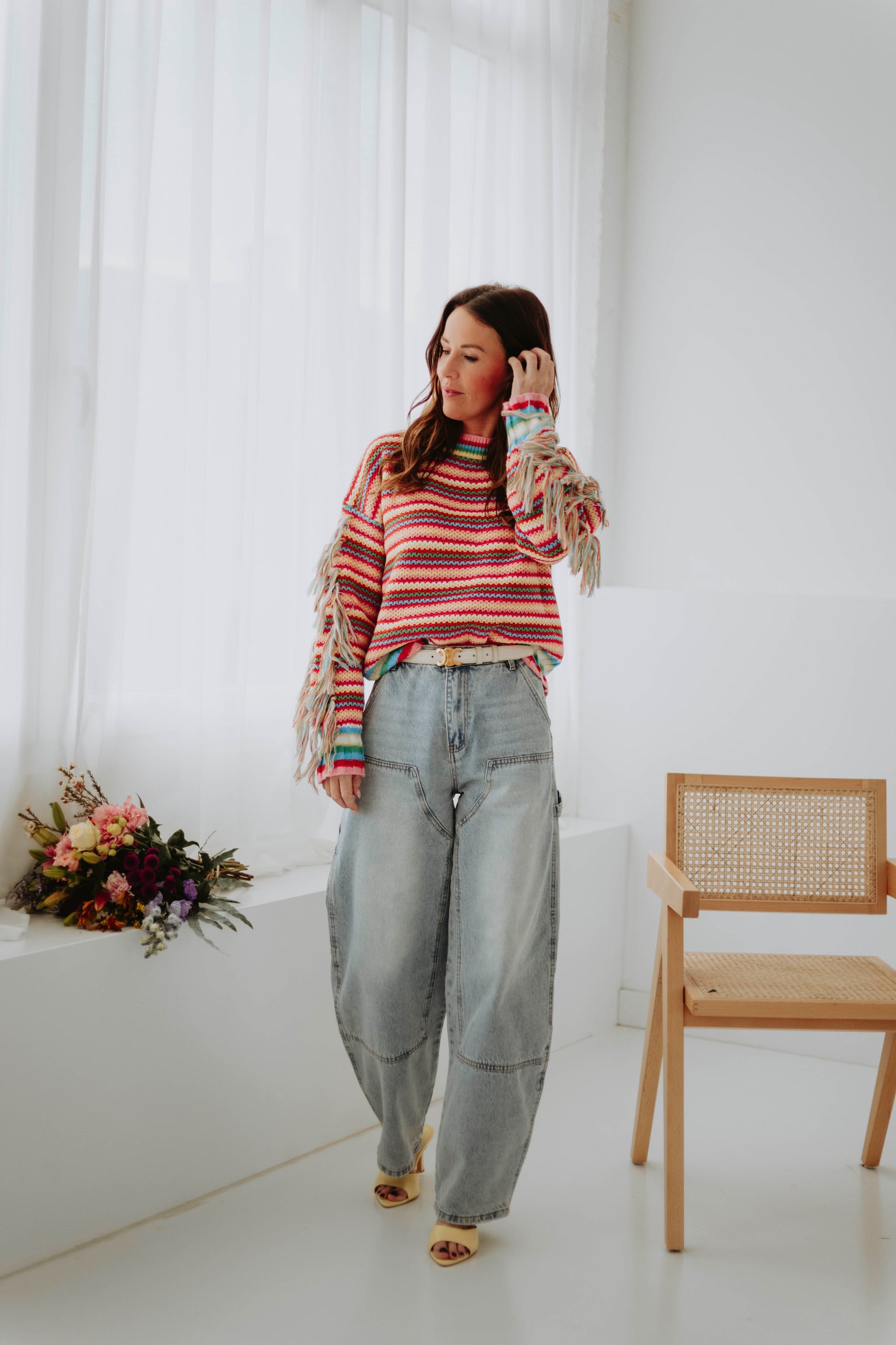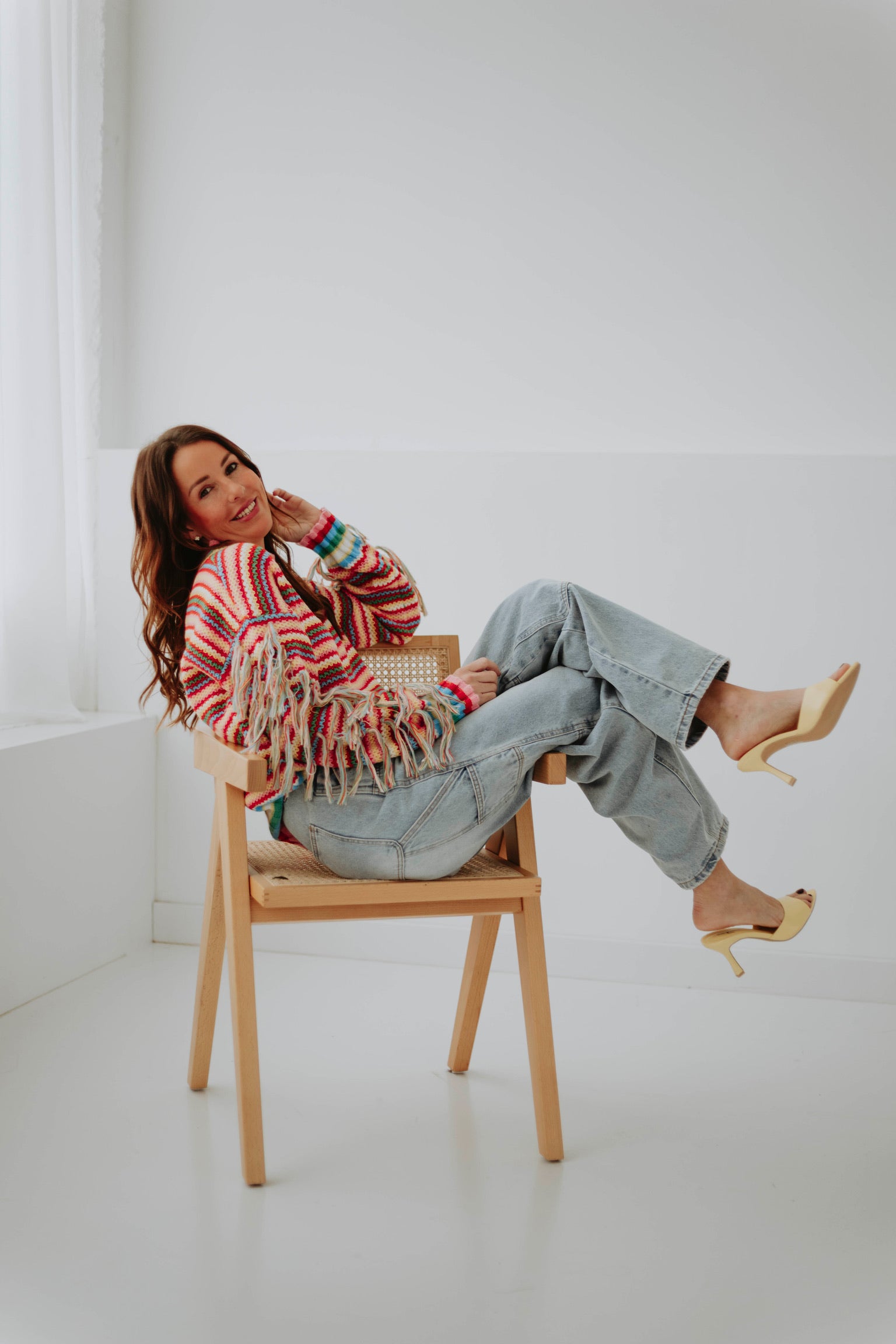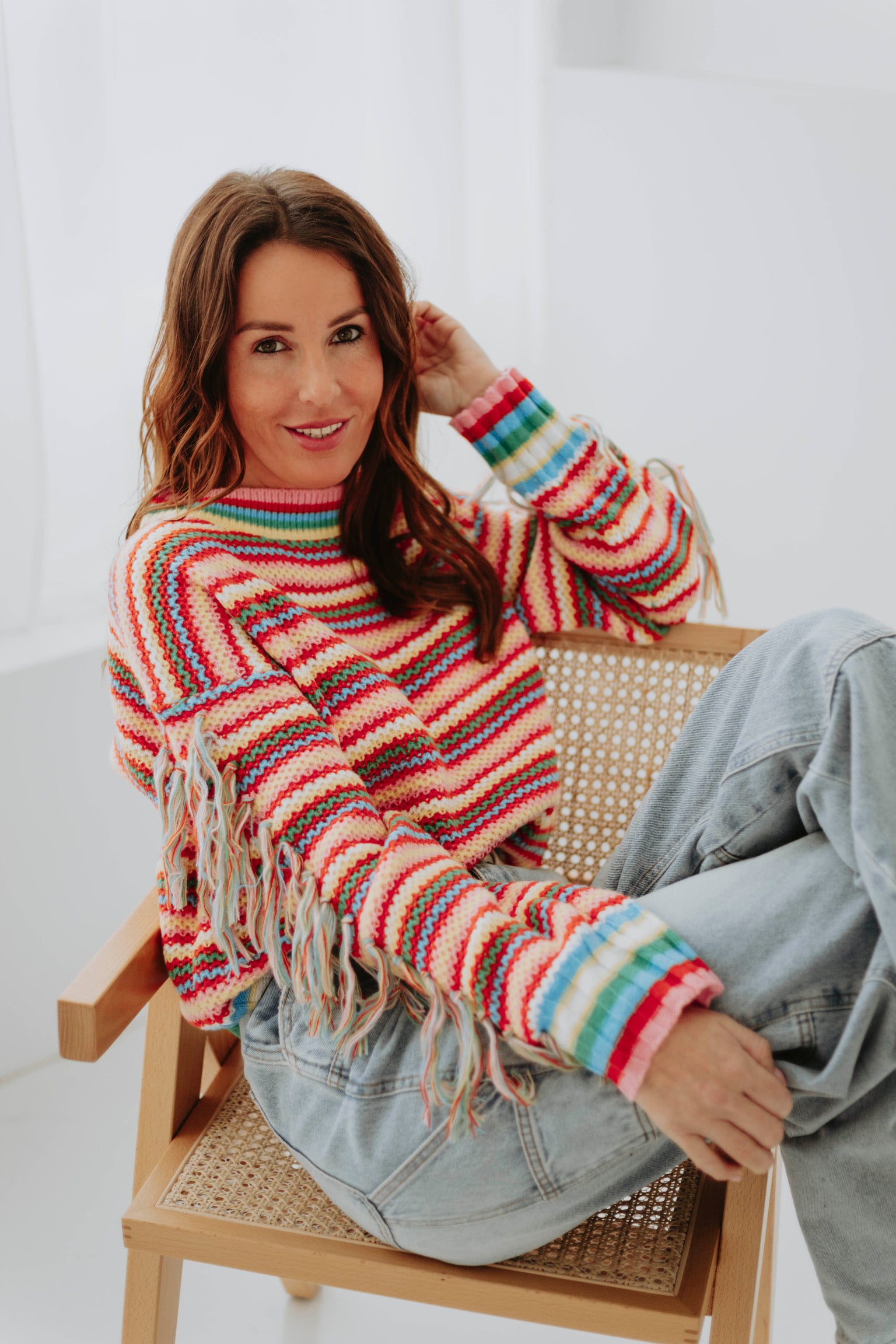 Een vrolijke knit die meteen kleur en energie toevoegt aan je voorjaarslook. De speelse strepen zorgen voor een frisse, trendy uitstraling, terwijl de franjes aan de mouwen net dat extra detail geven. Perfect om je outfit een zonnige twist te geven.