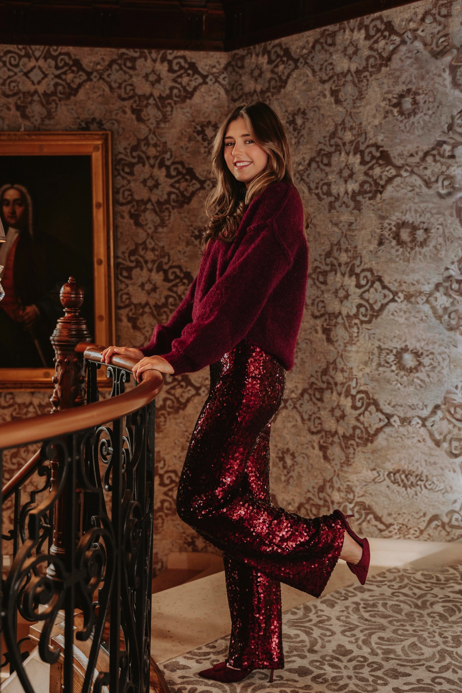 Een warme en stijlvolle bordeauxkleurige trui die een gezellige en feestelijke uitstraling geeft. Het zachte materiaal zorgt voor comfort zonder in te boeten aan elegantie. Perfect om tijdens de feestdagen zowel relaxed als chic voor de dag te komen.