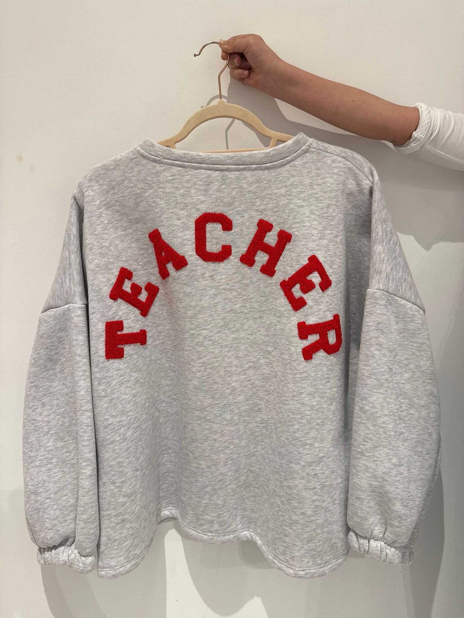 Een cozy sweater met grote, opvallende rode letters die TEACHER  achteraan dragen.  Perfect cadeautje voor onder de kerstboom !