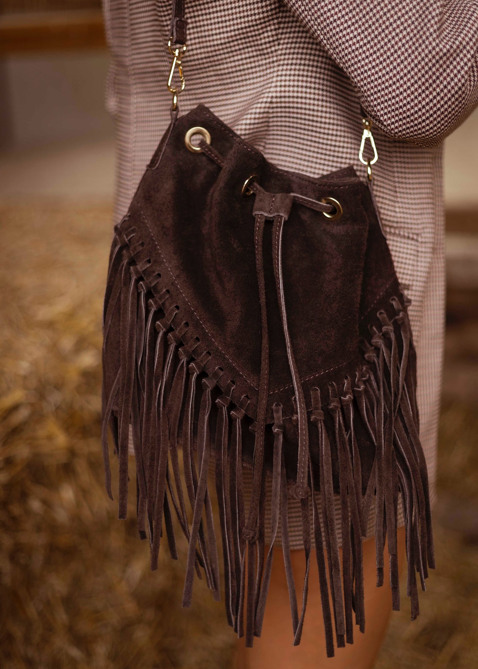 FALLEN LEAVES BROWN FRINGE BUCKET BAG