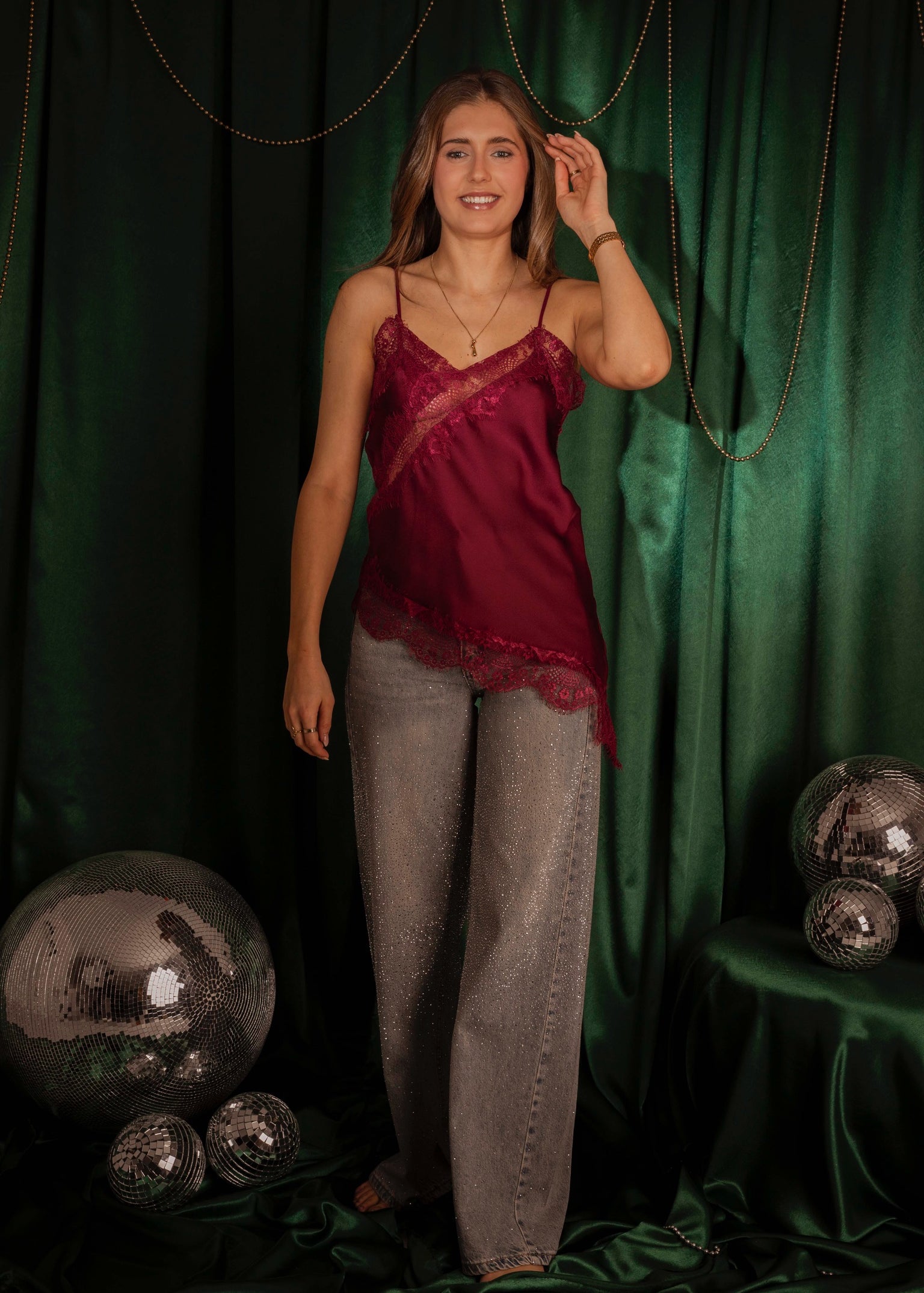 SANTA SHINE BORDEAUX ASYMMETRIC SATIN LACE TOP