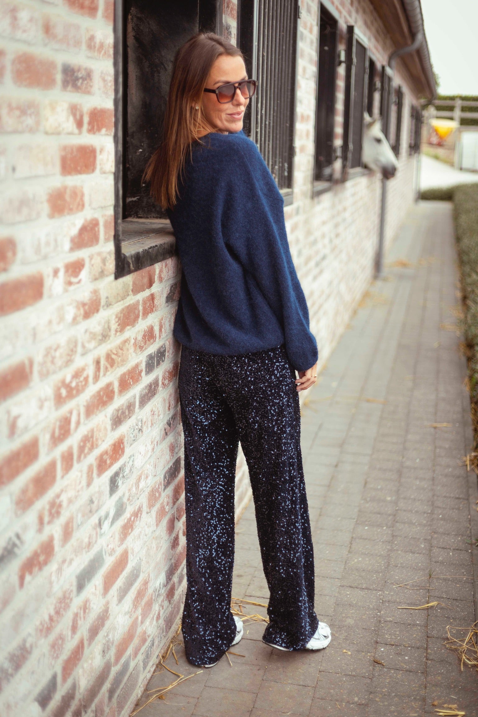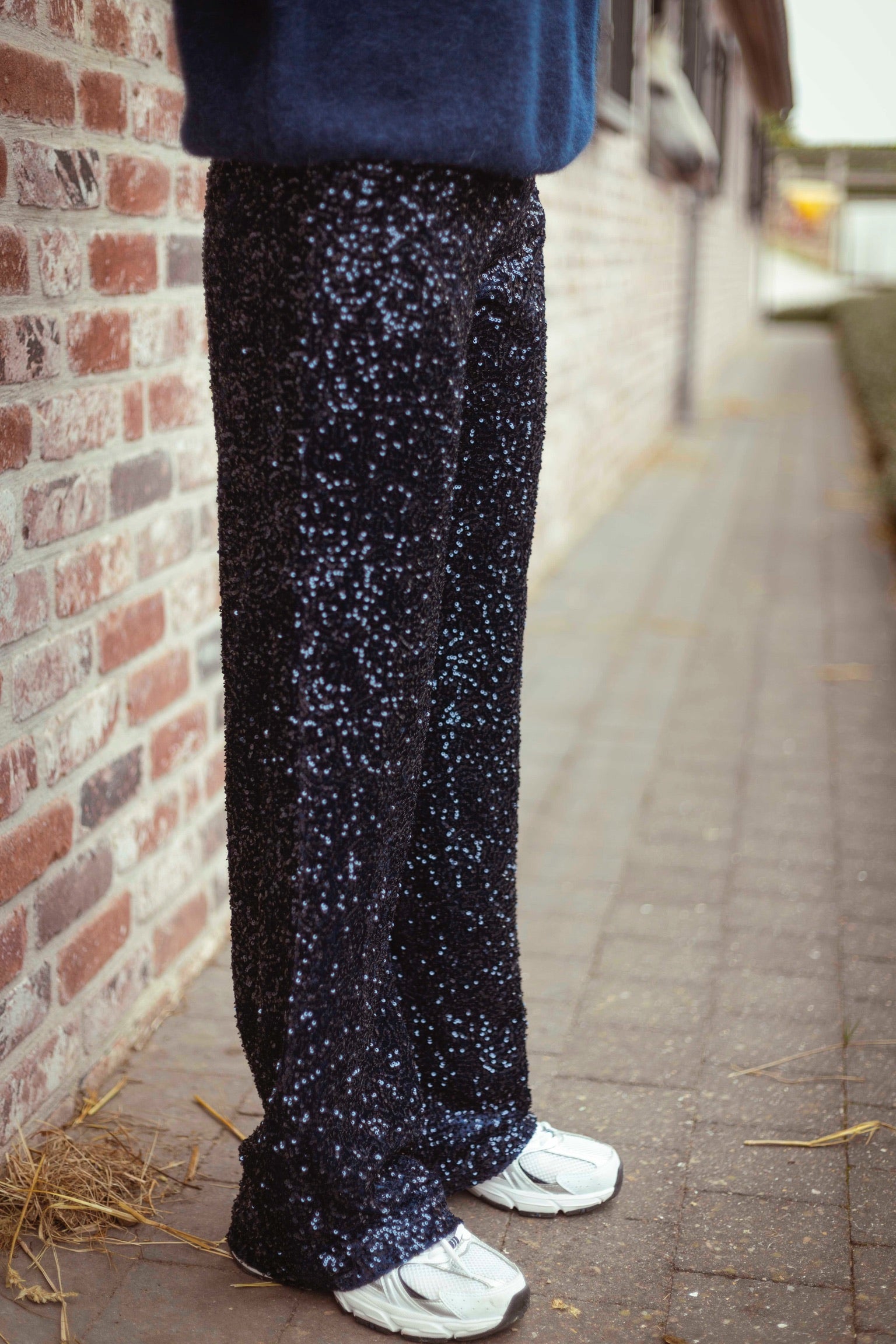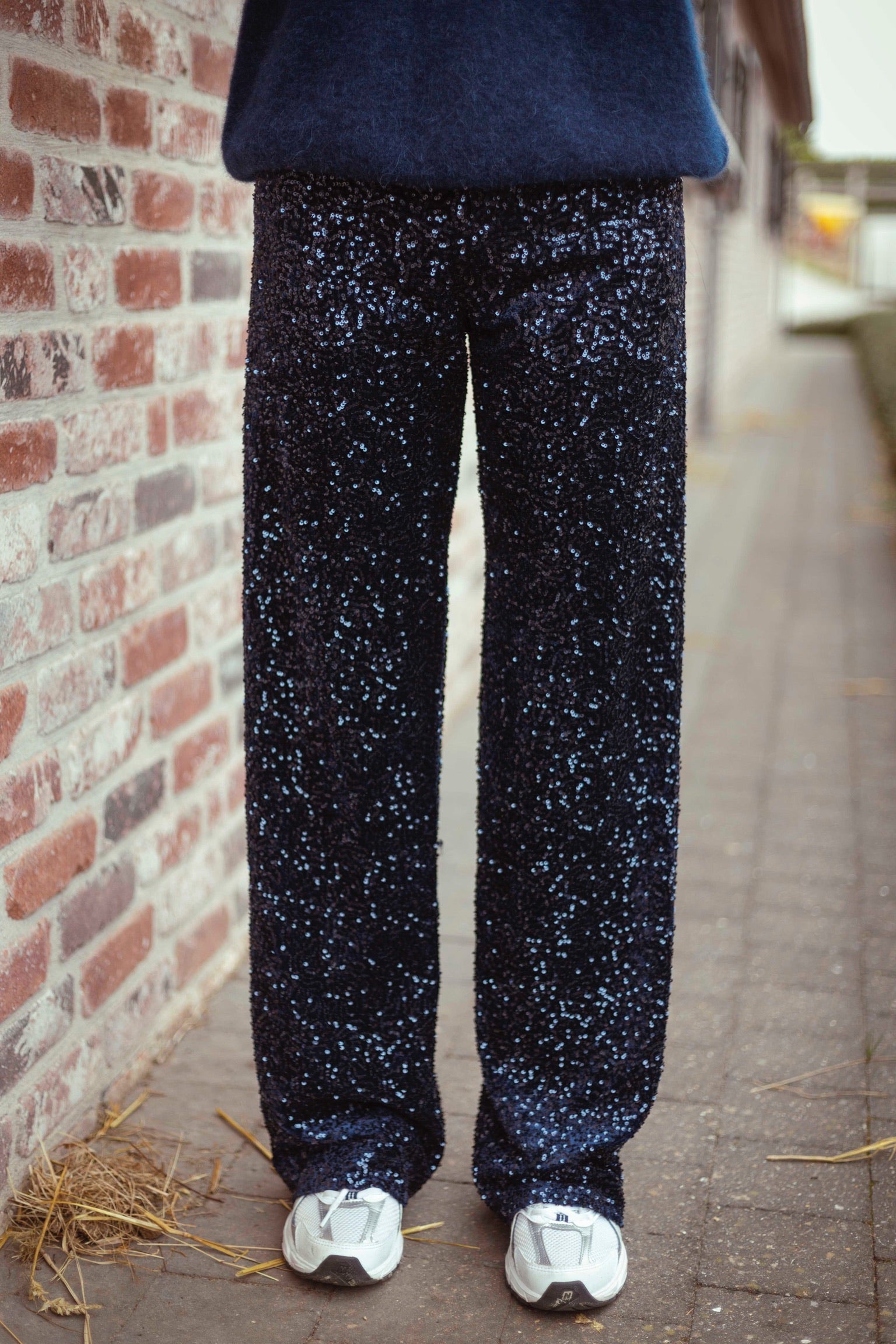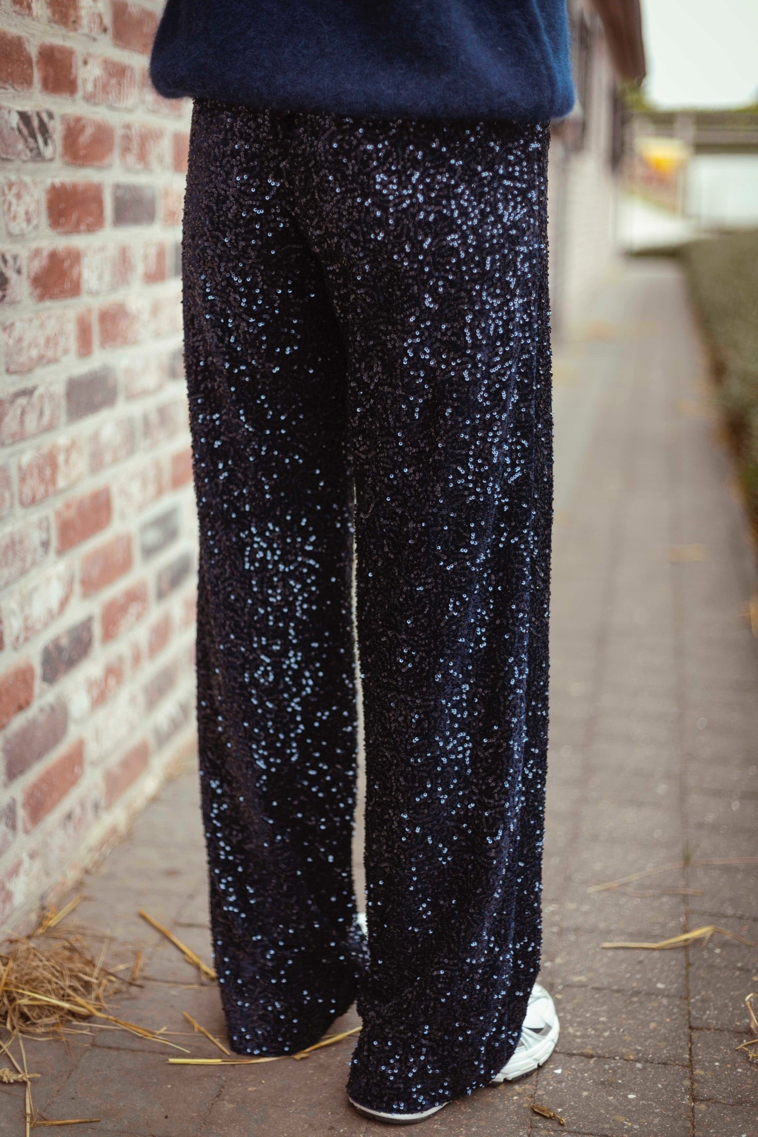 Deze donkerblauwe broek met pailletten brengt een feestelijke sfeer in je herfstgarderobe. Perfect om een simpele trui of blouse direct een extra glans te geven bij bijzondere gelegenheden.