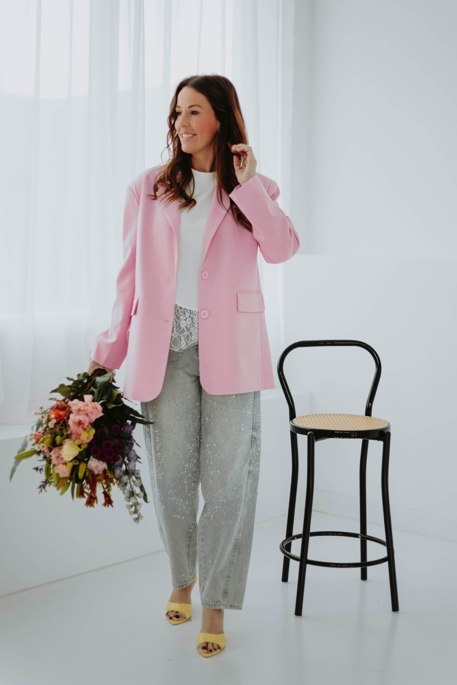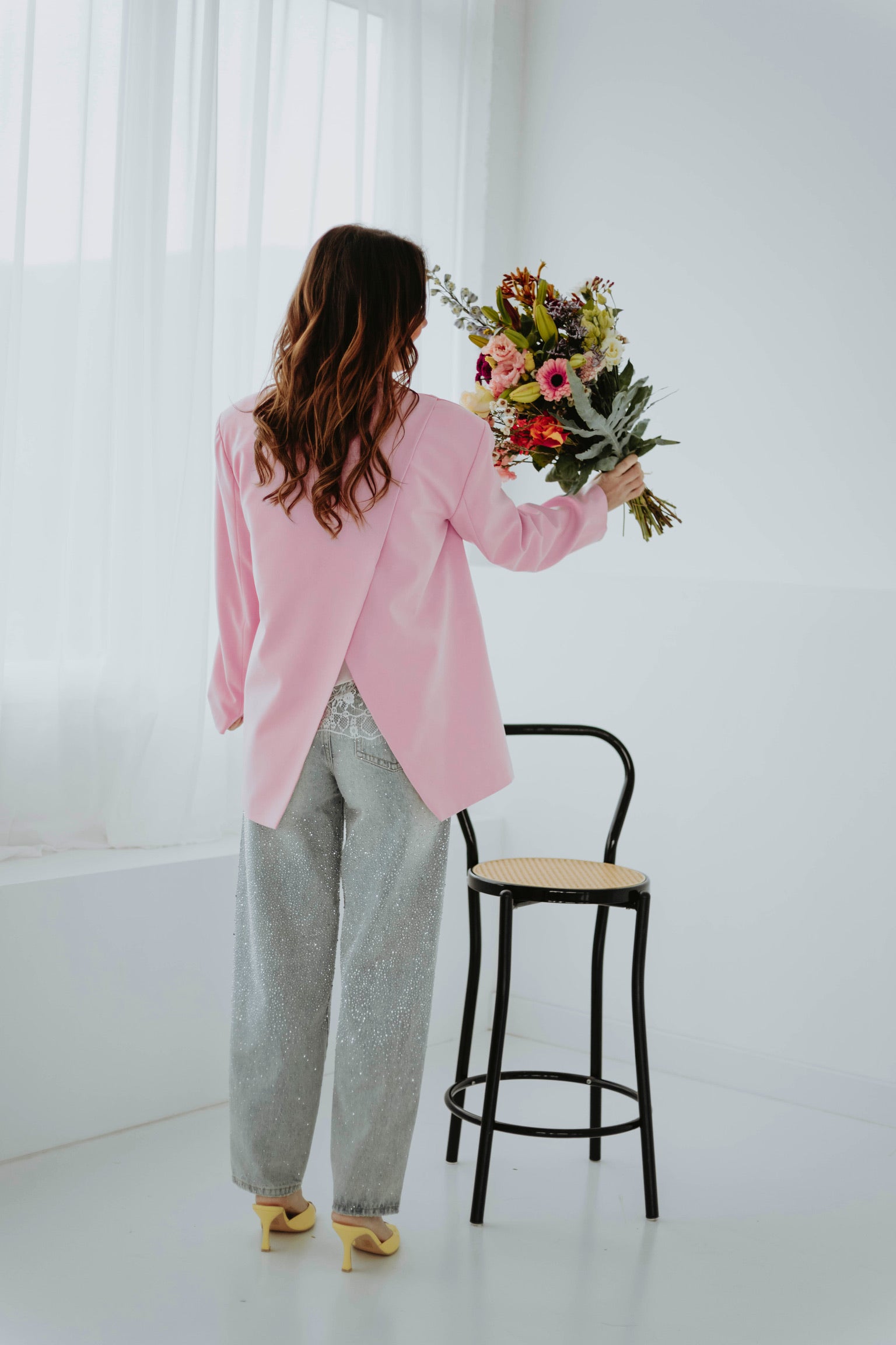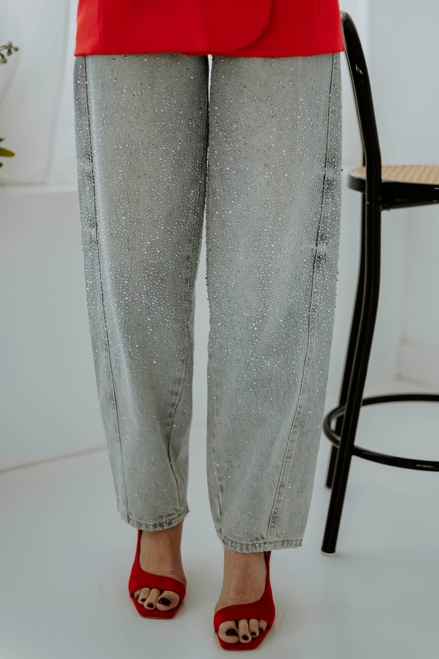 Deze jeans combineert een speelse ballonvorm met fonkelende rhinestones voor een opvallende en feestelijke uitstraling. De lichte blauwe tint geeft een frisse touch, waardoor elke outfit meteen sprankelt en stijlvol oogt.