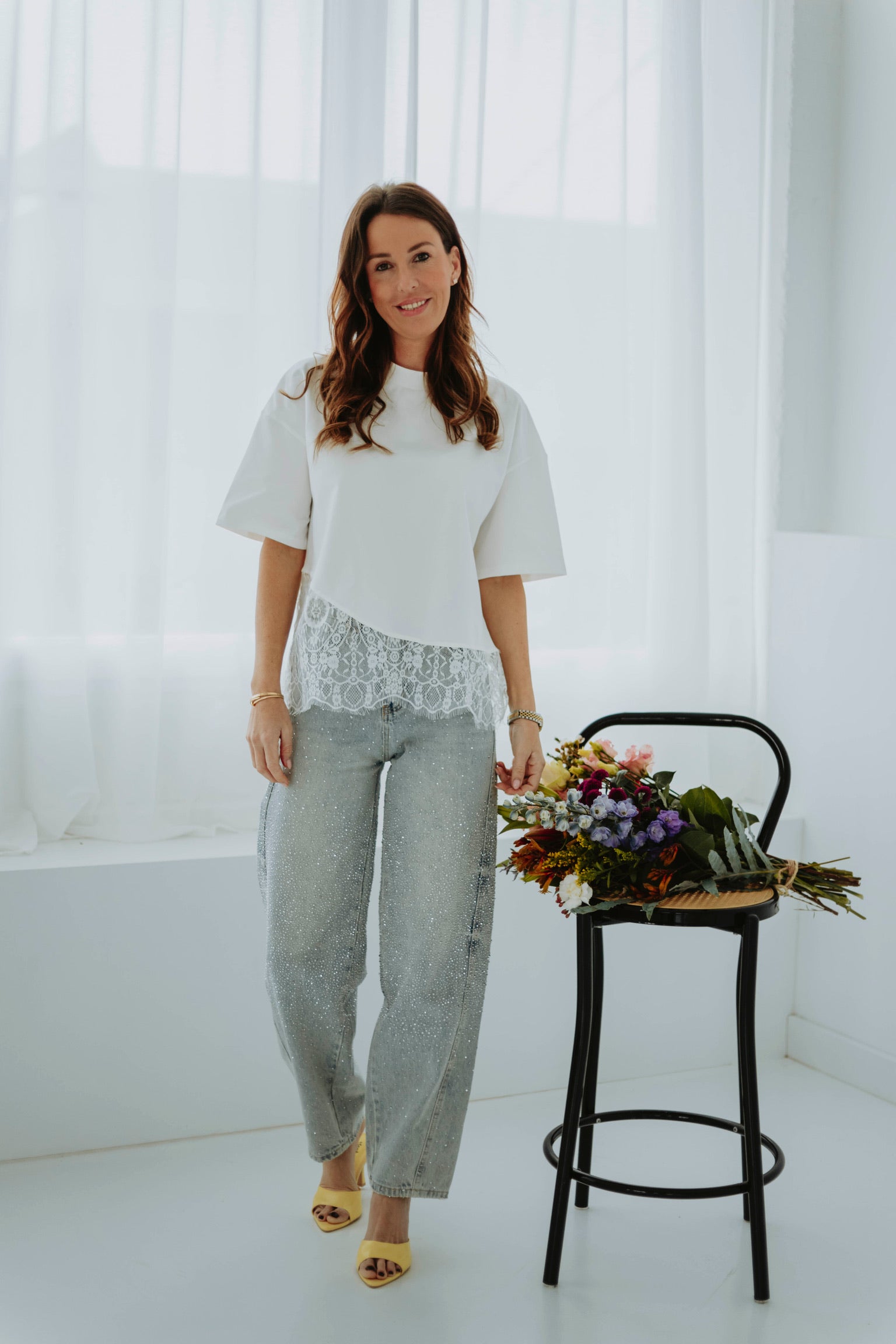 Anoushka is 1m70 groot en draagt maat XS. Anoushka draagt steeds de kleinste maat.