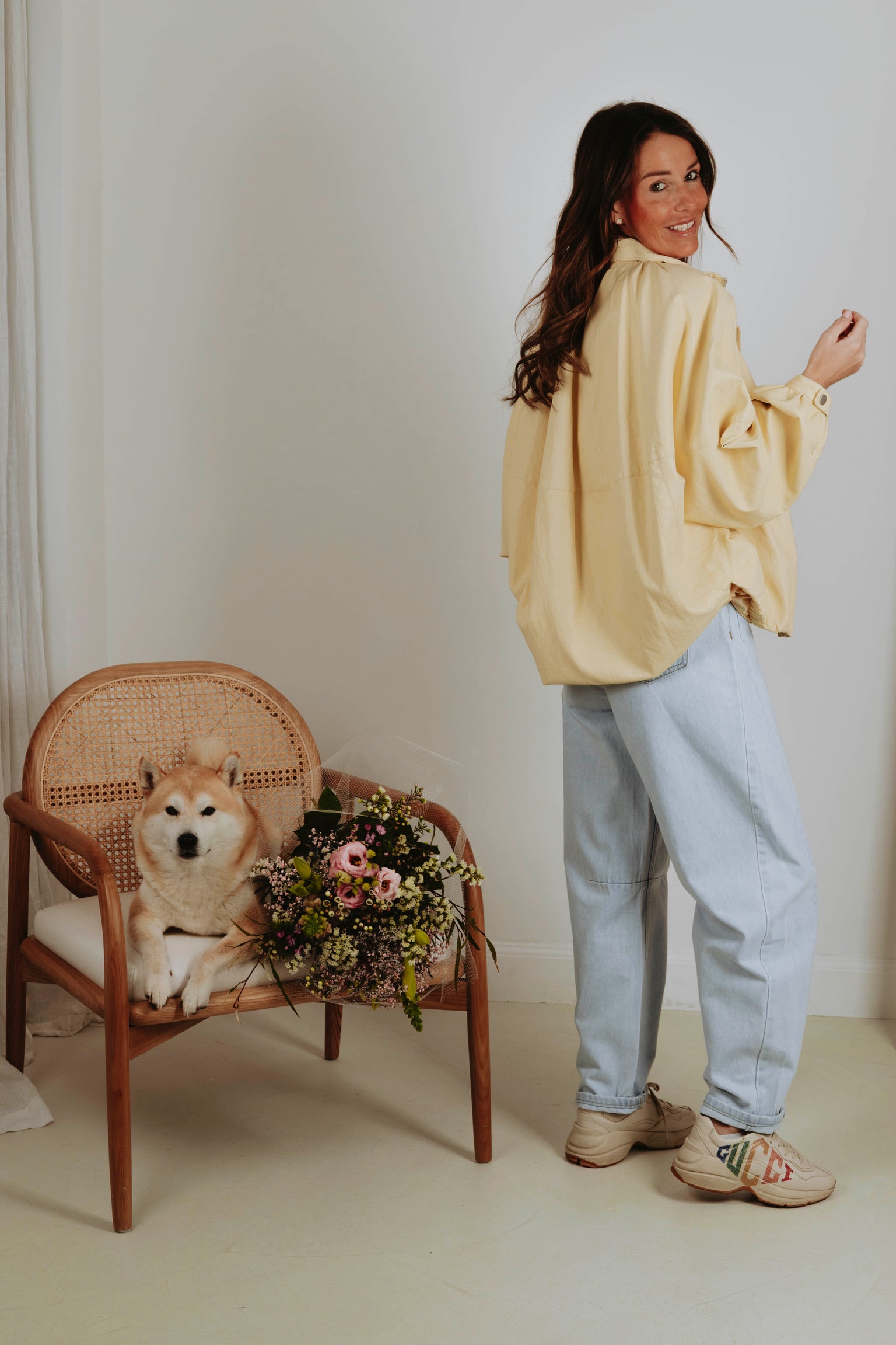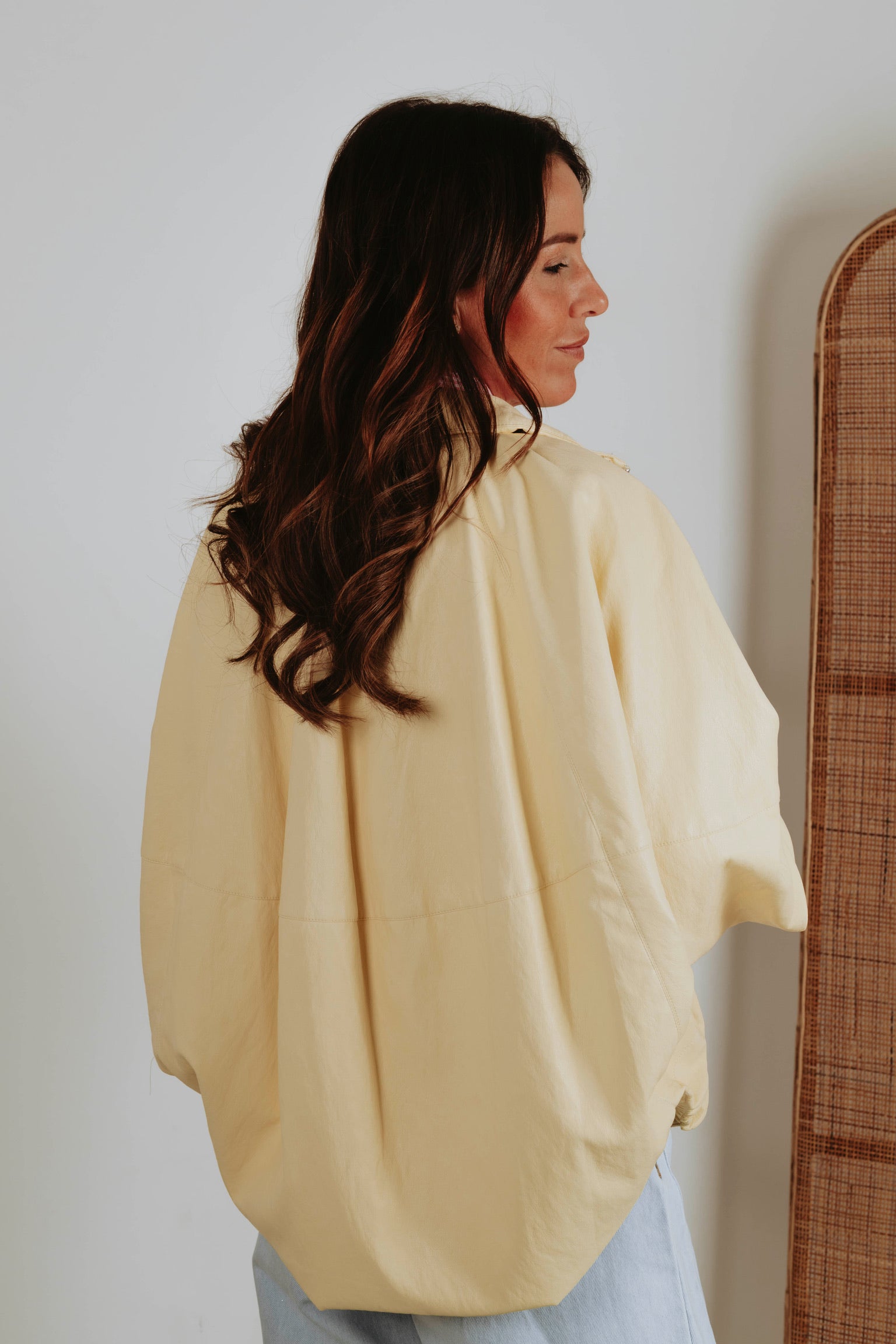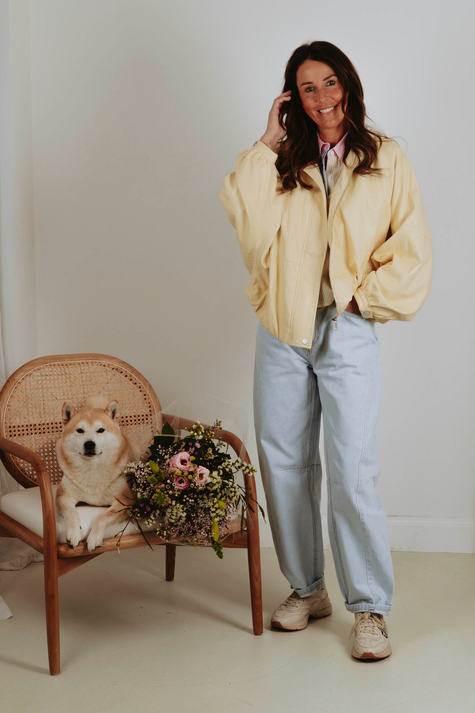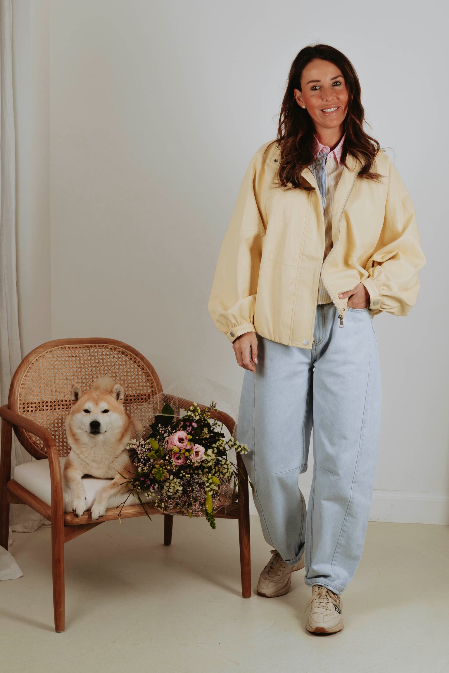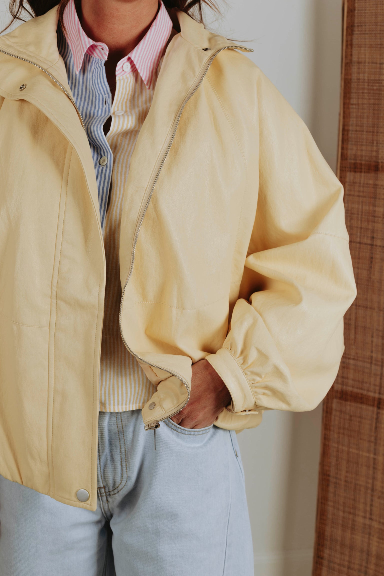 Een zonnige, lichtgele jas in soepel leer die stoer en vrouwelijk perfect samenbrengt. De zachte tint geeft een frisse, voorjaarsachtige energie en maakt elke outfit speels en stijlvol.