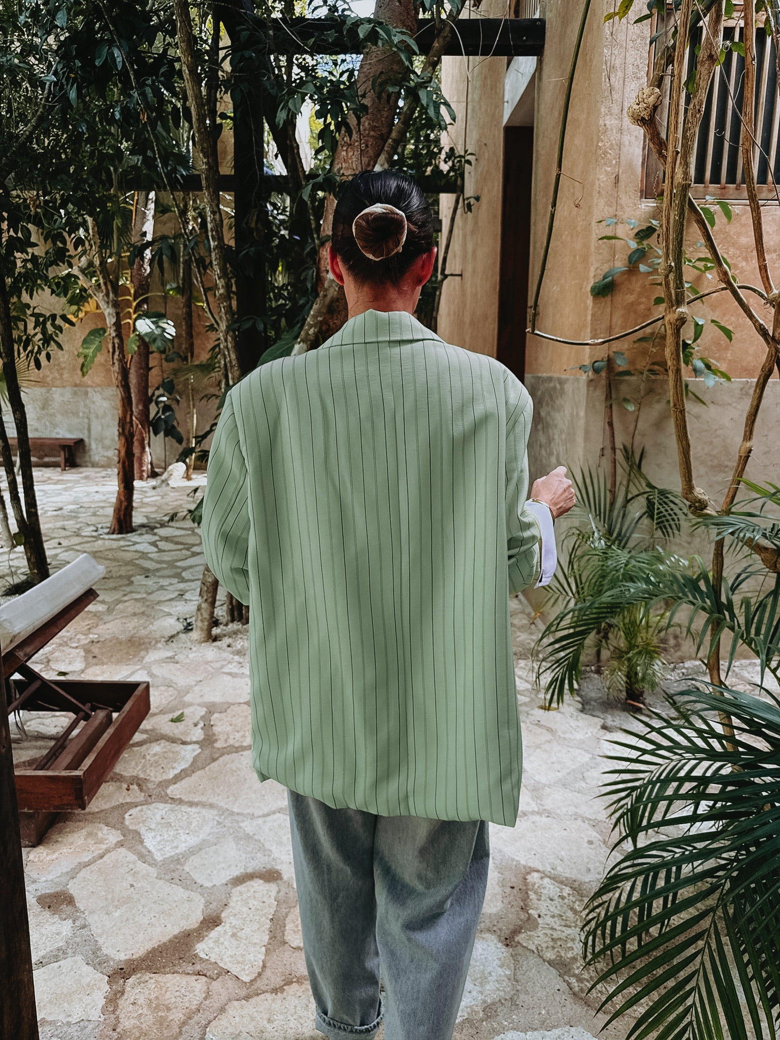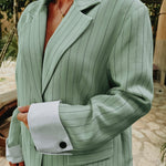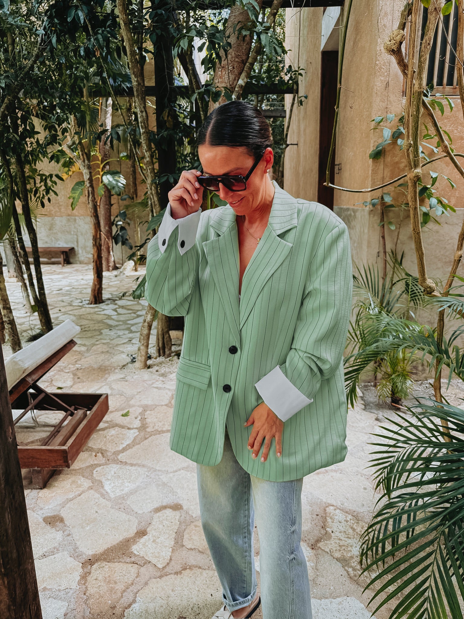 Muntgroene blazer met subtiele zwarte strepen en witte omslagen aan de polsen voor een frisse, stijlvolle touch. Perfect om zomerse outfits een elegante en speelse finishing touch te geven.