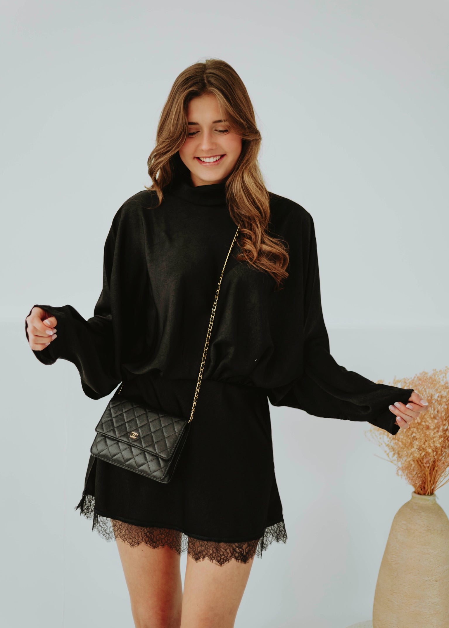 LIGHT UP THE SEASON BLACK ASYMMETRIC SATIN DRESS